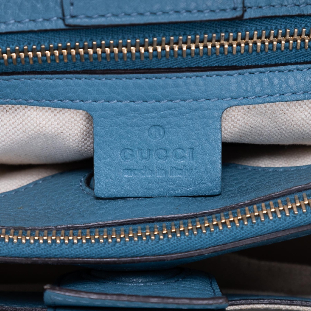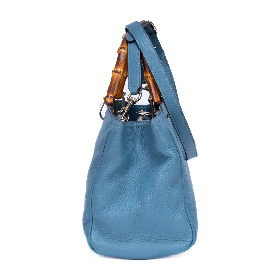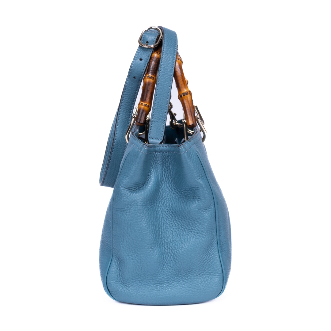A vintage Gucci blue calf leather Bamboo Tote bag with a certificate of authenticity, Approximately 20cm height, 33cm width.