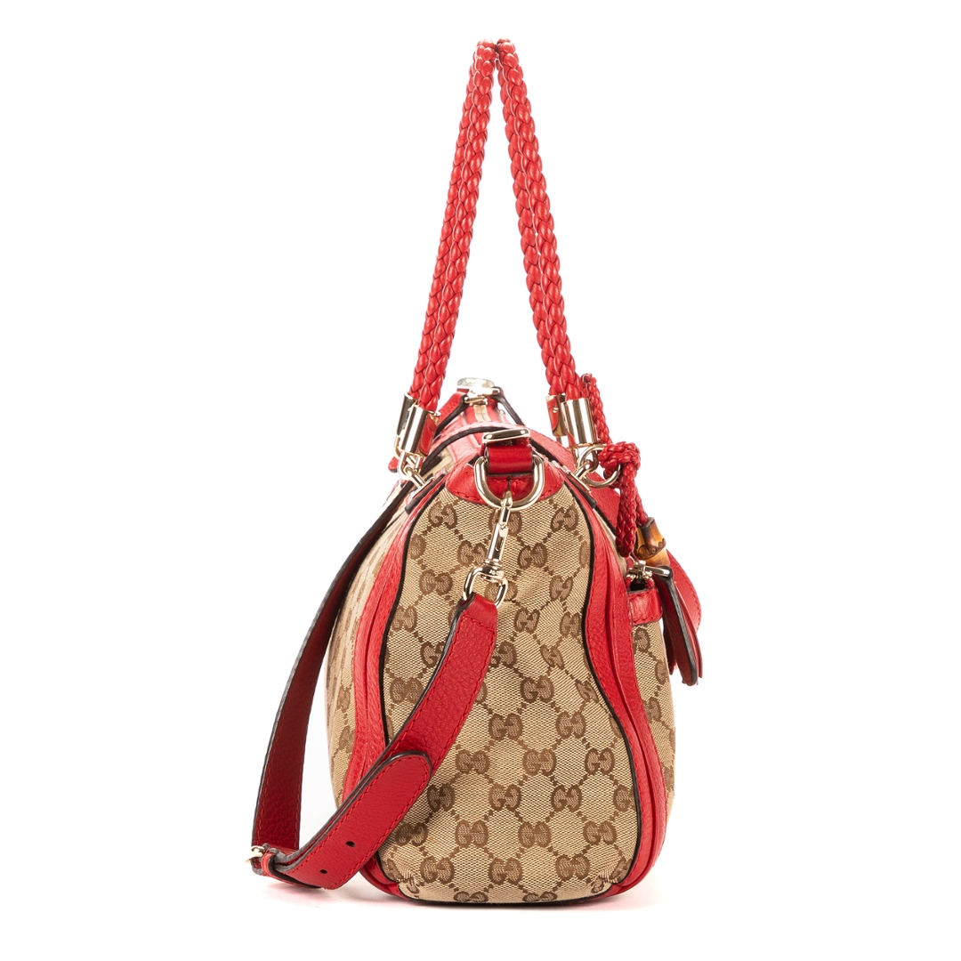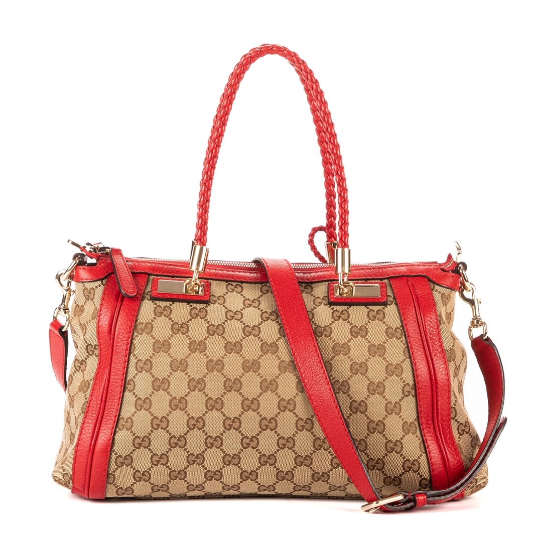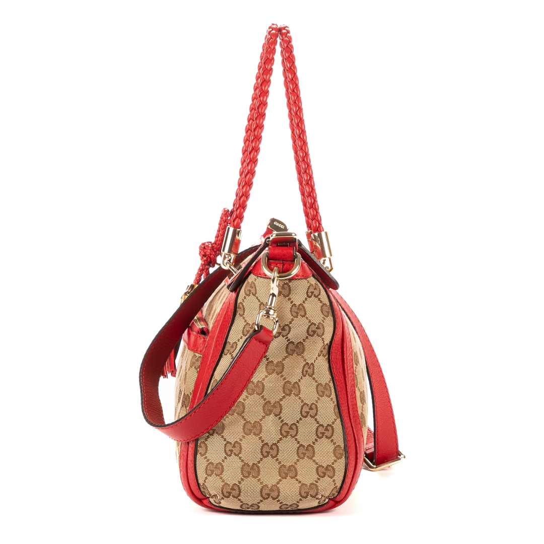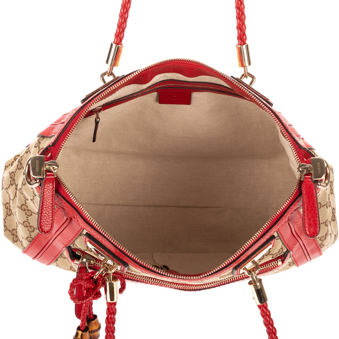 A vintage Gucci beige and red canvas Bella Satchel bag, showcasing the house’s iconic GG monogram set against a classic neutral canvas. The design is elevated by bold red leather trim, creating a striking contrast that enhances its recognisable aesthetic. Finished with gold-tone hardware and signature tassel detailing with bamboo accents, this piece reflects Gucci’s distinctive blend of heritage and modern style.