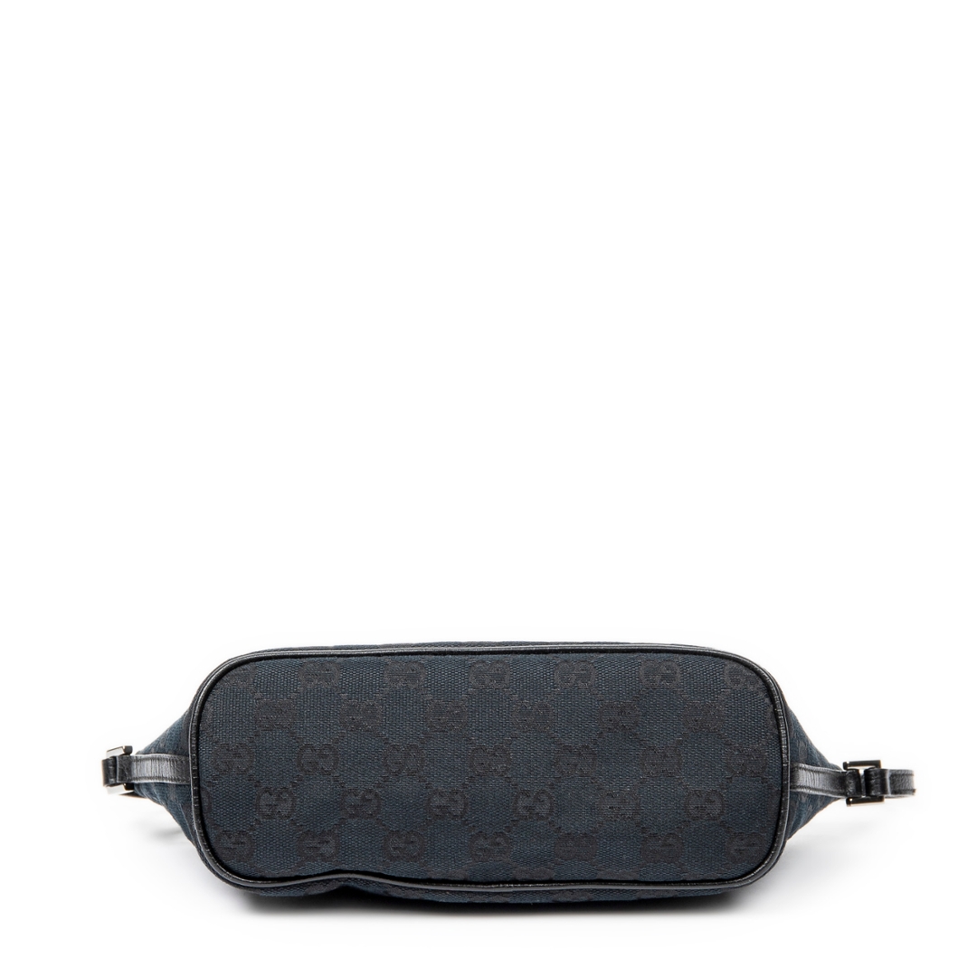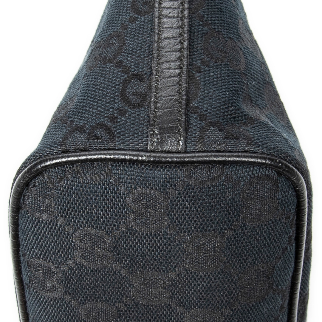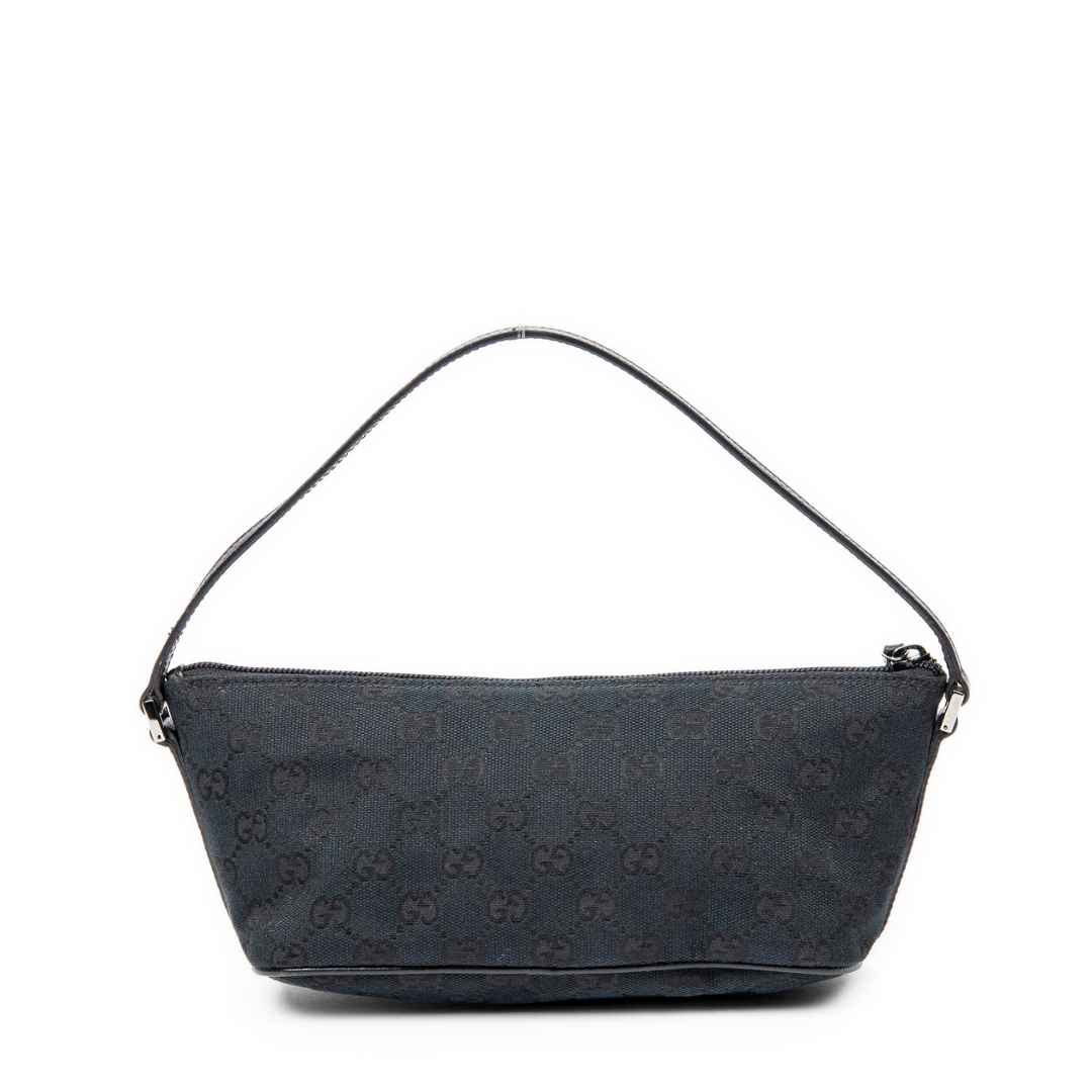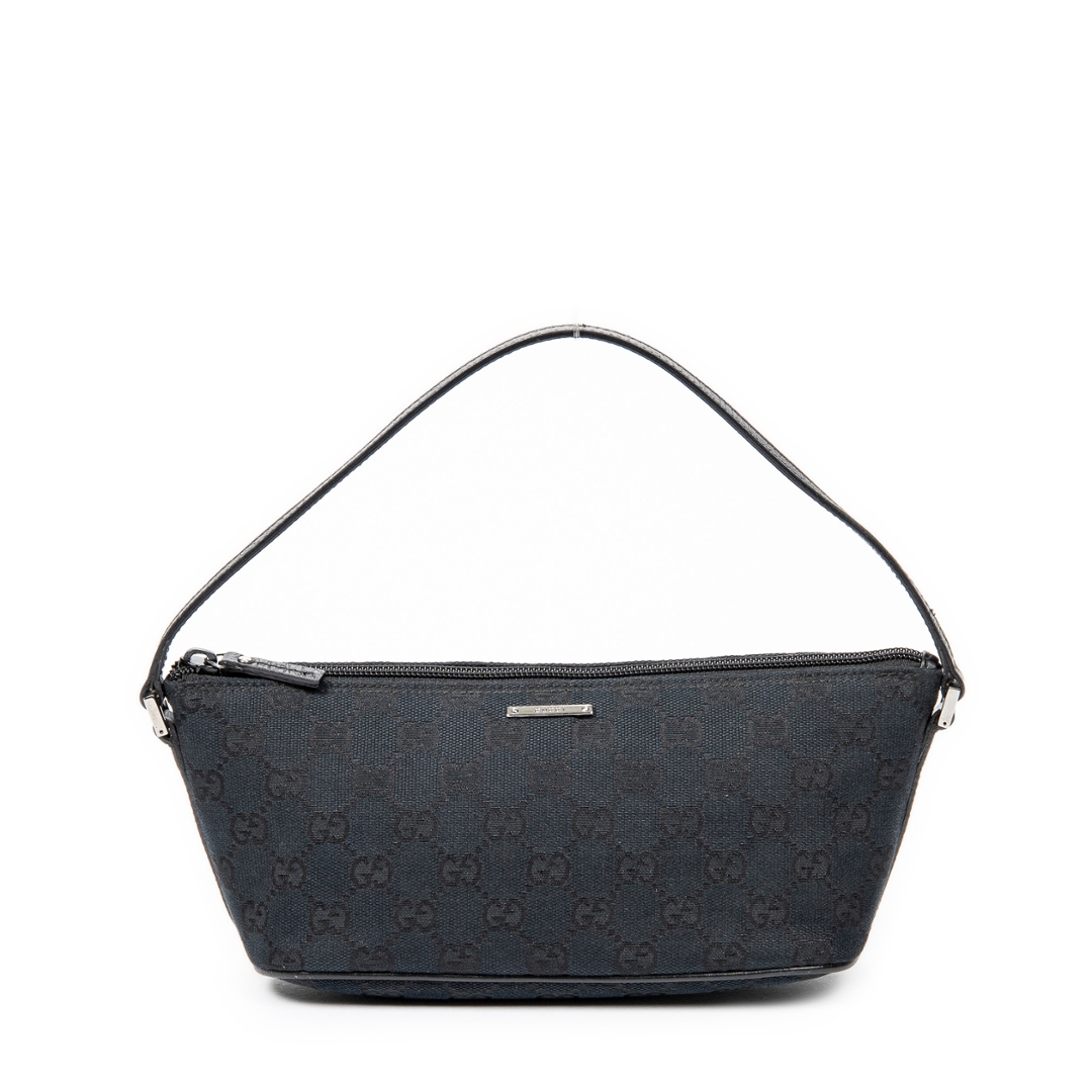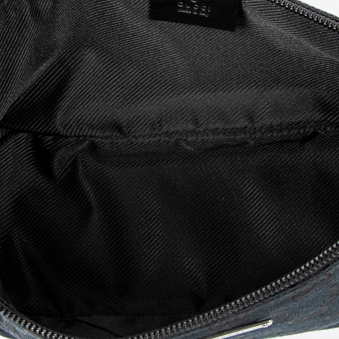 A vintage Gucci black canvas Boat Pochette bag, featuring the house’s iconic GG monogram woven subtly throughout the fabric. The streamlined silhouette is complemented by black leather trim, creating a clean and understated contrast that enhances its timeless appeal. Finished with a minimal Gucci plaque to the front, the design remains refined and effortlessly versatile.