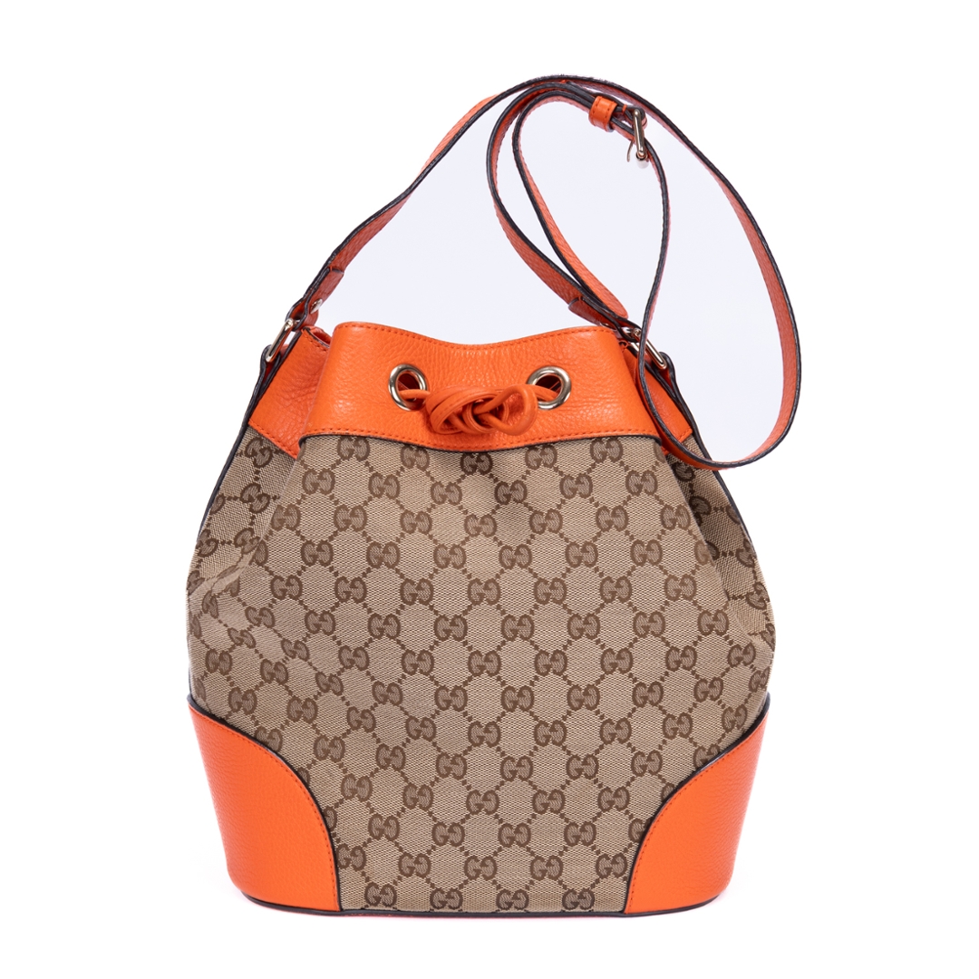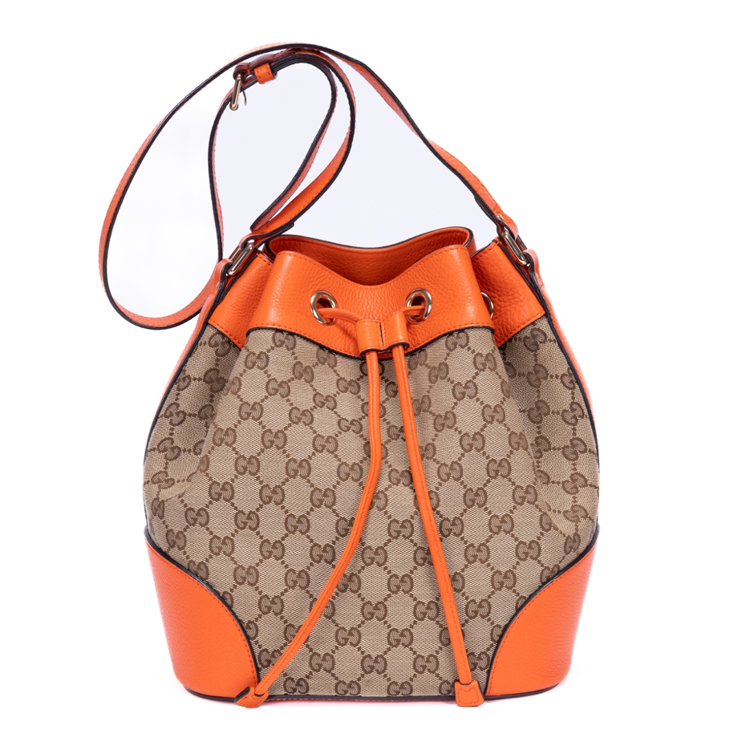 A vintage Gucci beige/orange calf leather Bucket Trim bag with a certificate of authenticity, Approximately 28cm height, 24cm width.