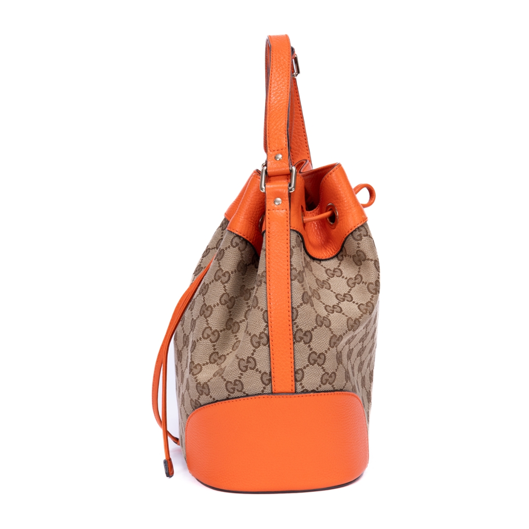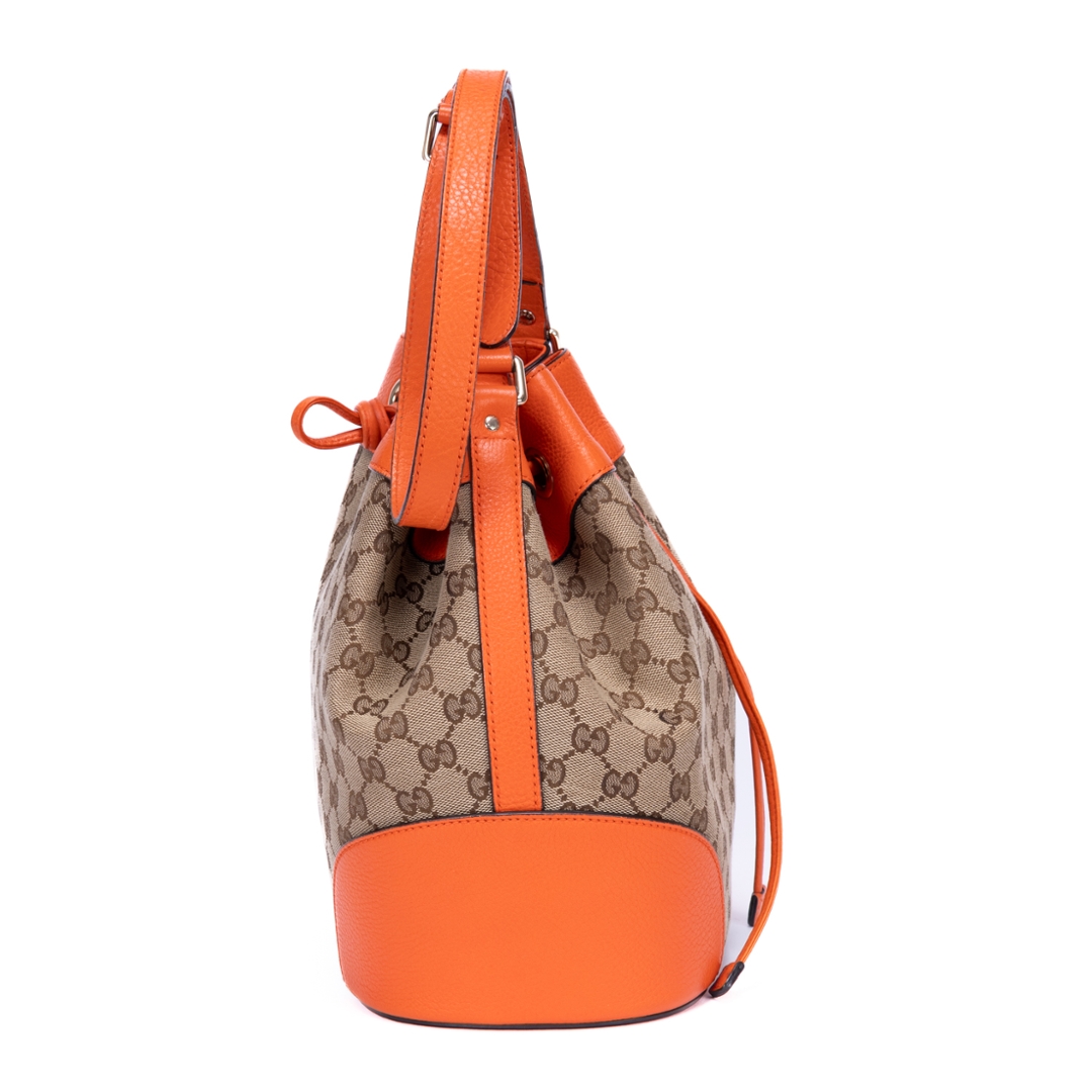A vintage Gucci beige and orange calf leather Bucket Trim bag, showcasing the house’s iconic GG monogram canvas paired with bold orange leather accents. The softly structured bucket silhouette is enhanced by smooth leather trim and clean lines, creating a striking contrast that highlights its signature Gucci aesthetic. Finished with subtle hardware detailing, the design balances heritage style with a modern edge.