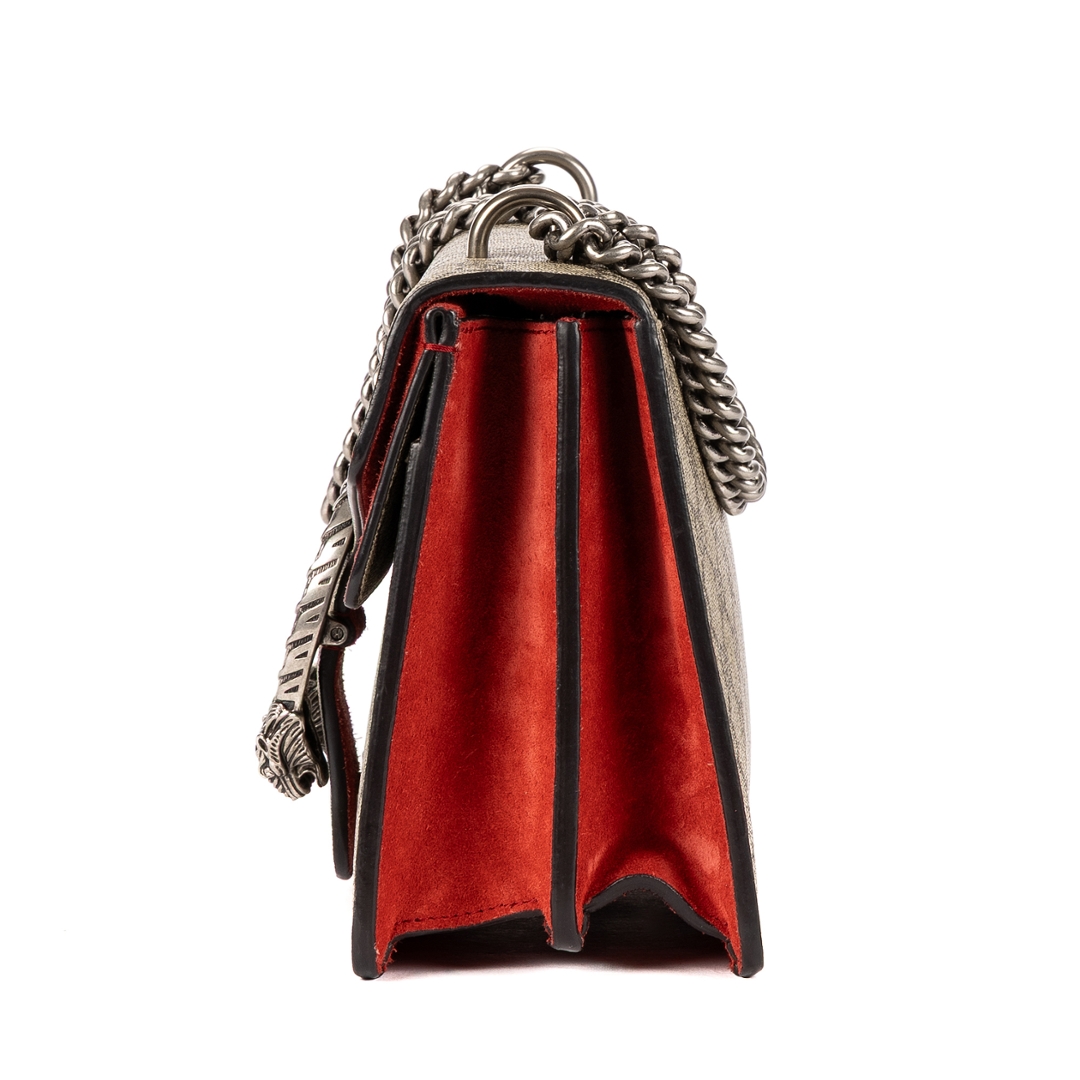 A vintage Gucci beige and red coated canvas Dionysus bag, featuring the house’s iconic GG Supreme monogram in a timeless neutral palette. The structured silhouette is enhanced by rich red suede panels, creating a bold contrast that defines its distinctive look. At the centre, the signature tiger head spur closure in aged silver-tone hardware delivers an instantly recognisable and striking focal point.