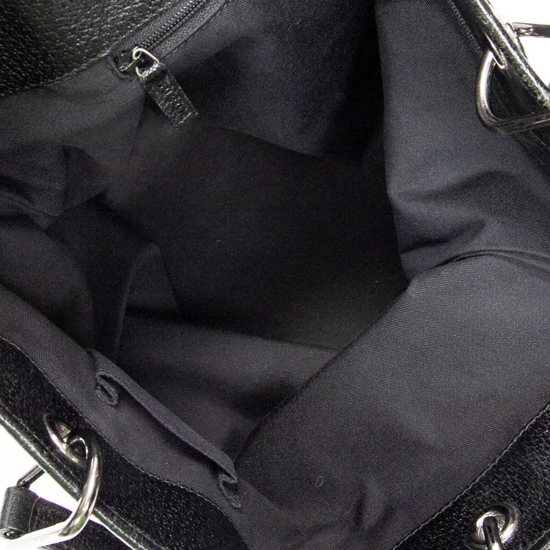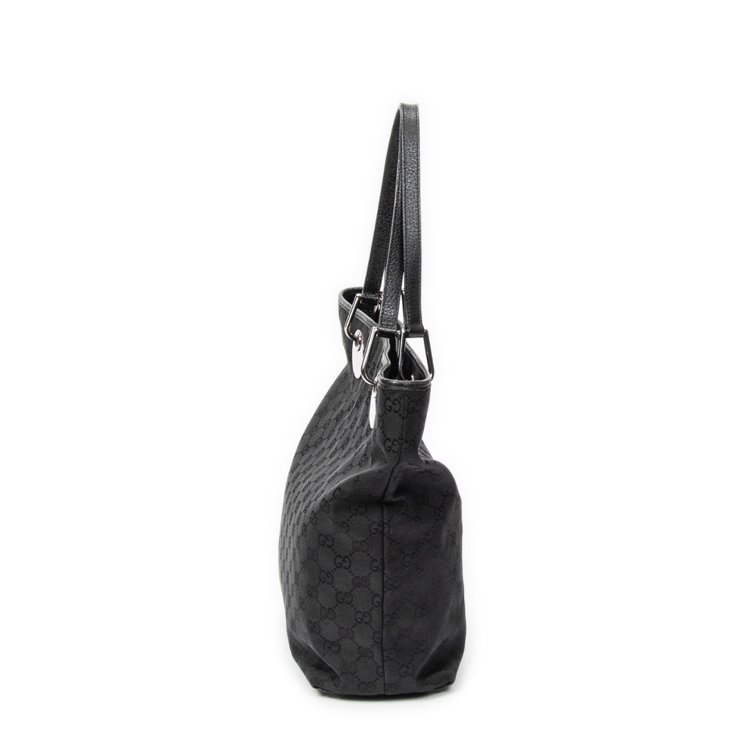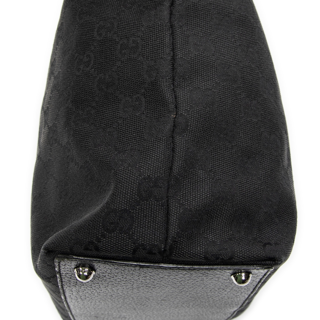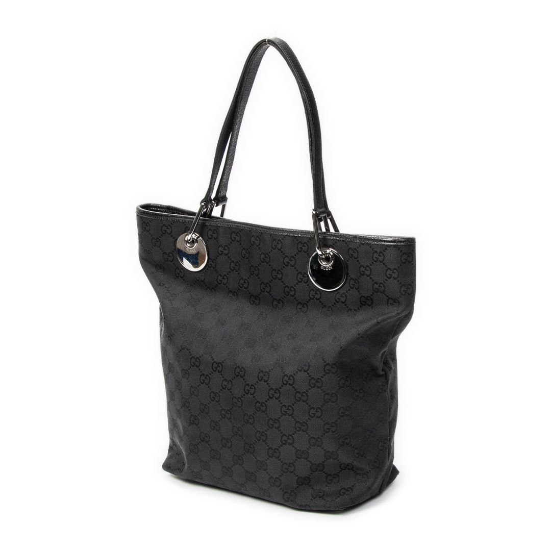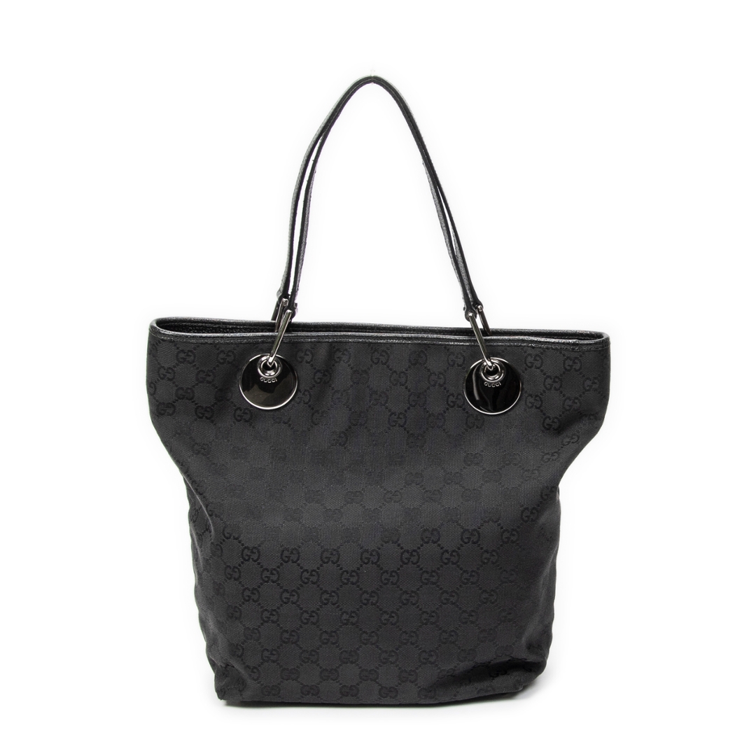 A vintage Gucci black canvas Eclipse Tall Tote bag, featuring the house’s signature GG monogram subtly woven throughout the fabric. The tall, structured silhouette is complemented by tonal leather handles and sleek silver-tone hardware, including the distinctive circular Gucci accents at the handle base. The understated all-black design delivers a refined and effortlessly versatile look.