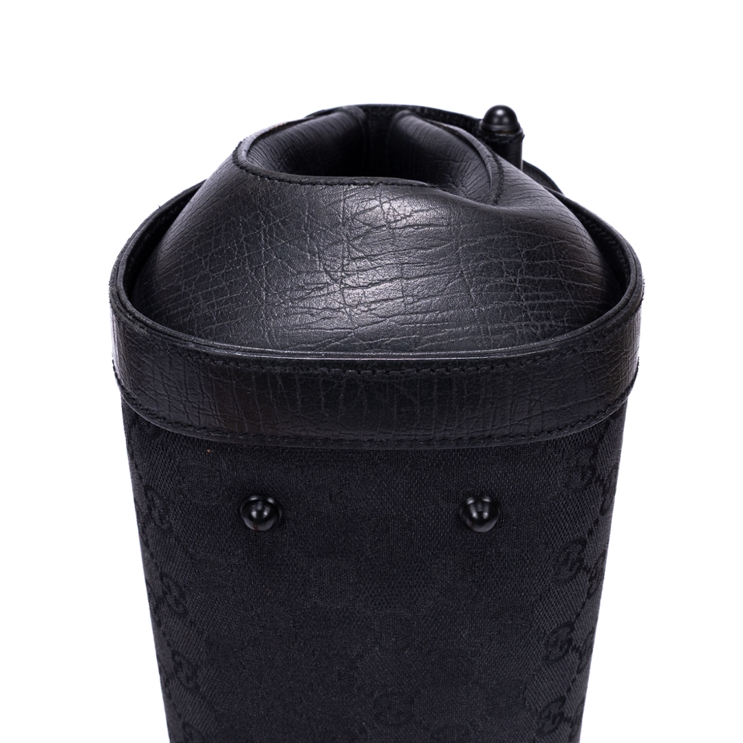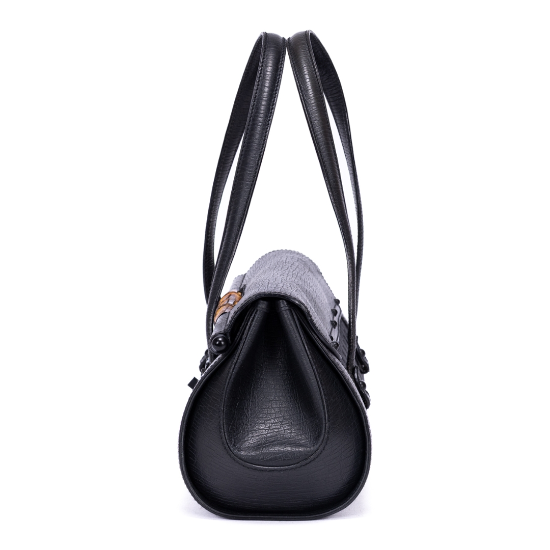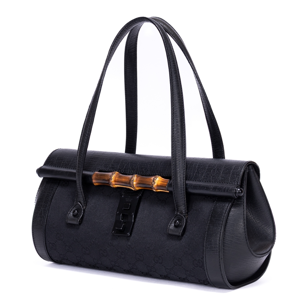 A vintage Gucci black calf leather GG Bamboo Bullet bag with a certificate of authenticity, Approximately 18cm height, 32cm width.