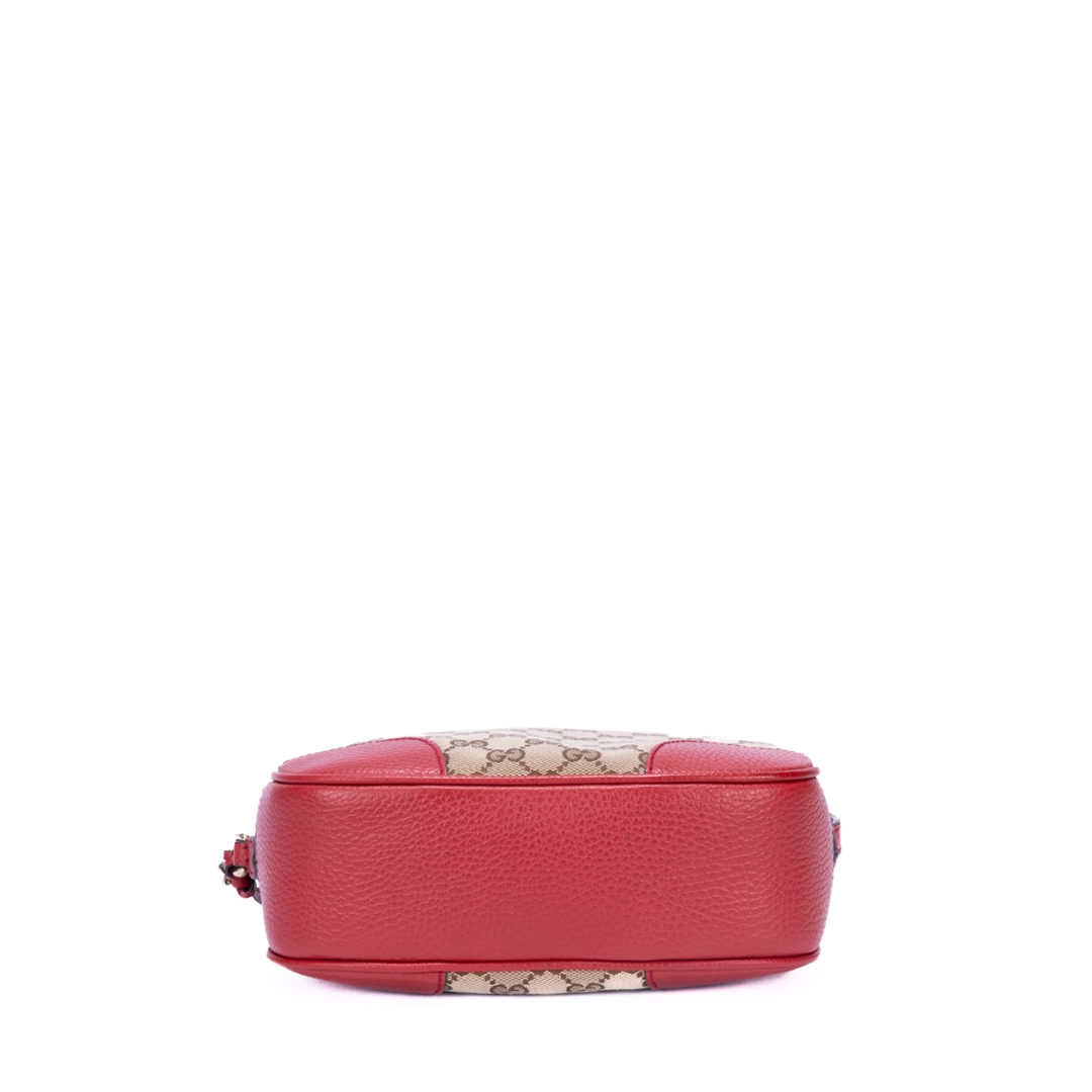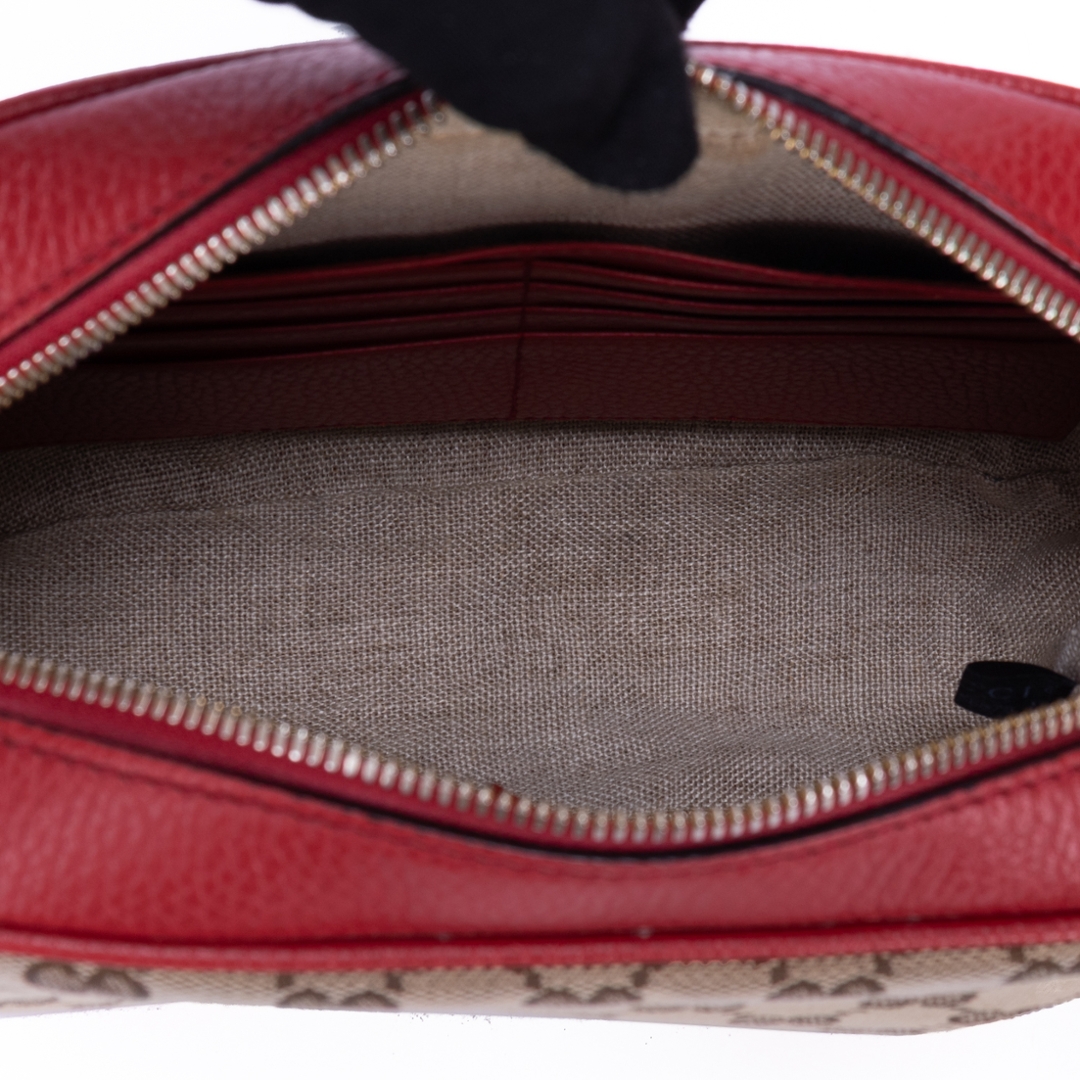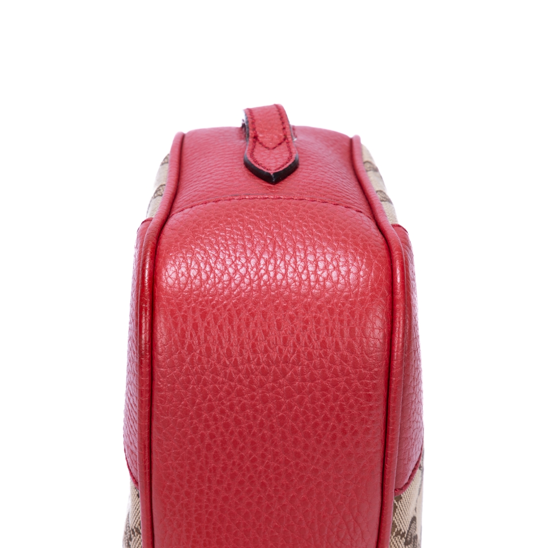 A vintage Gucci red/beige calf leather GG Canvas Bree Camera bag with a certificate of authenticity, Approximately 16cm height, 21cm width.