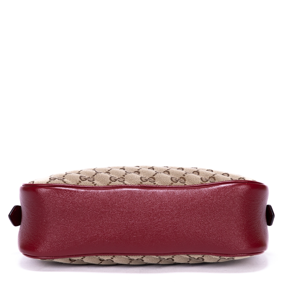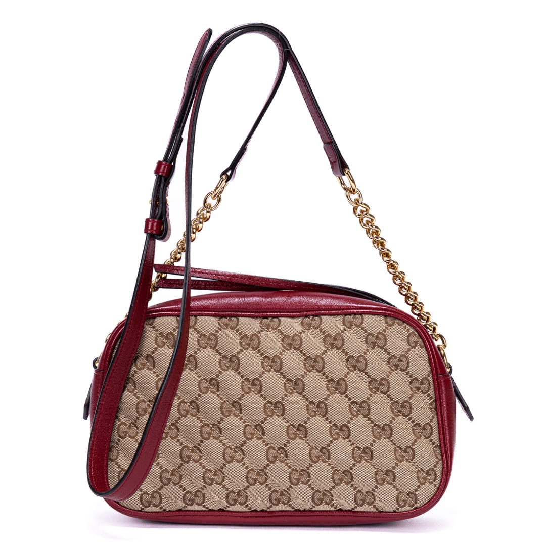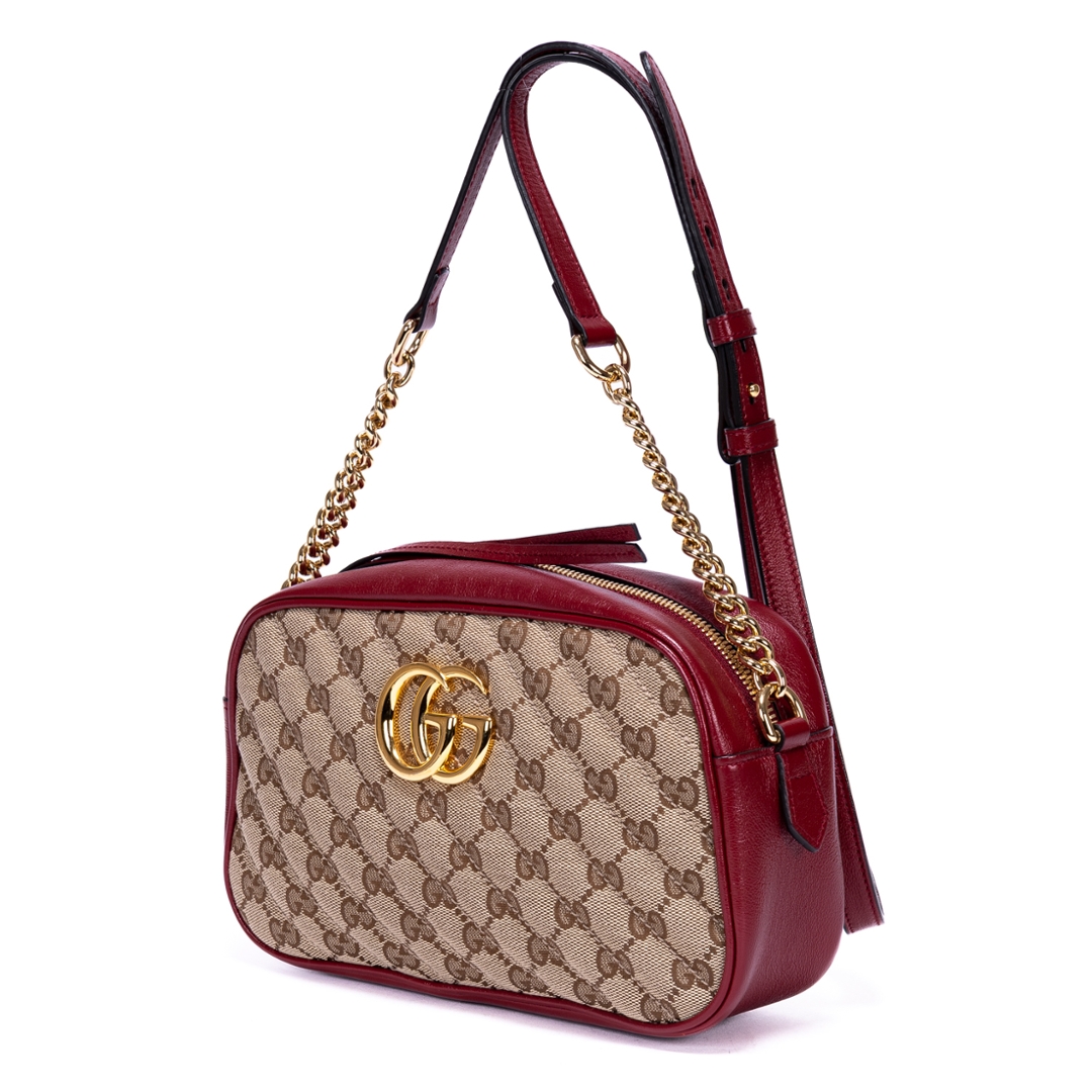 A vintage Gucci beige/red calf leather GG Marmont bag with a certificate of authenticity, Approximately 15cm height, 25cm width.
