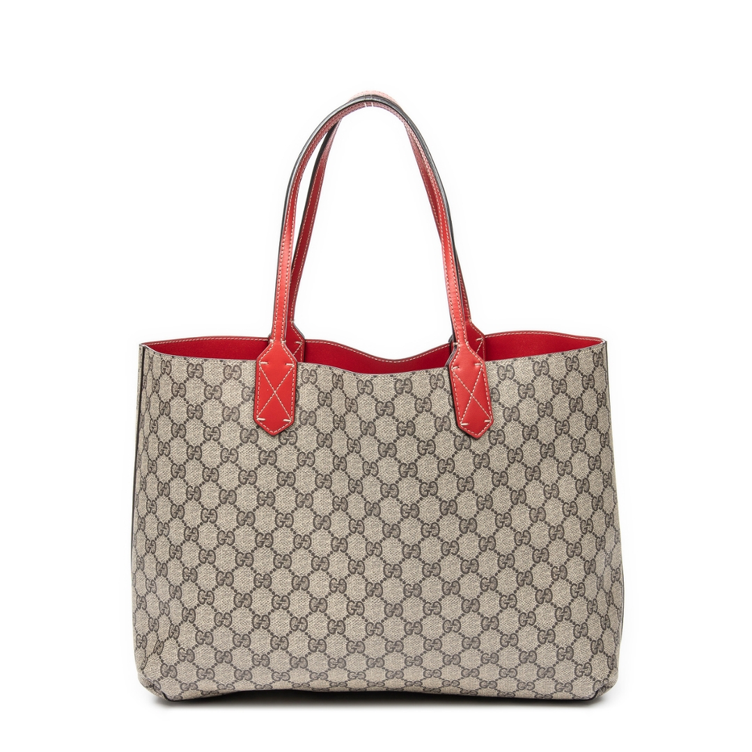 A vintage Gucci beige/red coated canvas GG Reversible Tote bag with a certificate of authenticity. Approximately 29cm height, 35cm width.