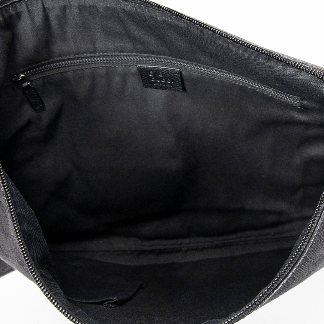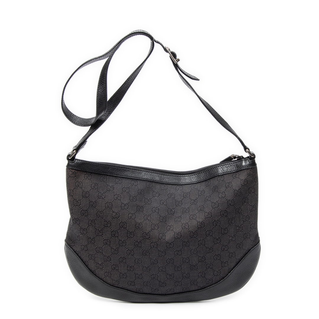 A vintage Gucci black canvas Half Moon Messenger bag, featuring the house’s signature GG monogram subtly woven throughout the fabric. The curved half-moon silhouette is complemented by tonal leather trim, creating a sleek and contemporary profile while maintaining Gucci’s classic aesthetic. Clean lines and understated detailing give the piece a refined and versatile finish.