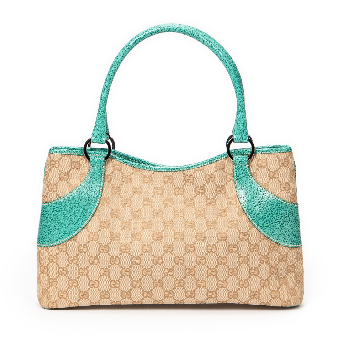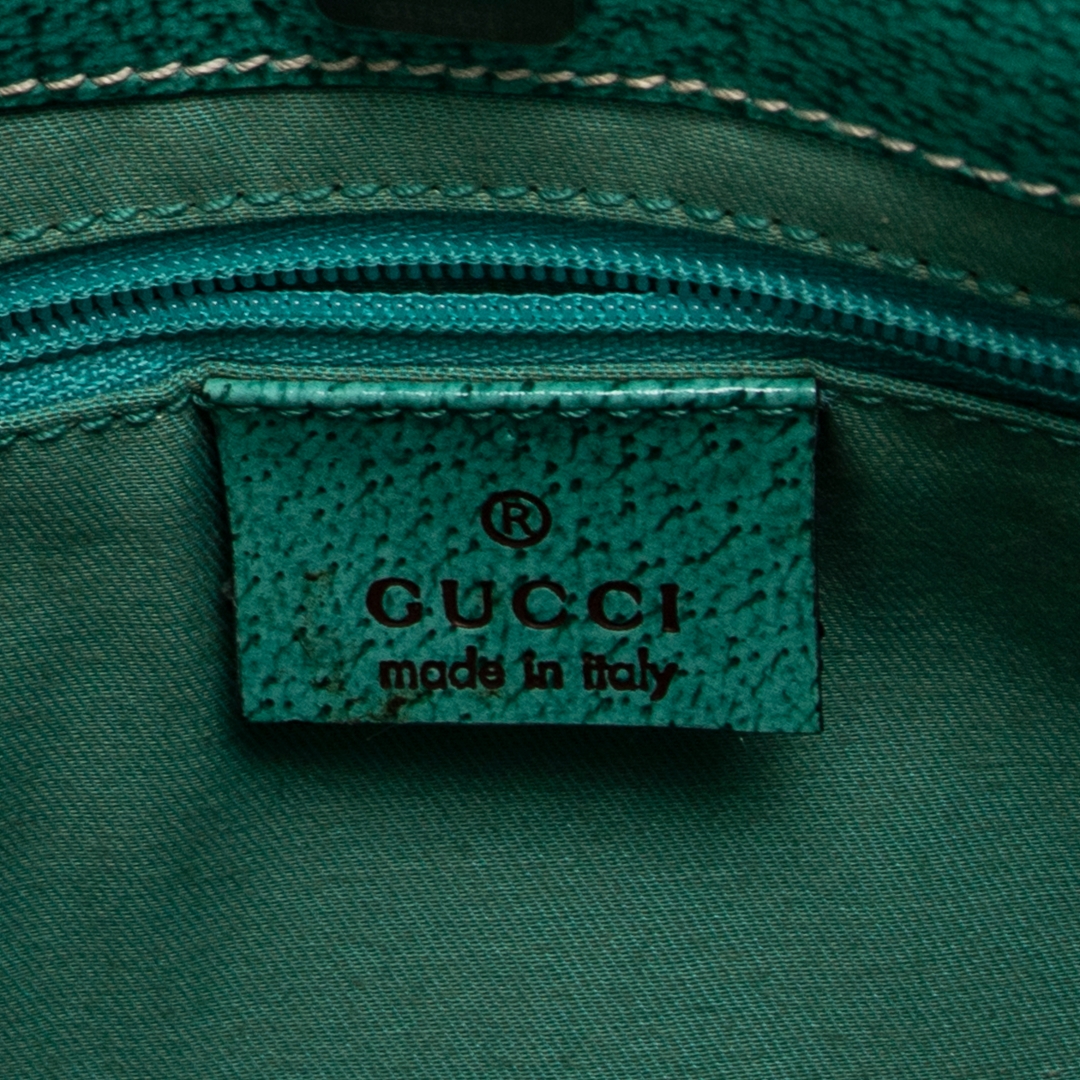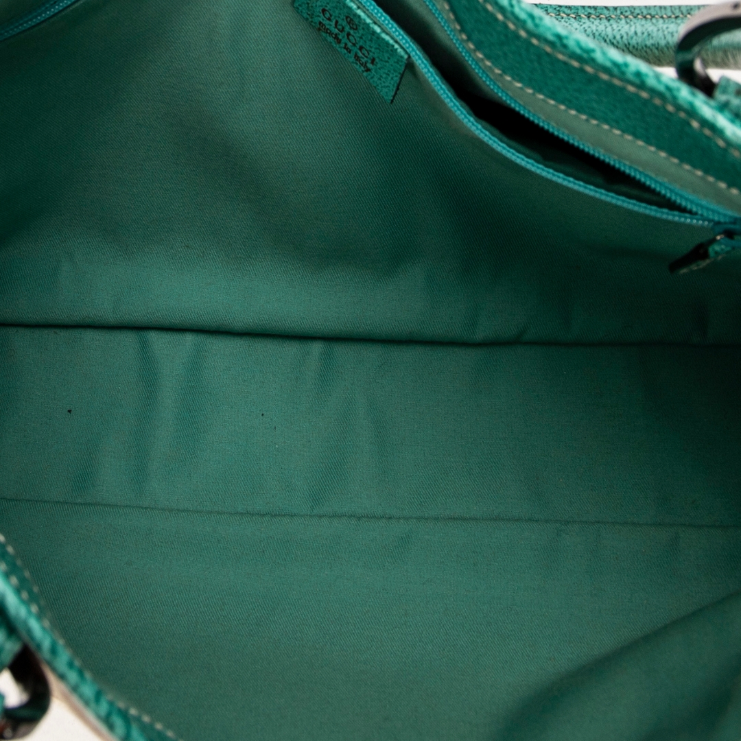 A vintage Gucci beige/turquoise canvas Horizontal Jacquard Tote bag with a certificate of authenticity, Approximately 21cm height, 36cm width.