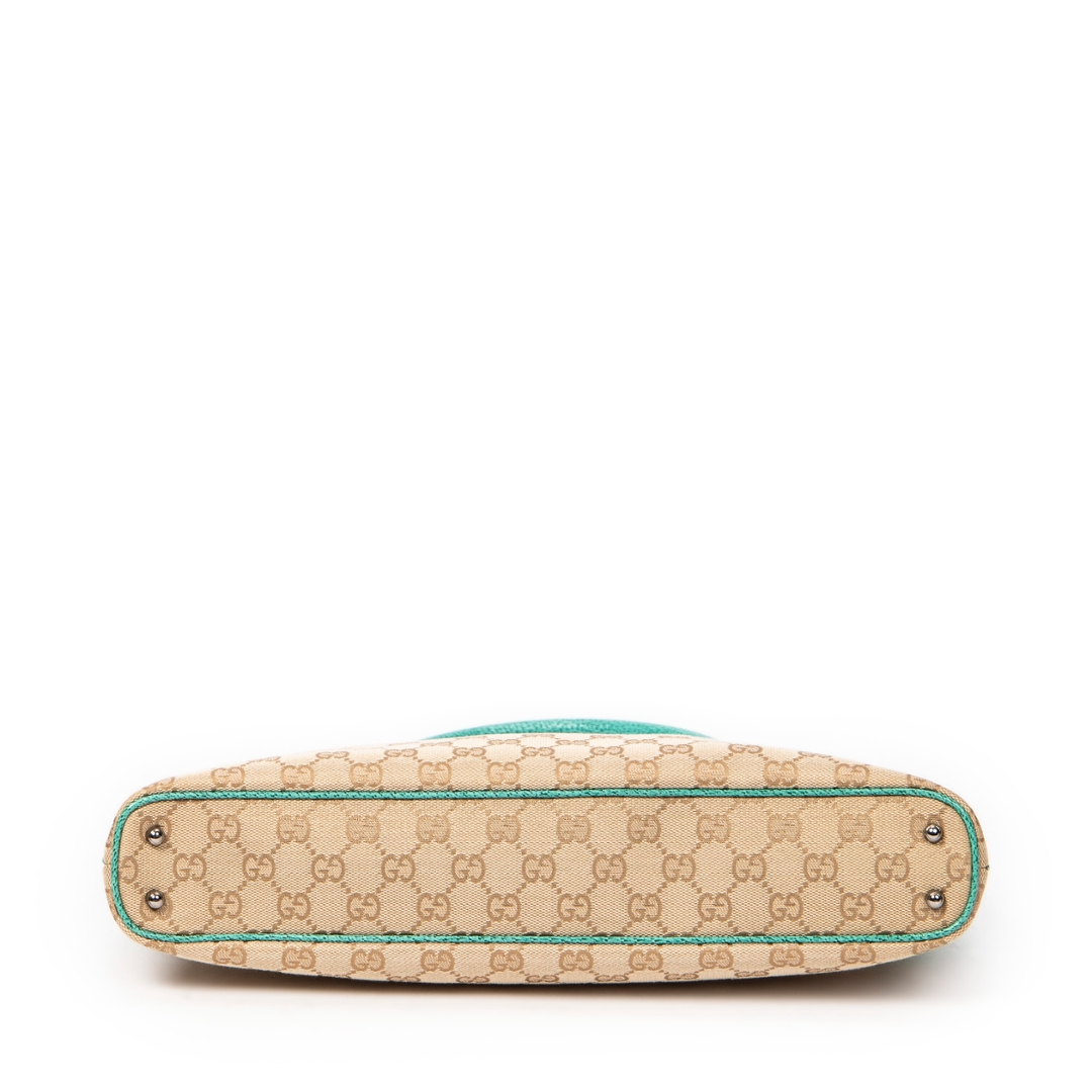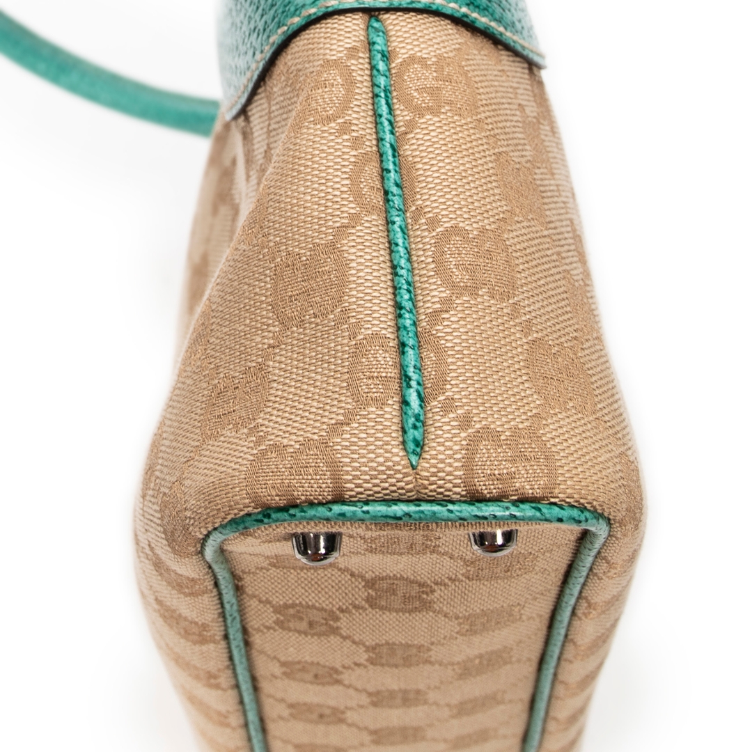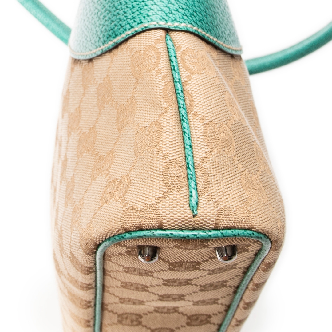 A vintage Gucci beige/turquoise canvas Horizontal Jacquard Tote bag with a certificate of authenticity, Approximately 21cm height, 36cm width.