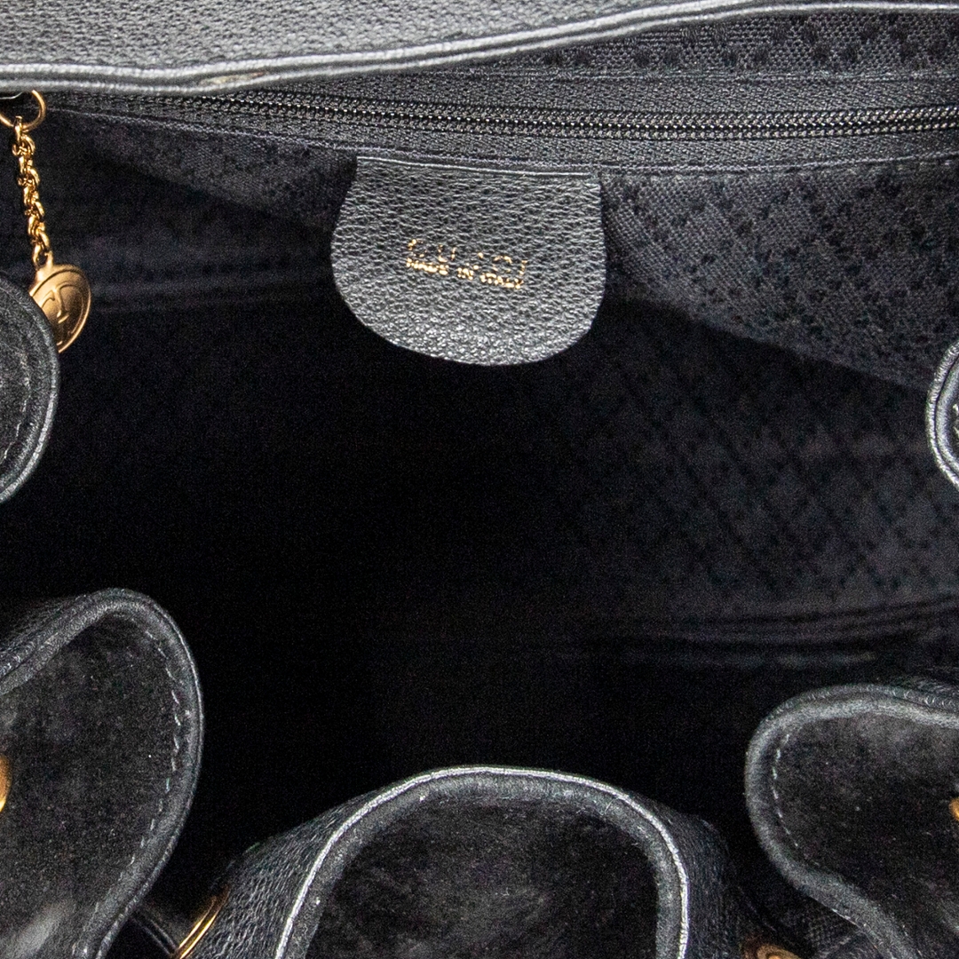 A vintage Gucci black calf leather Large Bamboo Backpack bag, combining utilitarian design with one of the house’s most iconic signatures. Crafted in rich black leather with a soft, structured silhouette, it is elevated by the distinctive bamboo top handle and matching bamboo toggle closures, reflecting Gucci’s heritage craftsmanship and timeless appeal.