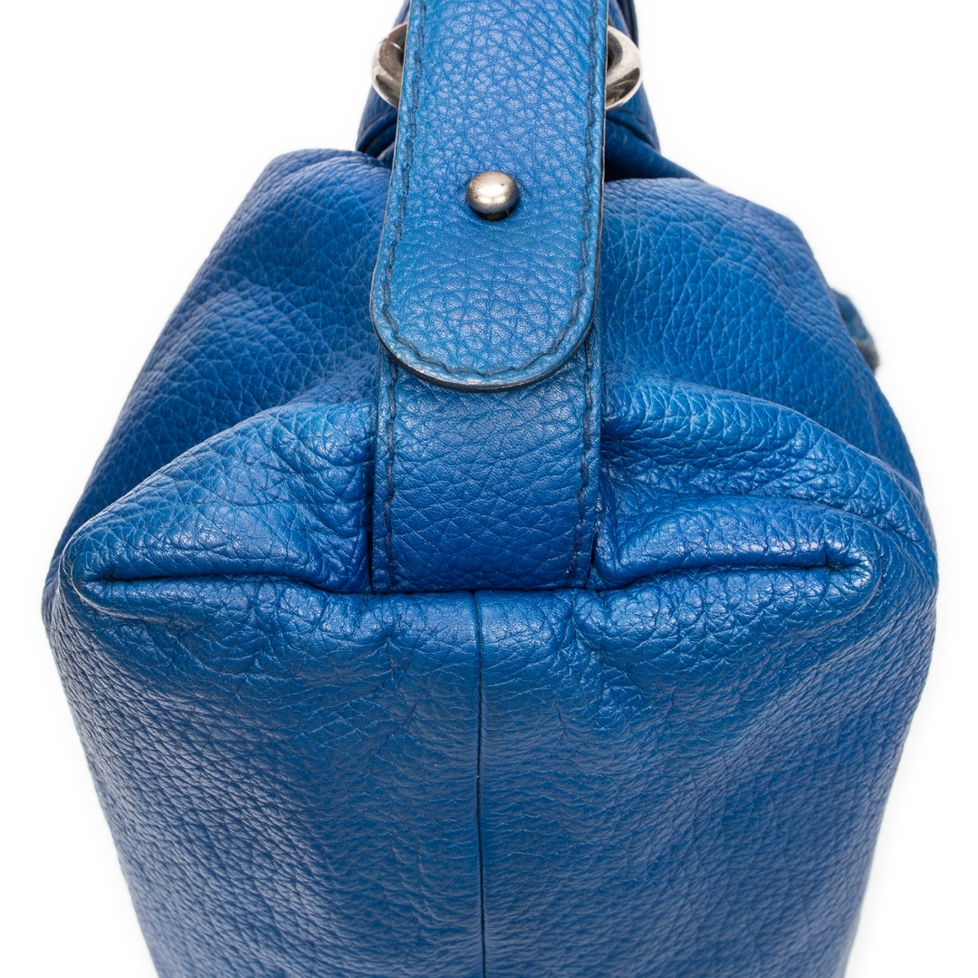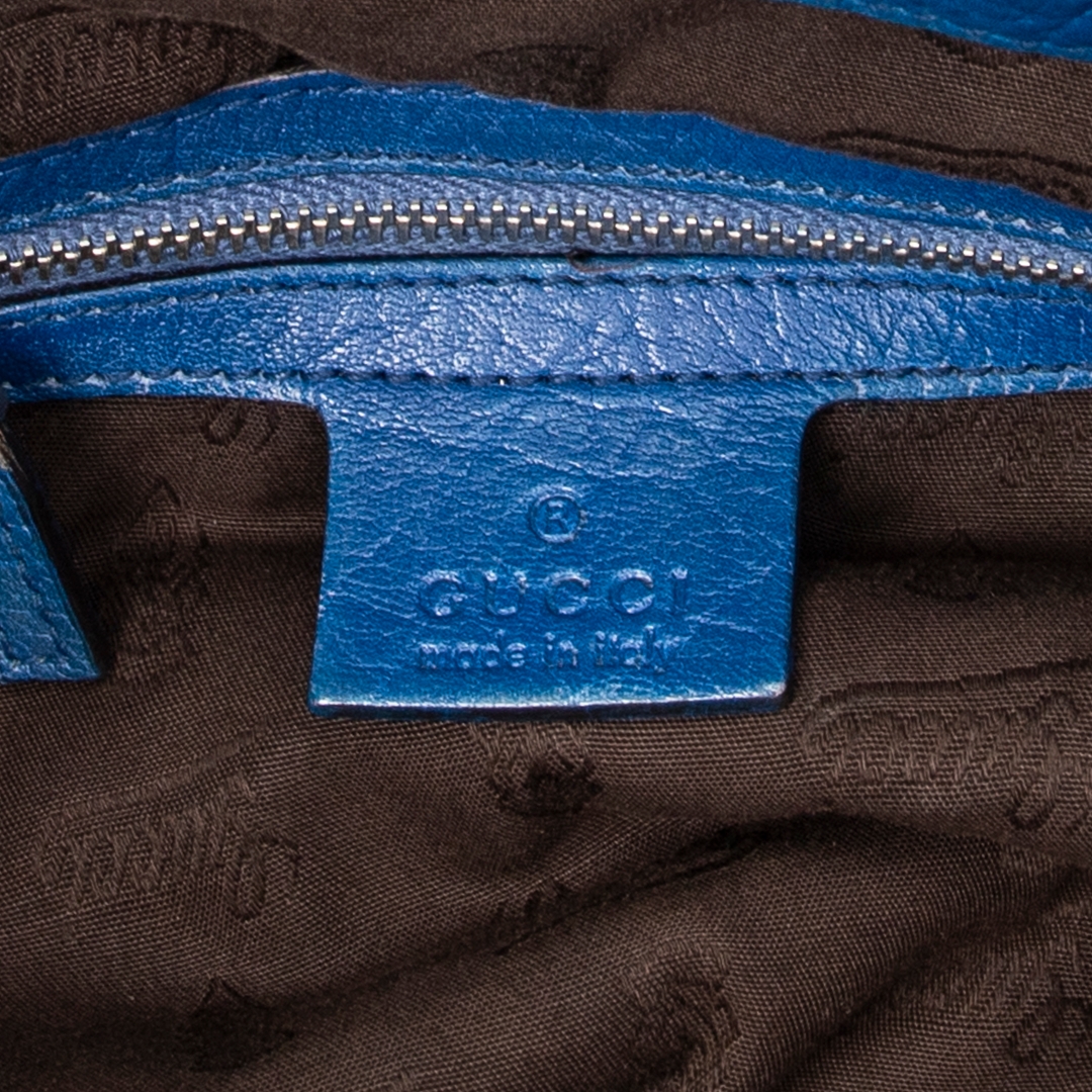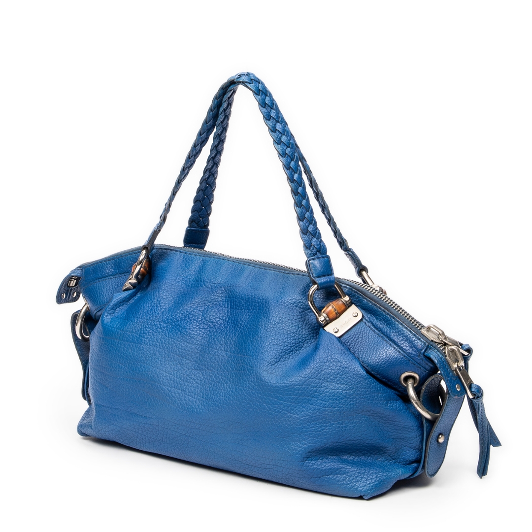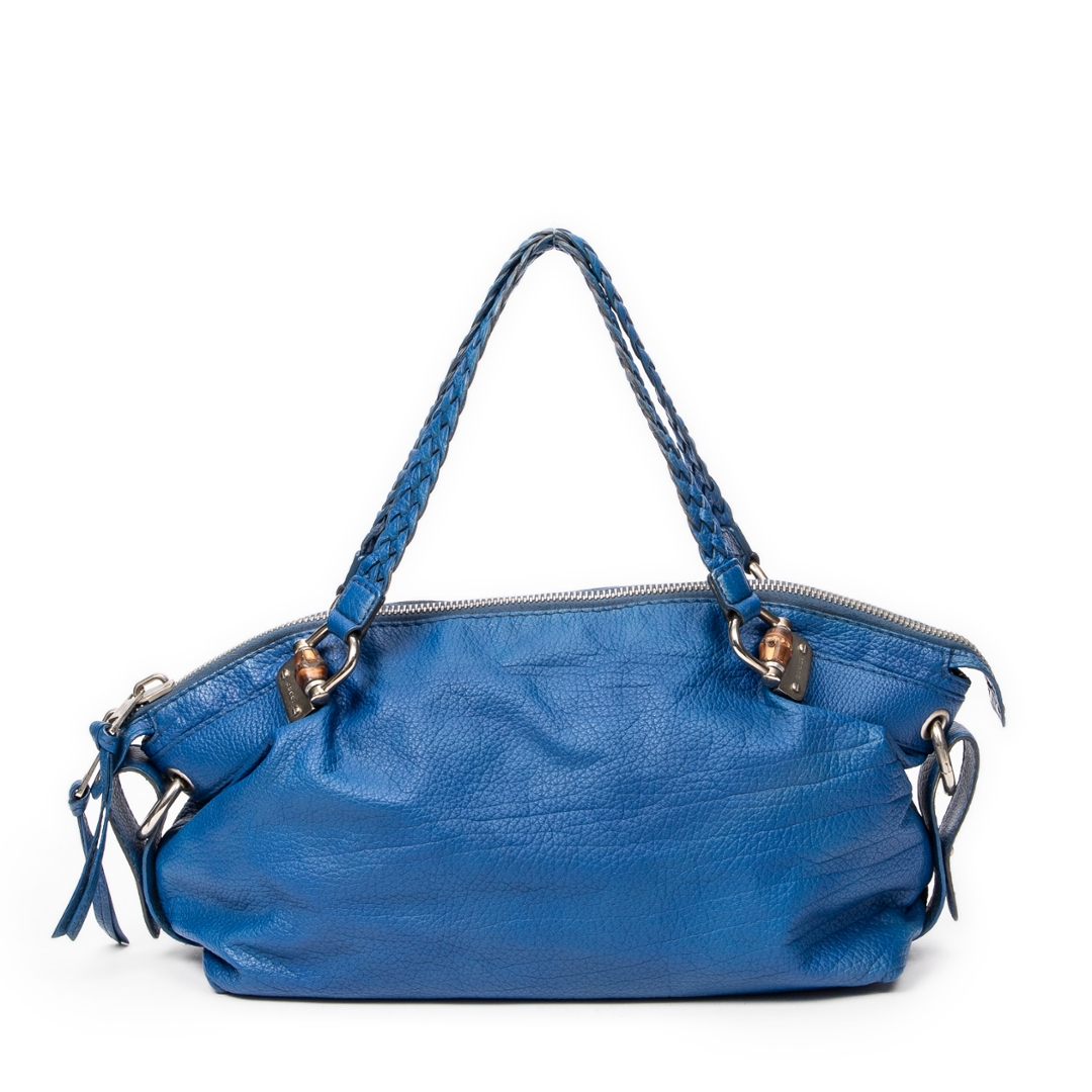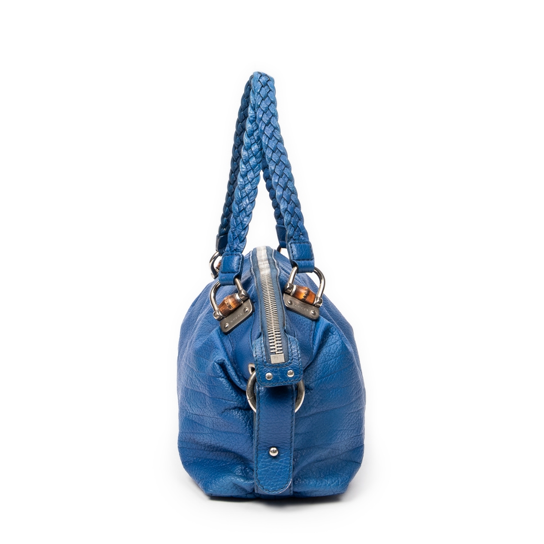 A vintage Gucci royal blue calf leather Large Bamboo Bar Boston bag with a certificate of authenticity. Approximately 27cm height, 40cm width.