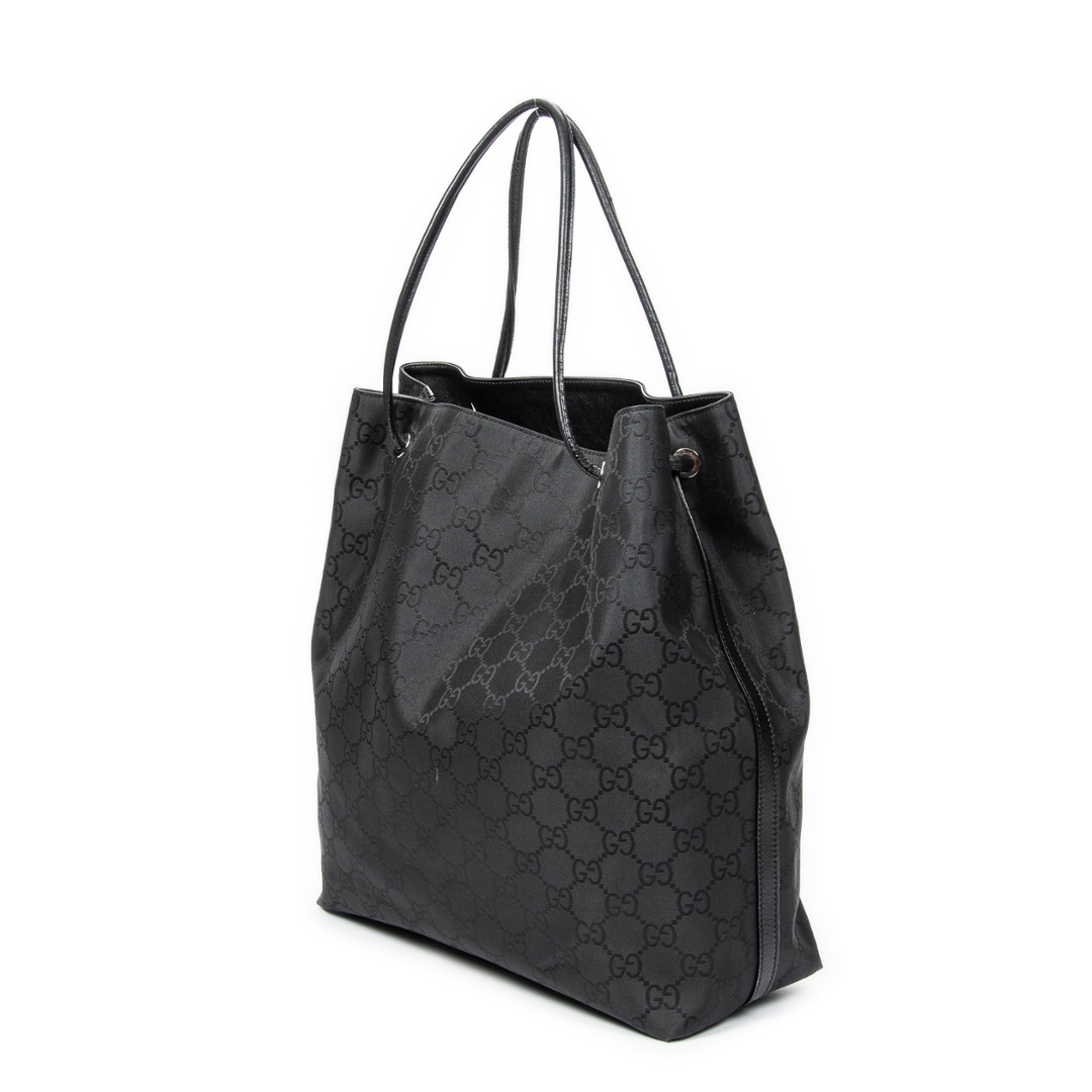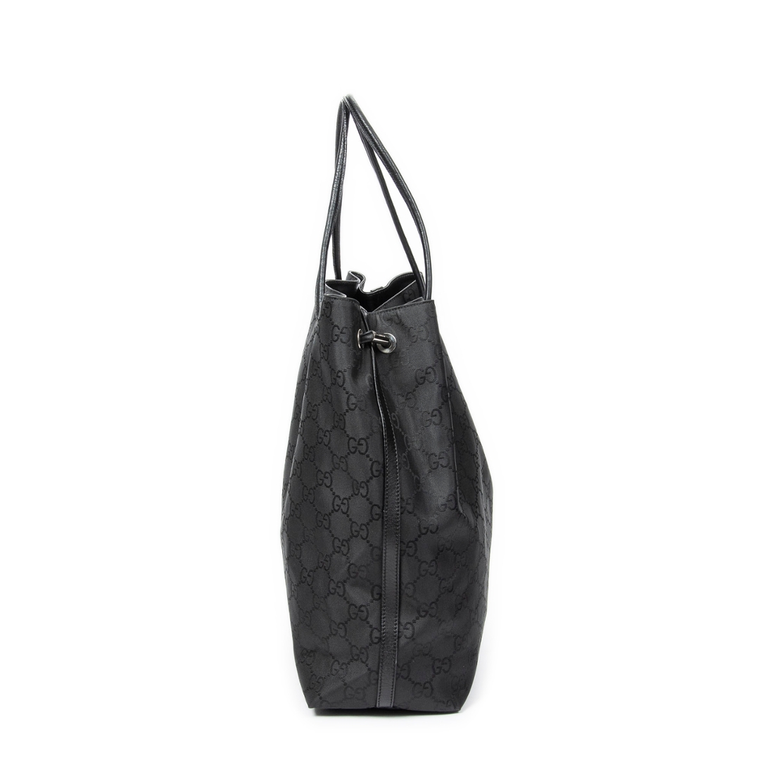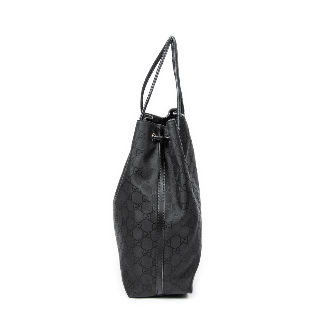 A vintage Gucci black canvas Large Gifford Tote bag, showcasing a clean and contemporary take on the house’s iconic GG monogram. The tonal black canvas creates a sleek, understated aesthetic, complemented by subtle leather trim and slim shoulder straps that enhance its refined, minimalist appeal.