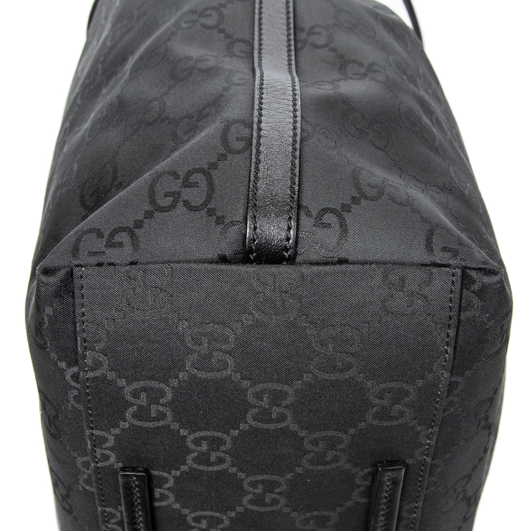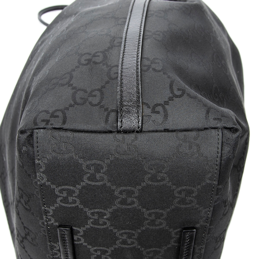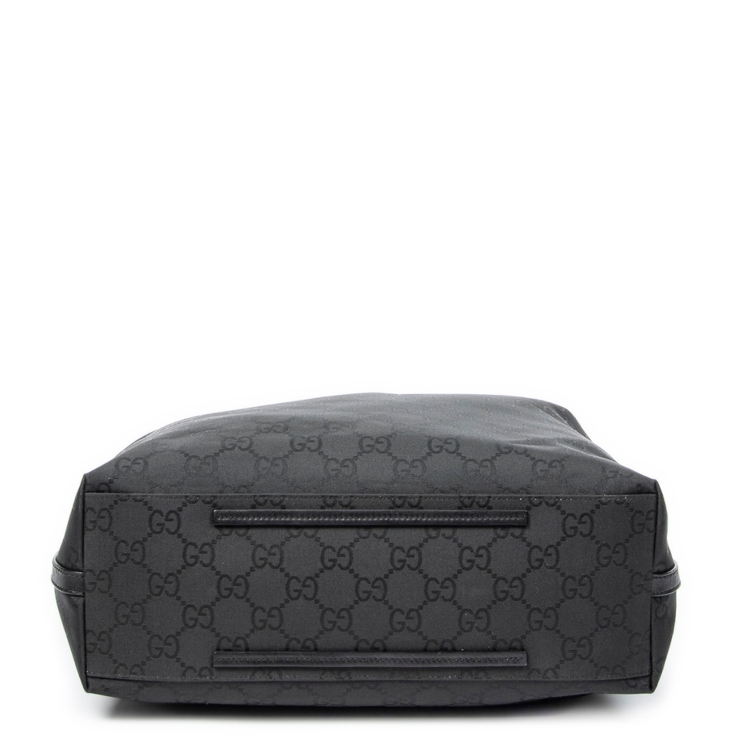 A vintage Gucci black canvas Large Gifford Tote bag, showcasing a clean and contemporary take on the house’s iconic GG monogram. The tonal black canvas creates a sleek, understated aesthetic, complemented by subtle leather trim and slim shoulder straps that enhance its refined, minimalist appeal.