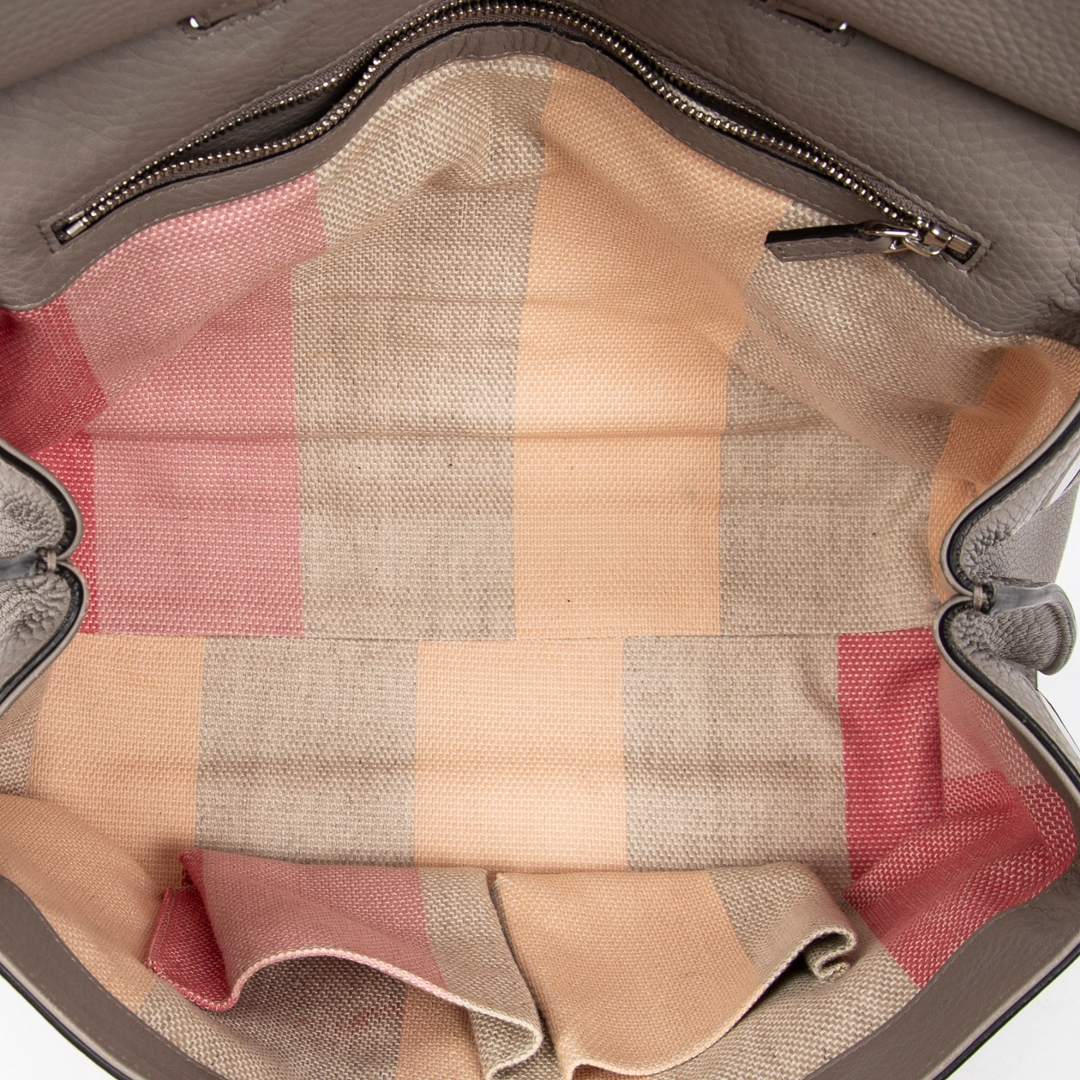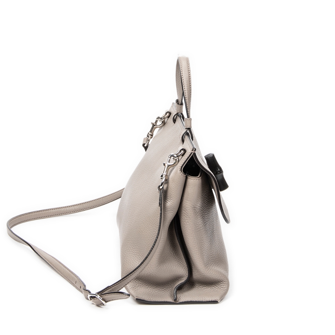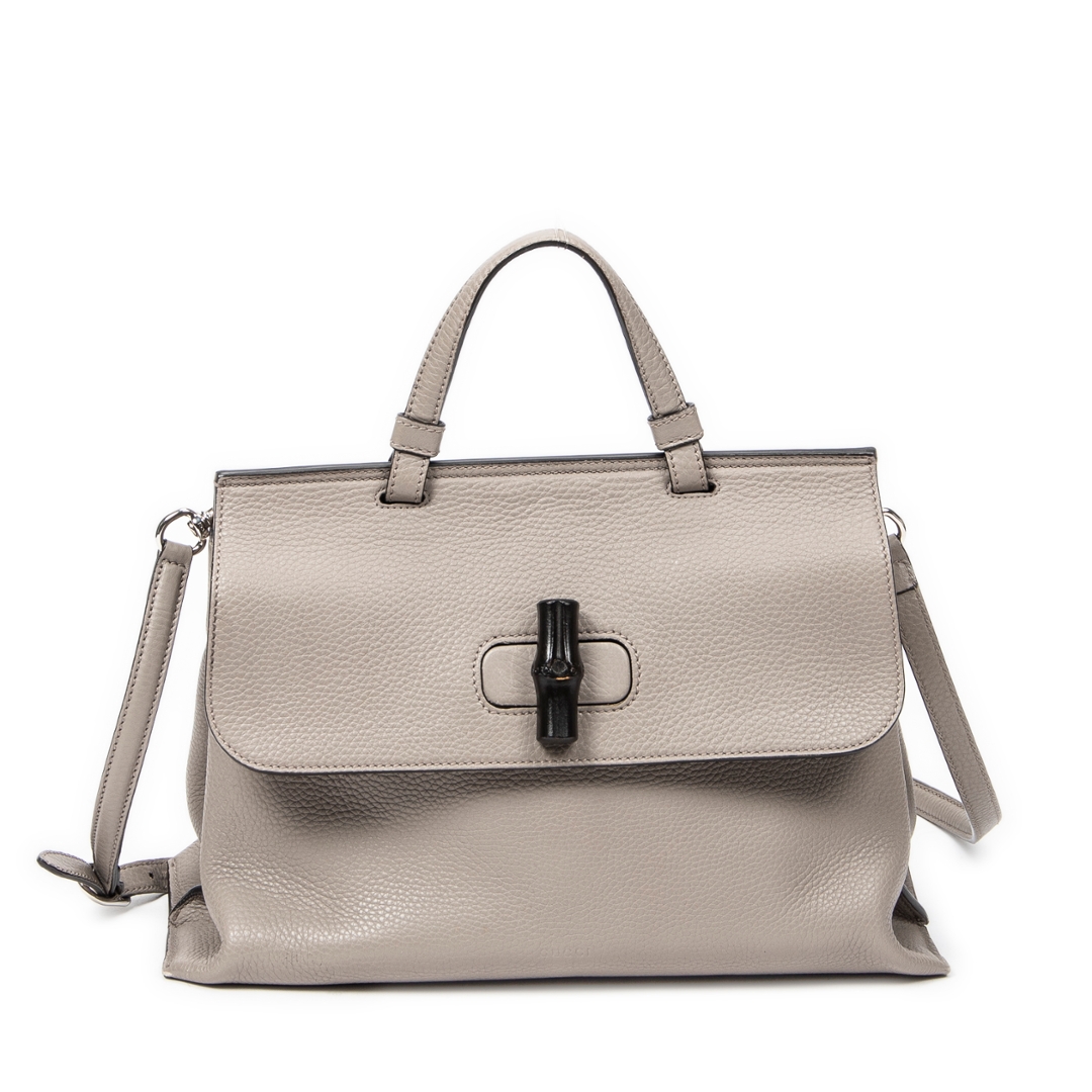 A vintage Gucci grey calf leather Medium Bamboo Daily Top Handle bag, offering a refined balance of classic house heritage and contemporary practicality. Crafted from supple calf leather in a soft grey tone, it is accented by the signature bamboo turn-lock closure, a distinctive detail synonymous with Gucci’s enduring design legacy.