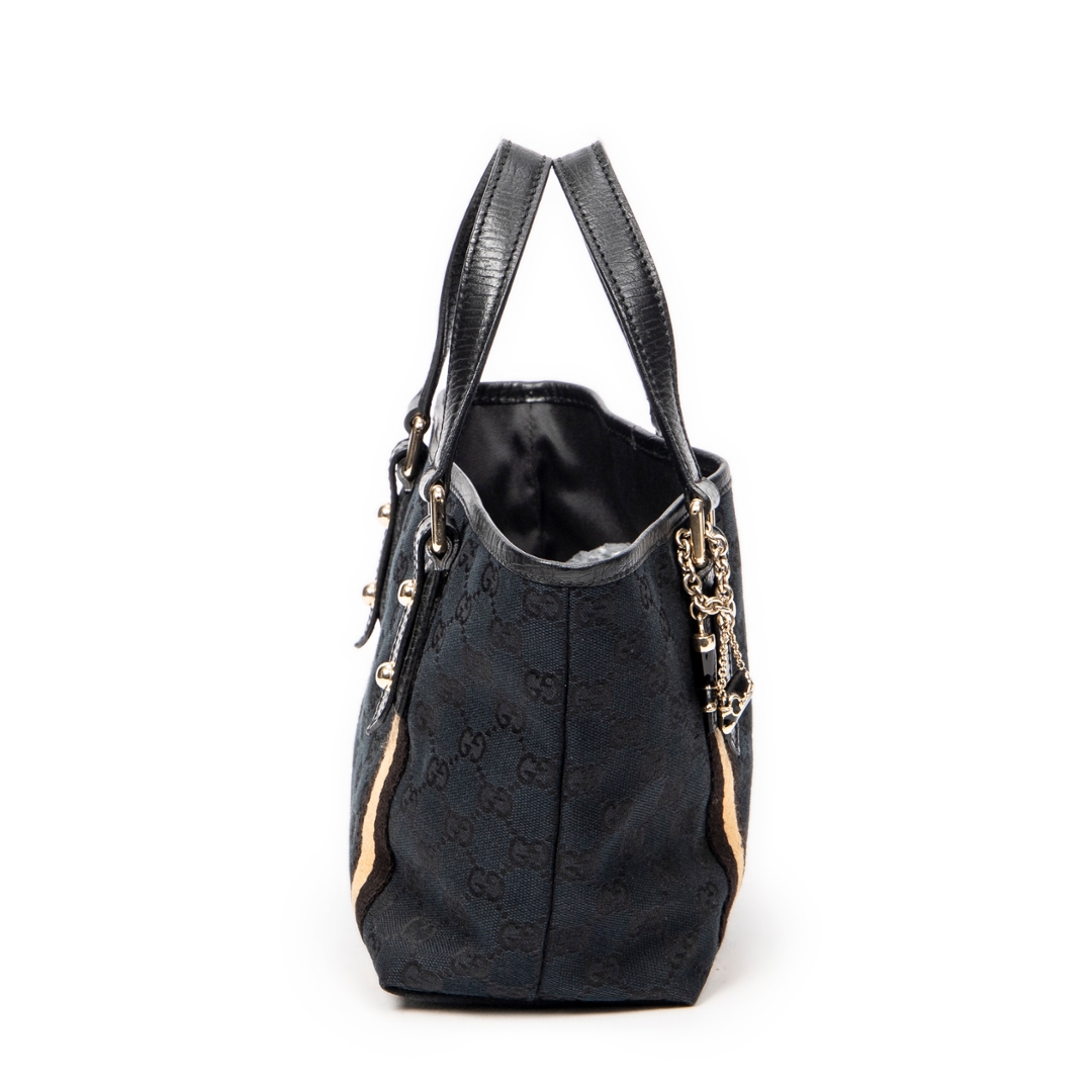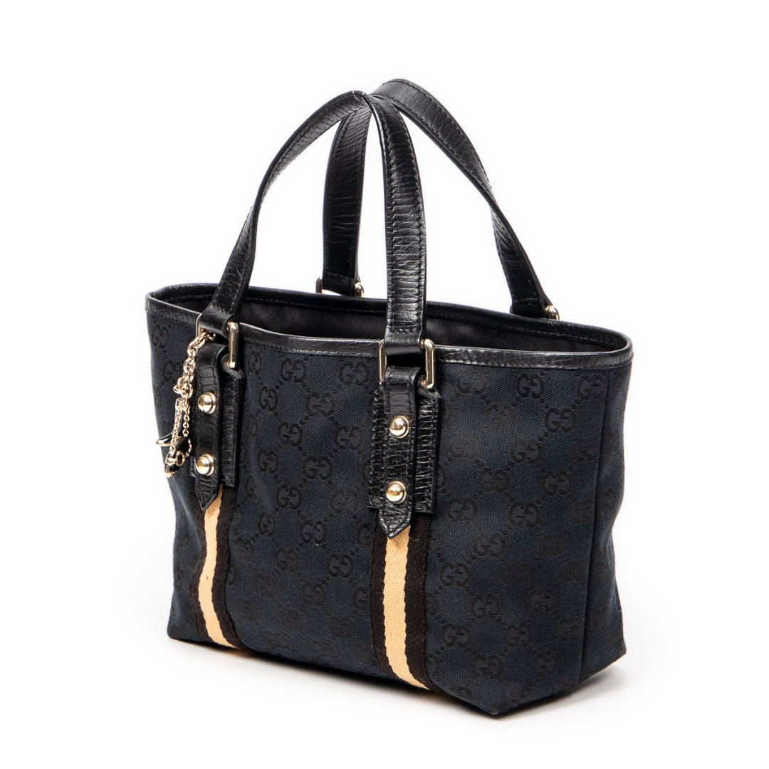 A vintage Gucci black canvas Mini Web Jolicoeur Tote bag with a certificate of authenticity, Approximately 17cm height, 22cm width.