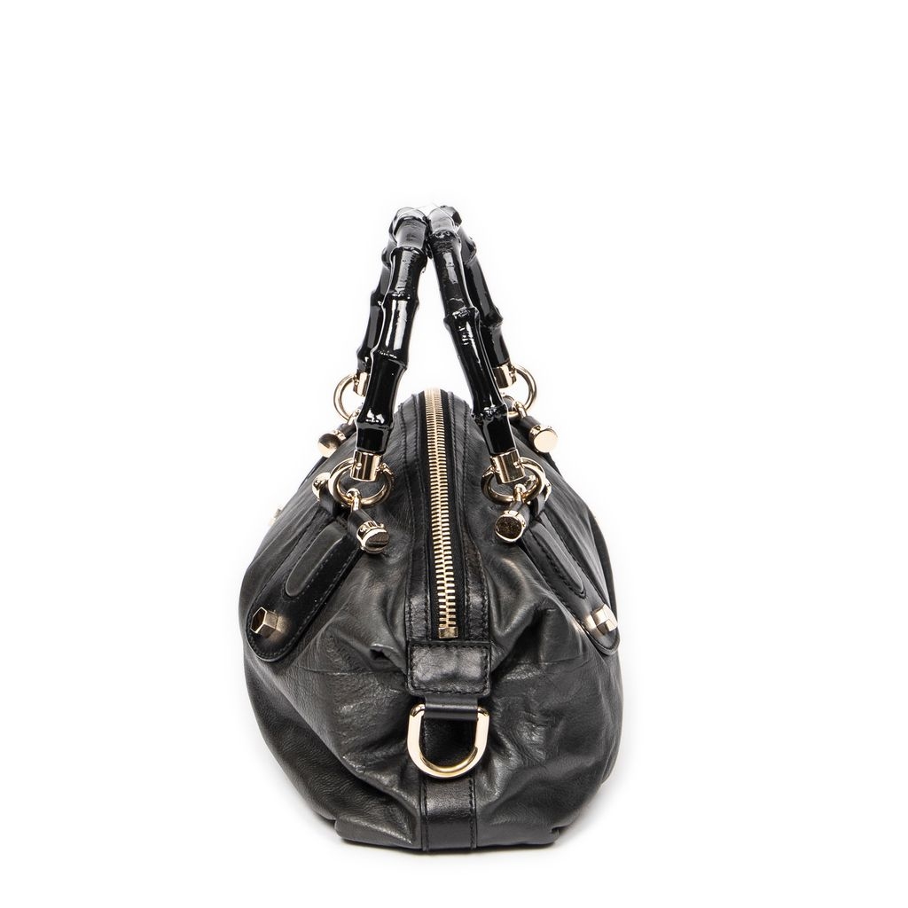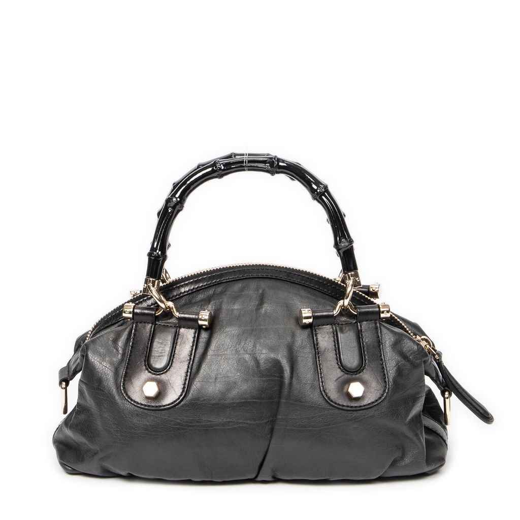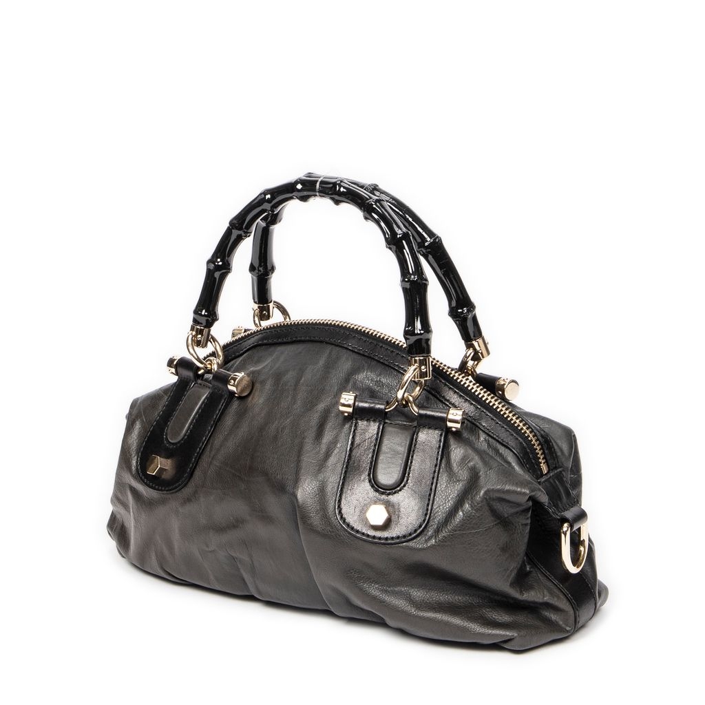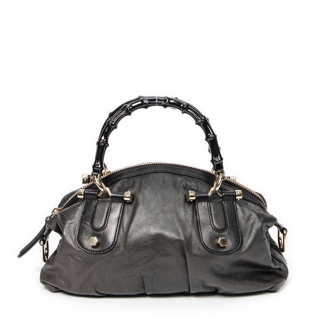 A vintage Gucci dark grey/black calf leather Pop Bamboo Top Handle bag with a certificate of authenticity, Approximately 15cm height, 31cm width.