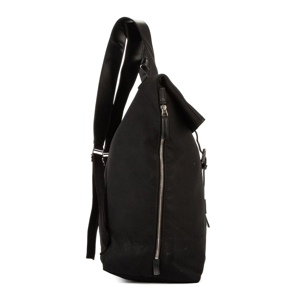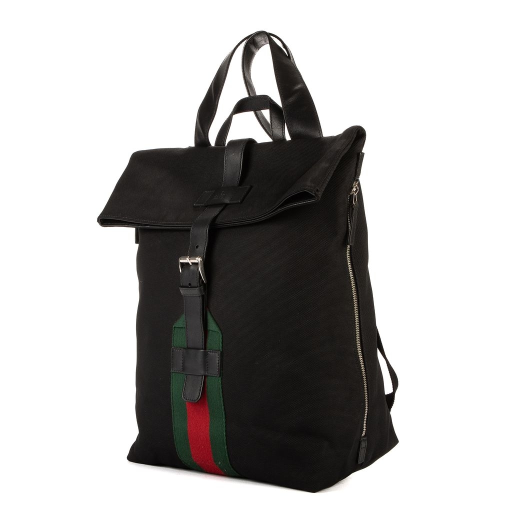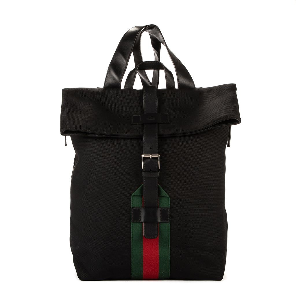 A vintage Gucci black canvas Sherry Line Backpack bag with a certificate of authenticity, Approximately 45cm height, 30cm width.