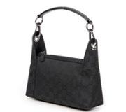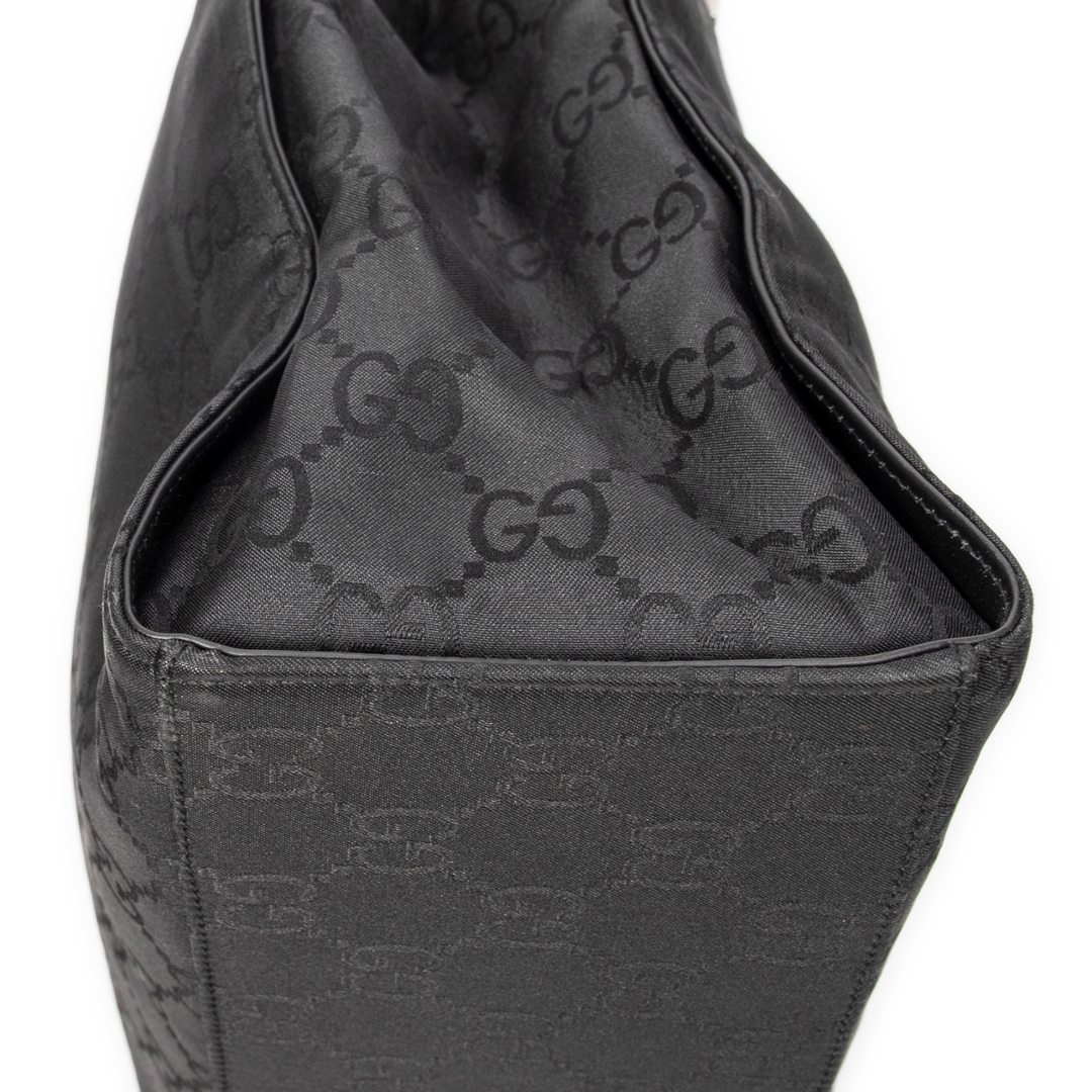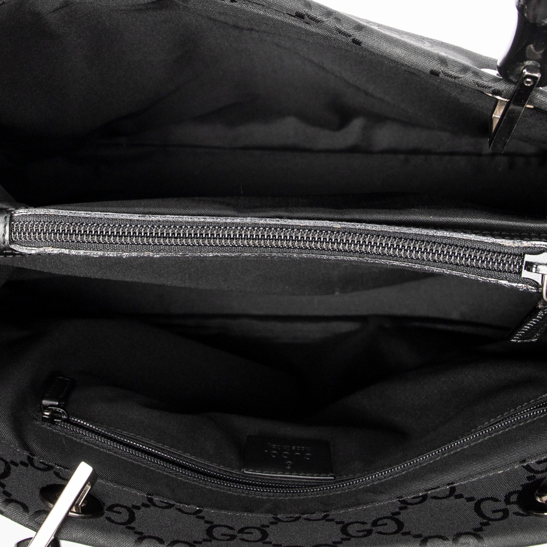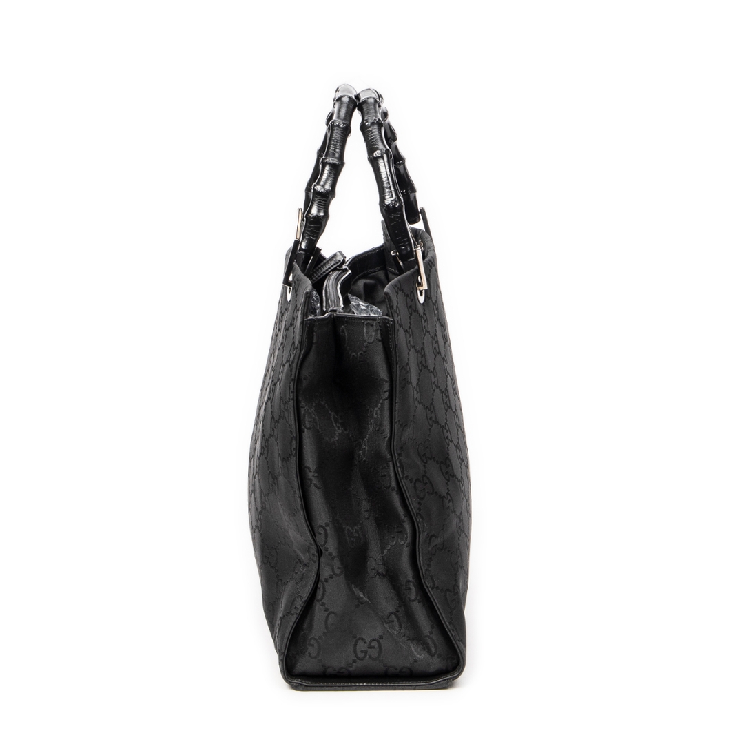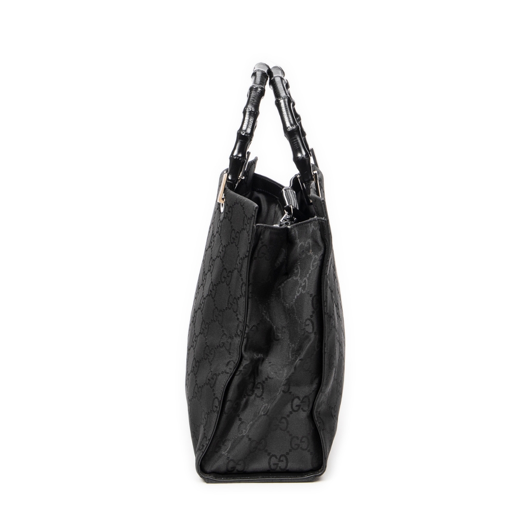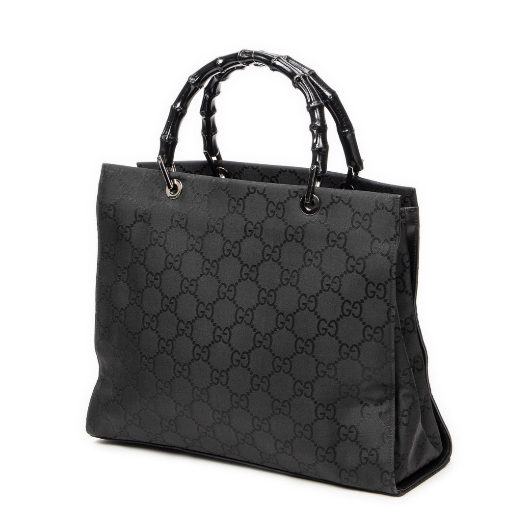 A vintage Gucci black canvas Square Bamboo Tote bag with a certificate of authenticity, Approximately 28cm height, 35cm width.
