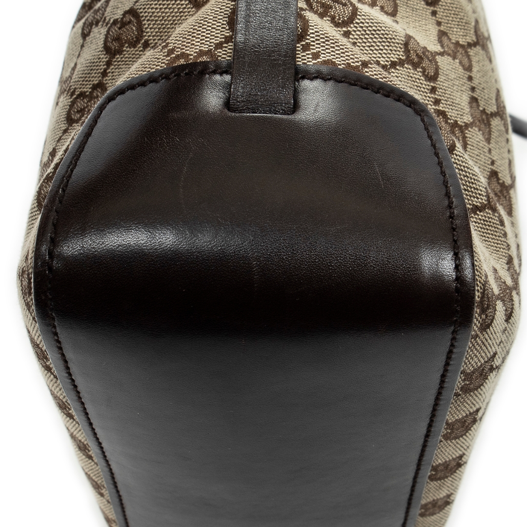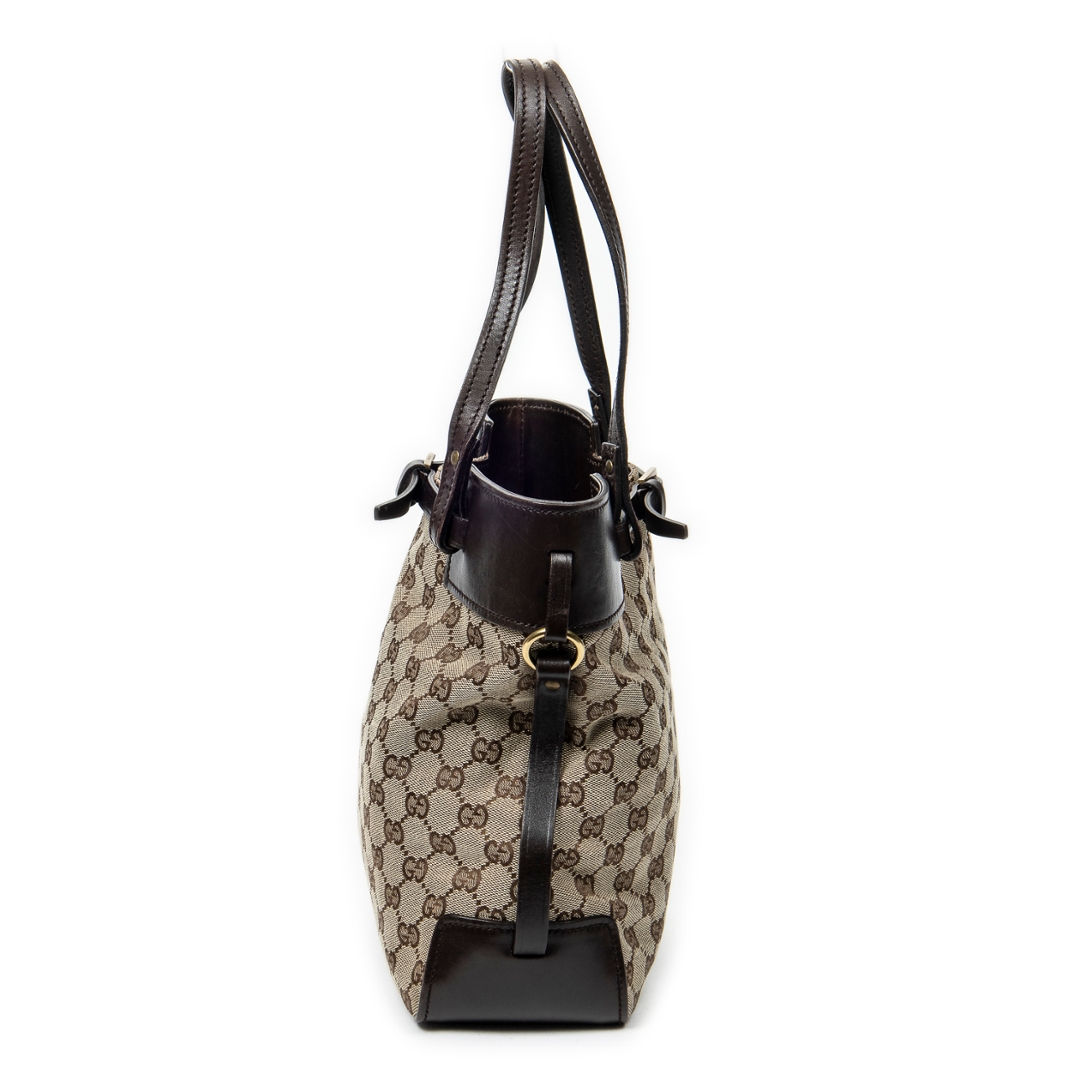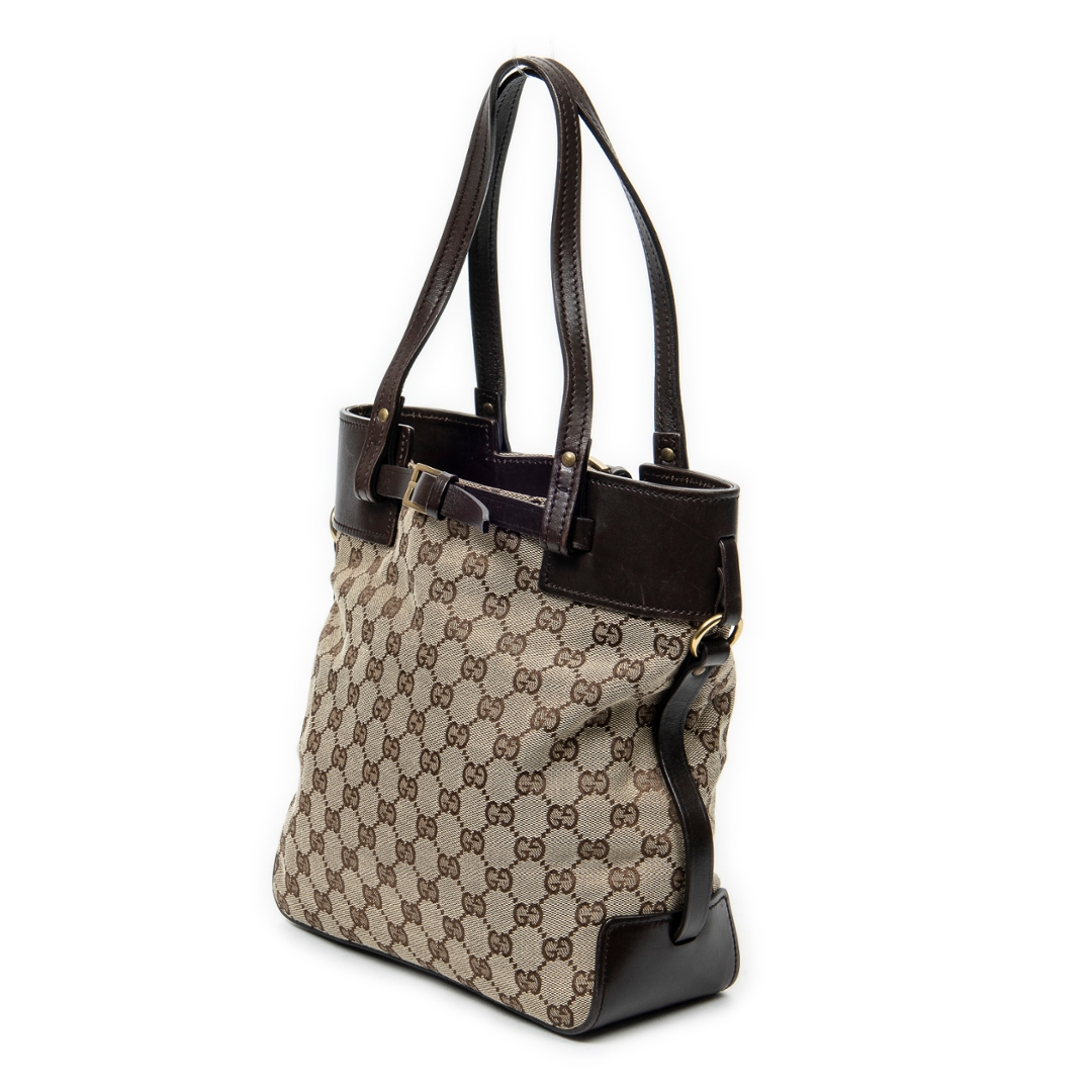 A vintage Gucci beige/brown canvas Tall Belt Tote bag with a certificate of authenticity, Approximately 25cm height, 25cm width.