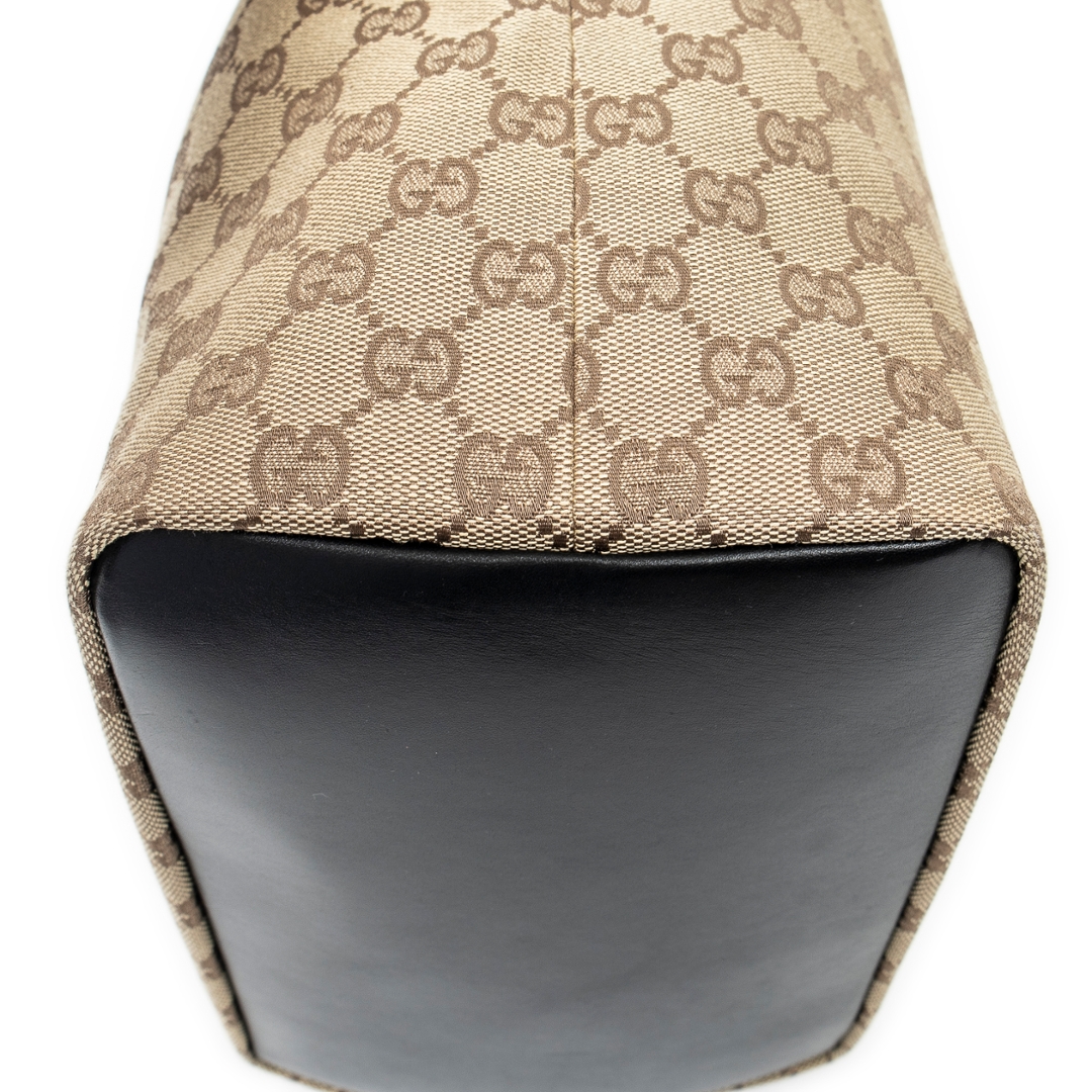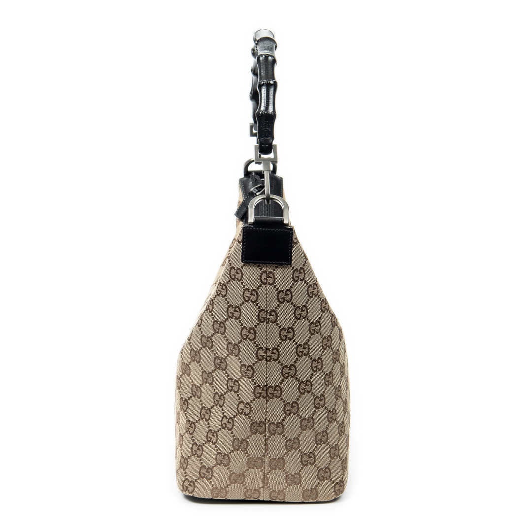 A vintage Gucci beige/black canvas Zip Bamboo Hobo bag with a certificate of authenticity, Approximately 25cm height, 24cm width.
