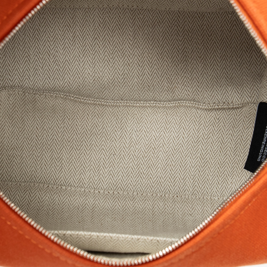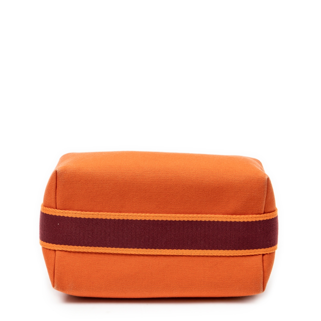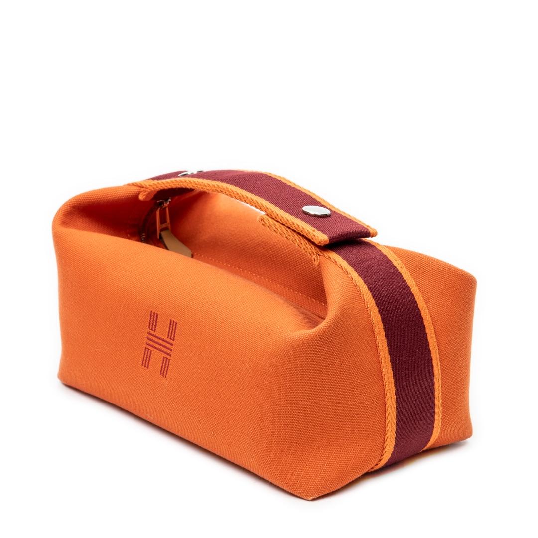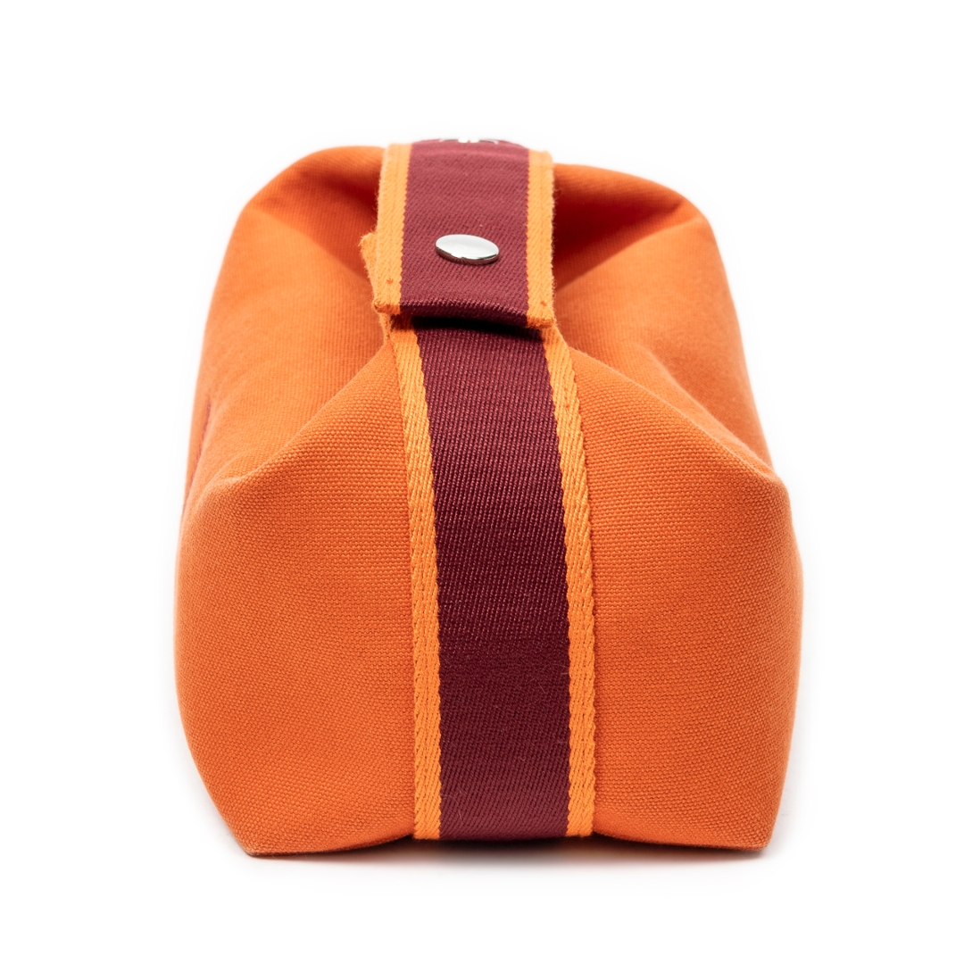 A Hermès Bride-à-Brac case crafted in vibrant orange canvas, showcasing the house’s signature blend of practicality and understated luxury. The structured silhouette is enhanced by a contrasting burgundy strap with snap-button closure, adding both visual depth and functional security. Subtle Hermès detailing, including the discreet “H” motif to the side, reinforces its heritage while maintaining a clean, versatile aesthetic.