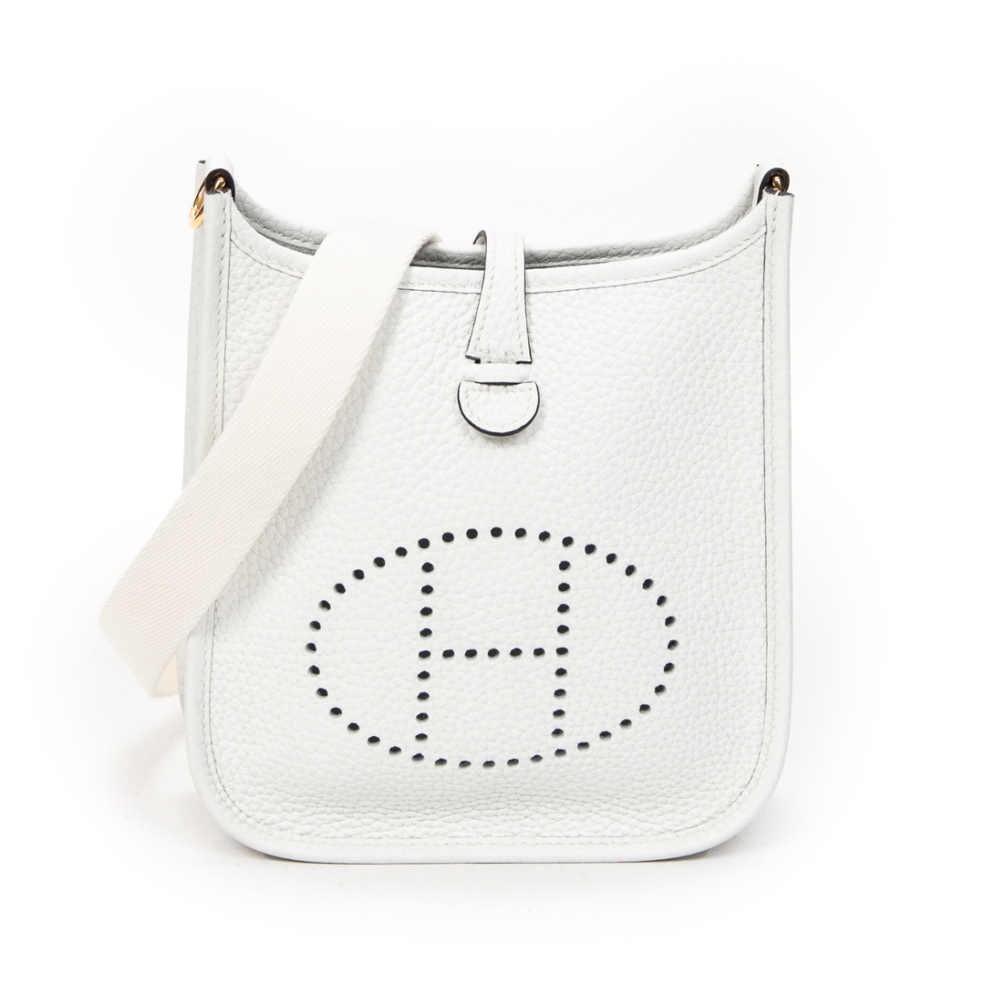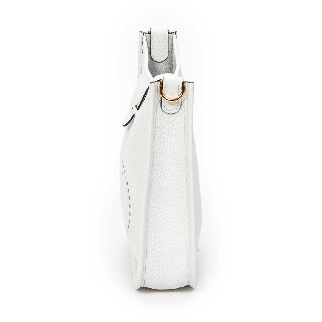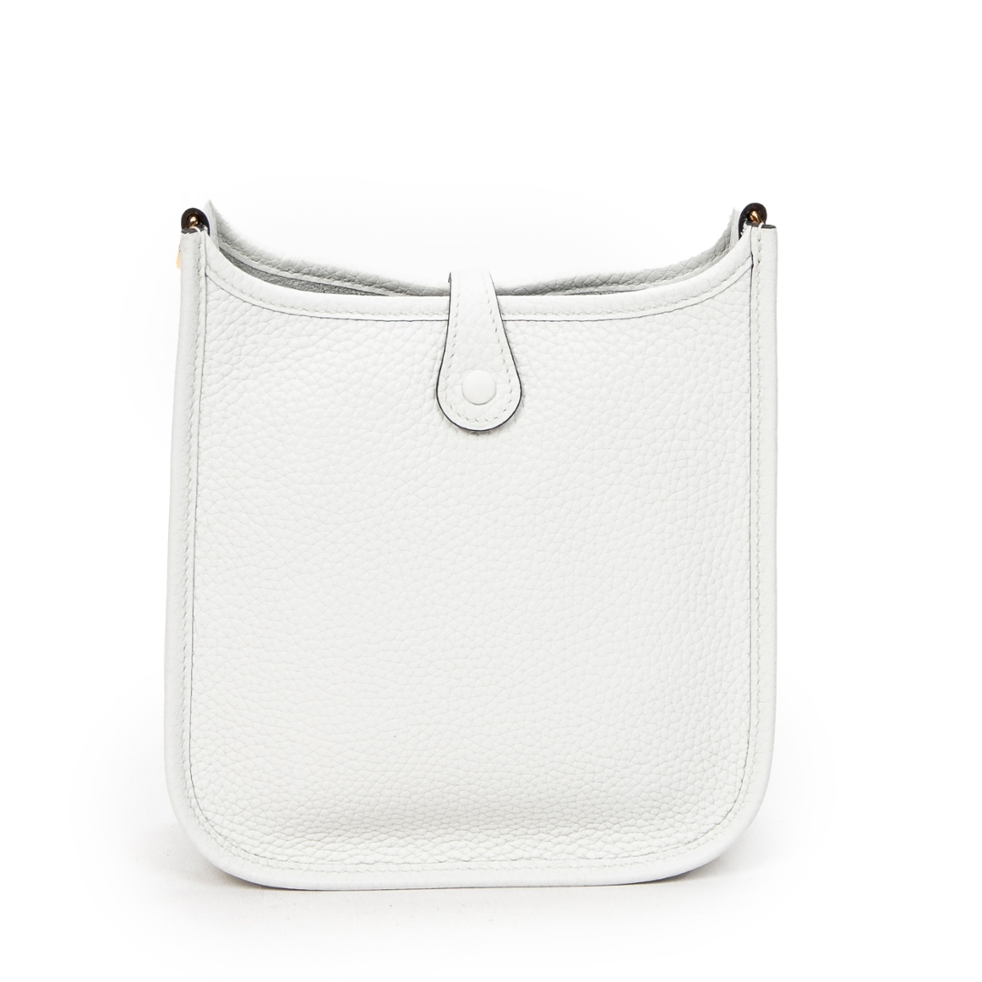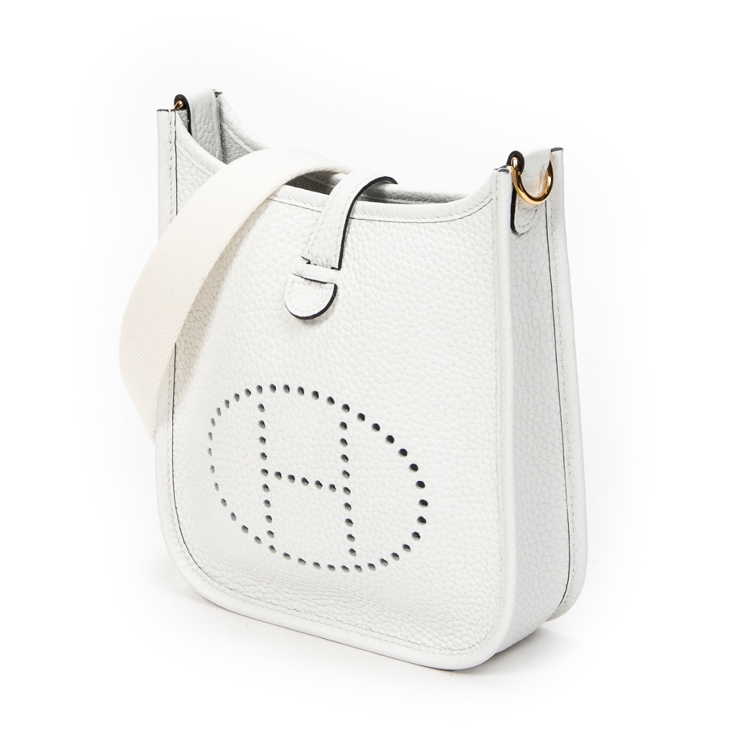 A Hermès Evelyne bag crafted in ivory Clemence calf leather, showcasing the house’s iconic perforated “H” logo to the front. The softly structured silhouette is enhanced by smooth leather trim and gold-tone hardware, creating a refined contrast against the crisp ivory tone. The natural grain of Clemence leather adds depth and durability, reinforcing both its luxurious feel and everyday practicality.