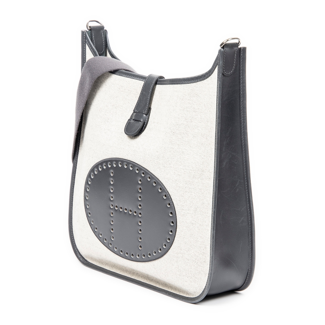 A vintage Hermes beige/grey canvas Evelyne I bag with a certificate of authenticity, Approx 31cm height, 33cm width.