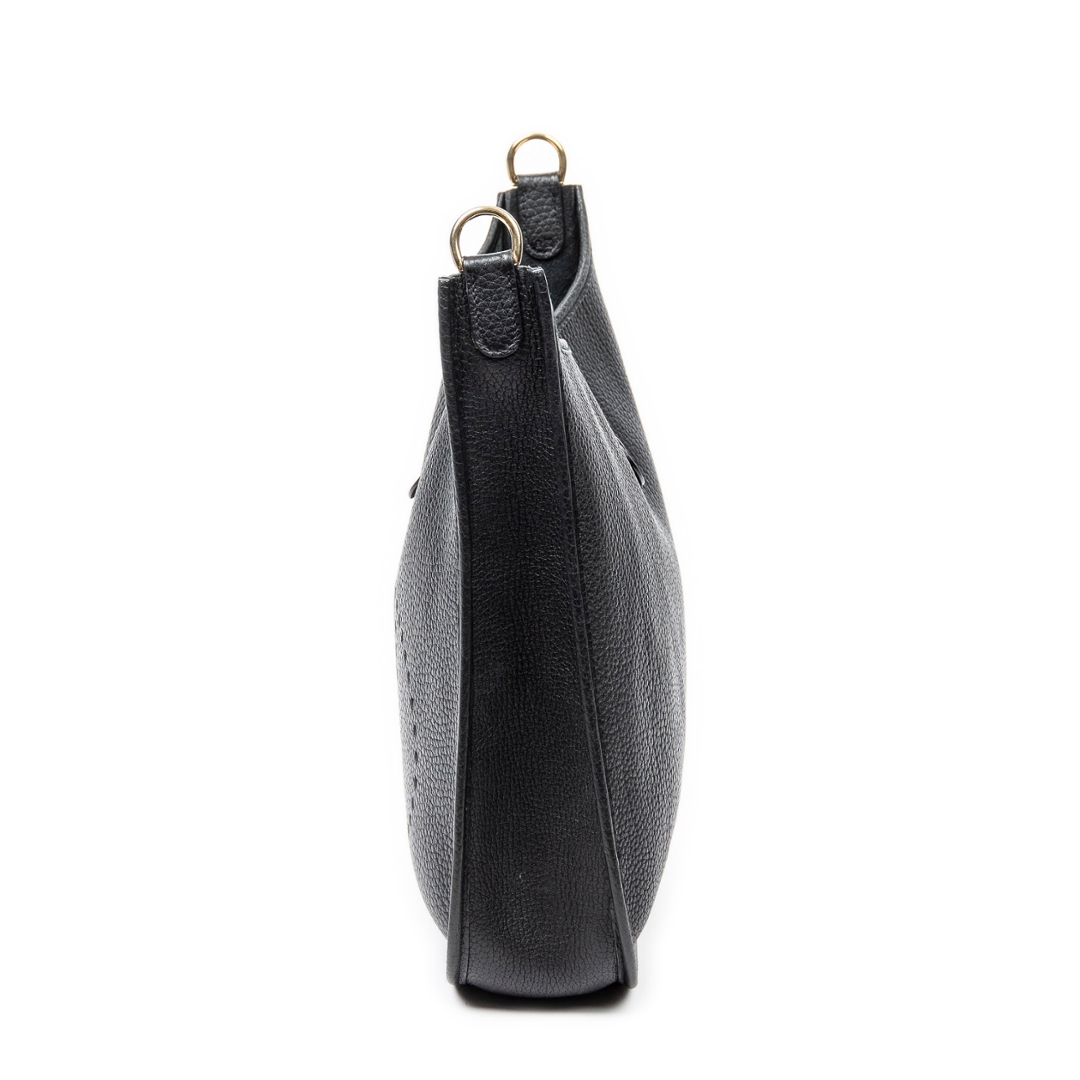 A vintage Hermès black calf leather Evelyne I bag, a larger and highly practical iteration of the house’s iconic Evelyne design. Crafted from finely grained calf leather, the relaxed yet structured silhouette is enhanced by the signature perforated “H” logo to the front, offering a subtle but unmistakable Hermès identity.
