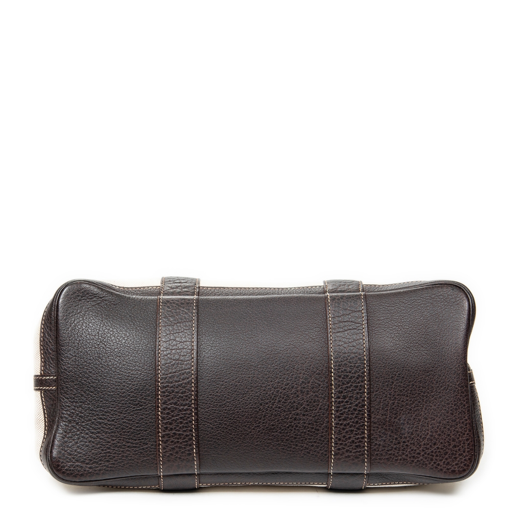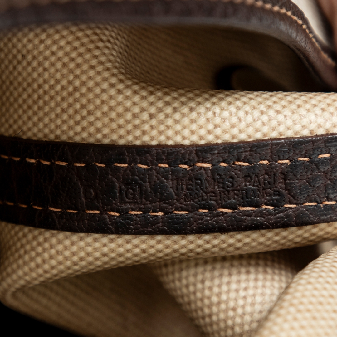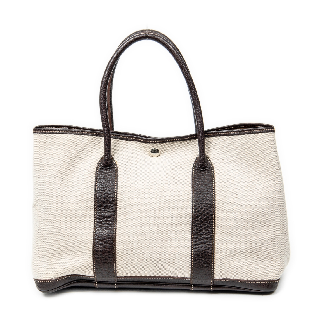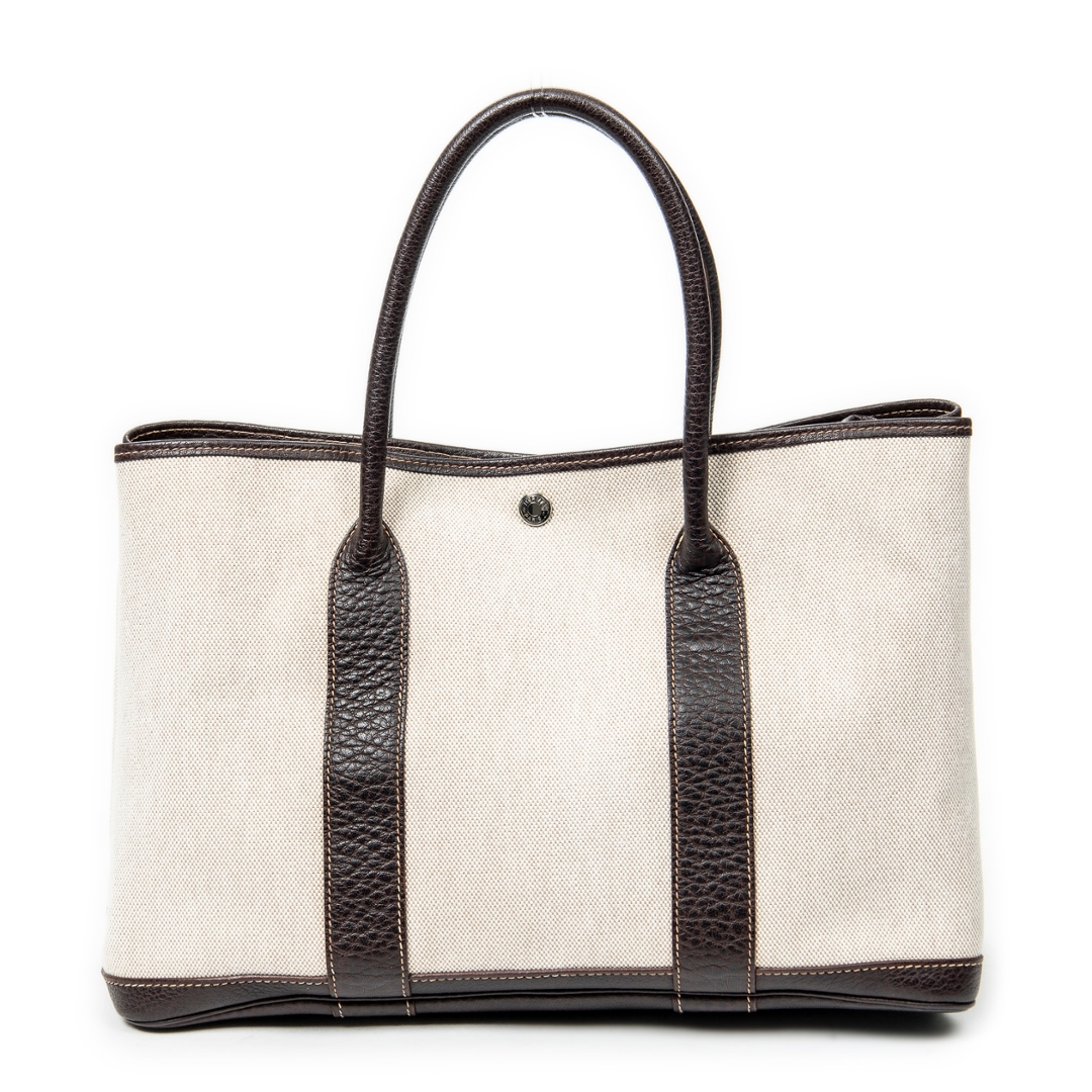 A Hermès Garden Party bag crafted in beige canvas with contrasting brown leather trim, offering a refined balance of casual elegance and structured design. The clean silhouette is defined by its reinforced leather handles and side panels, while subtle stitching and a discreet snap-button closure reflect the house’s understated approach to luxury. The neutral colour combination ensures timeless versatility across a range of settings.