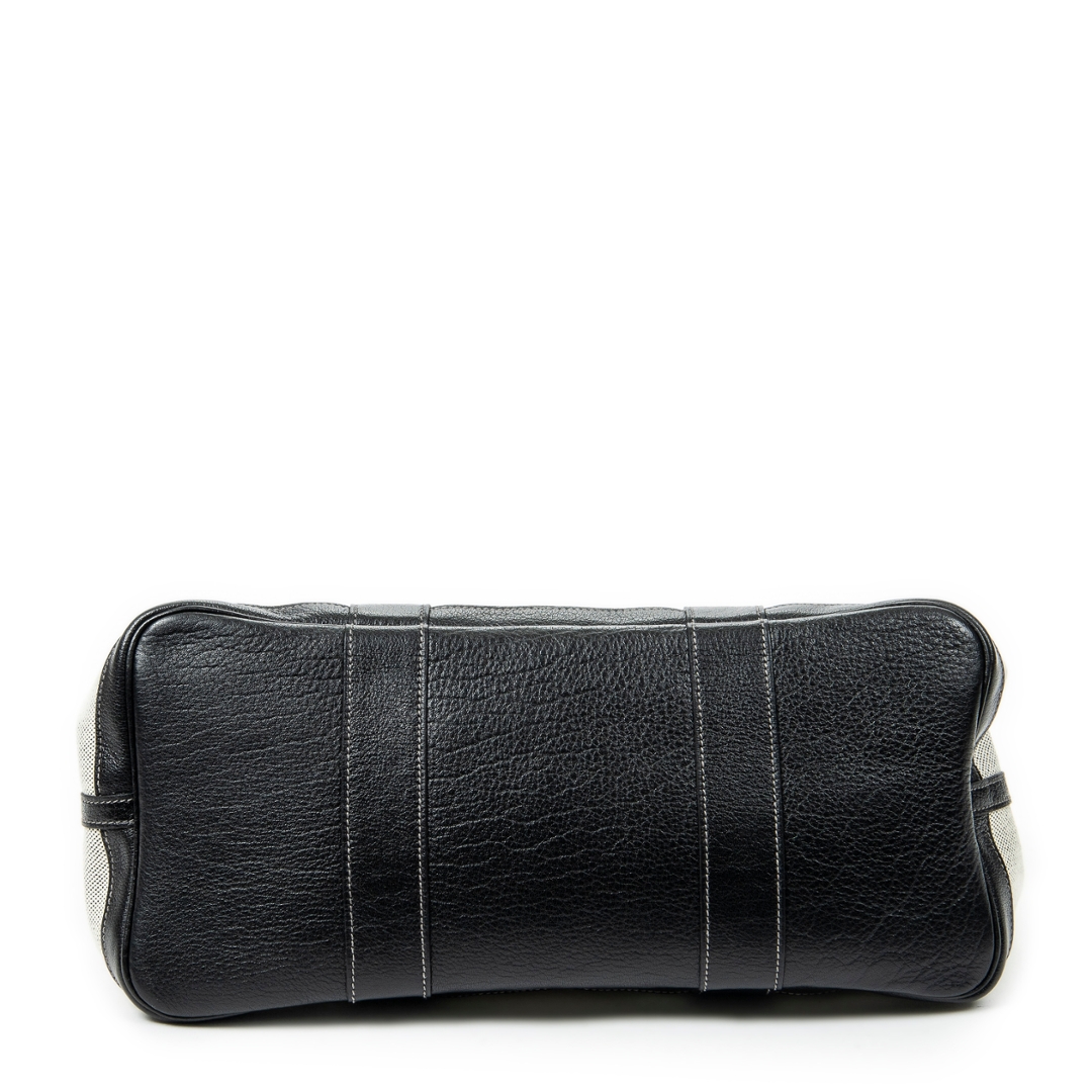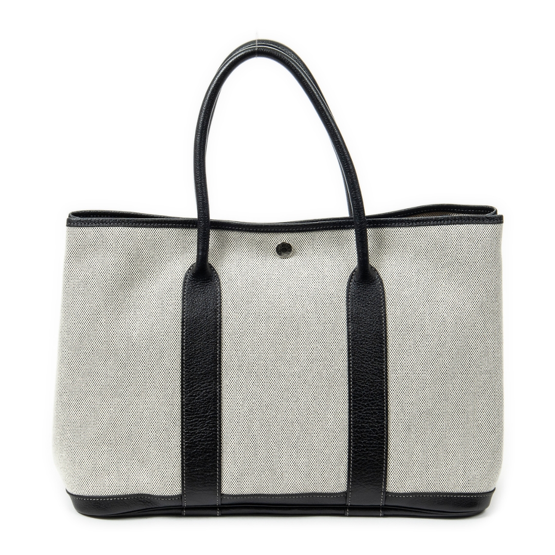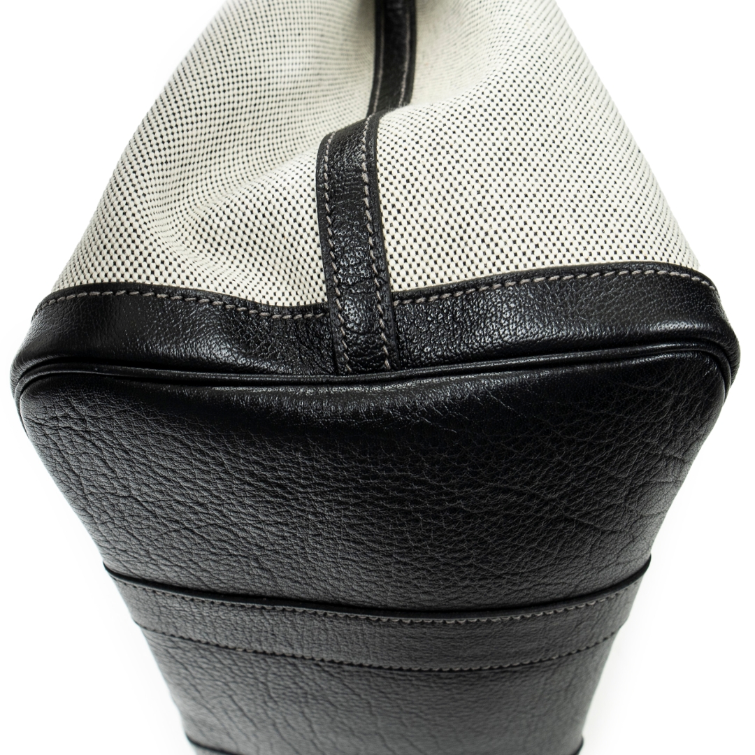 A vintage Hermès ivory and black canvas Garden Party bag, a refined and practical design that reflects the house’s effortless approach to everyday luxury. Crafted from durable canvas with contrasting black leather trim, the structured silhouette is both elegant and functional, while the subtle snap closure maintains a clean and understated finish.