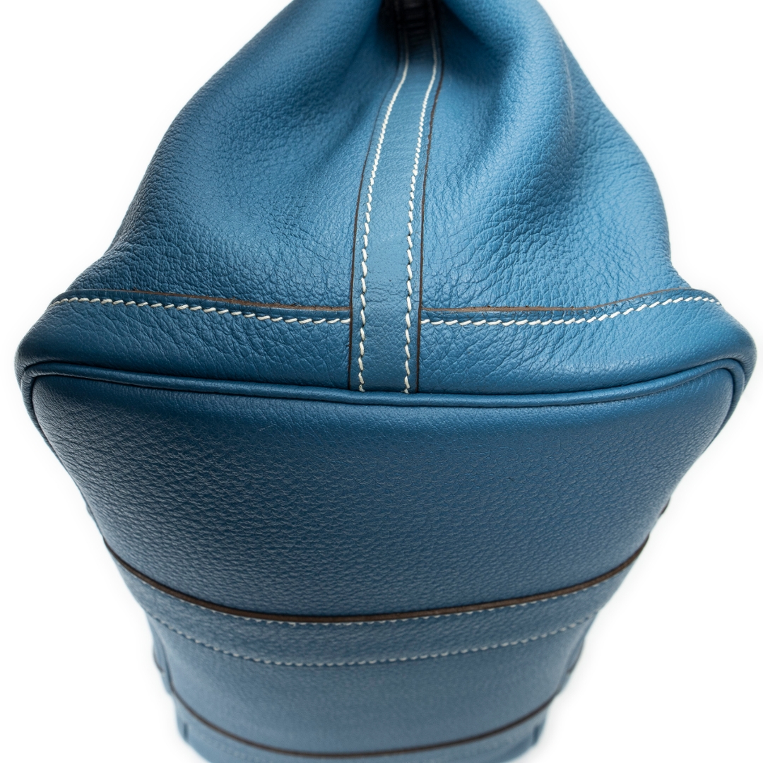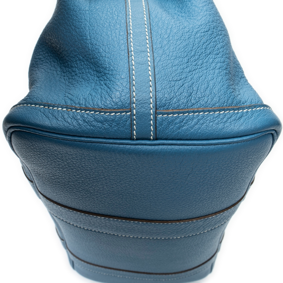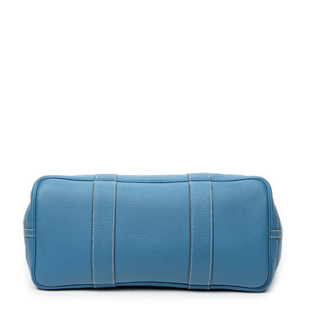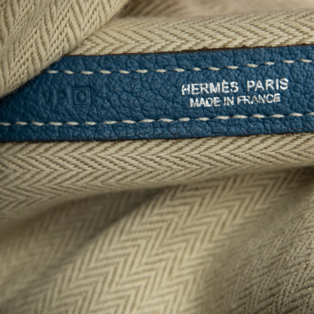 A Hermès Garden Party bag crafted in Blue Jean calf leather, offering a refined yet relaxed interpretation of one of the house’s most versatile designs. The softly structured silhouette is complemented by tonal stitching and clean leather paneling, while the subtle snap-button closure maintains the bag’s understated aesthetic. The distinctive Blue Jean shade adds a fresh, contemporary edge to a timeless Hermès staple.