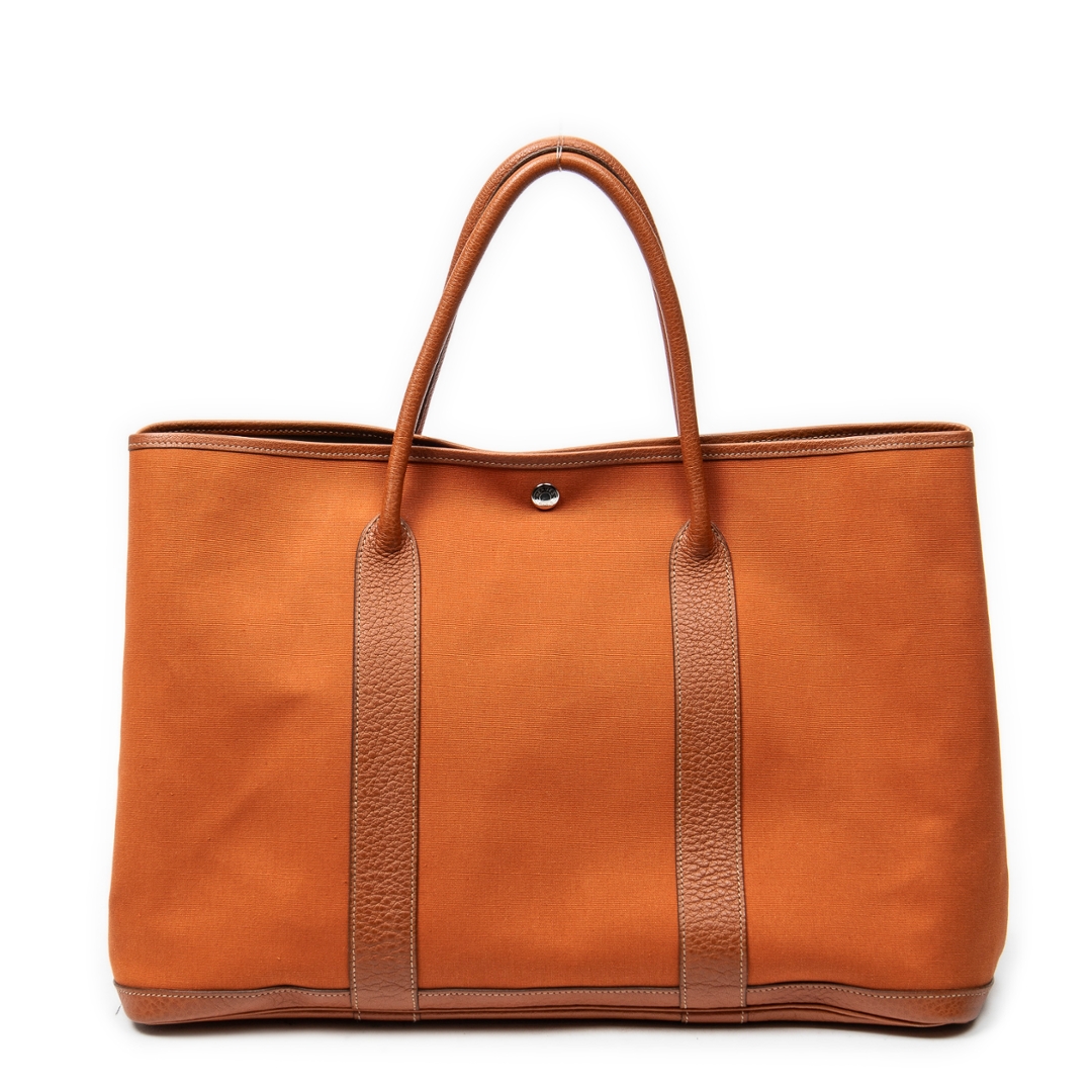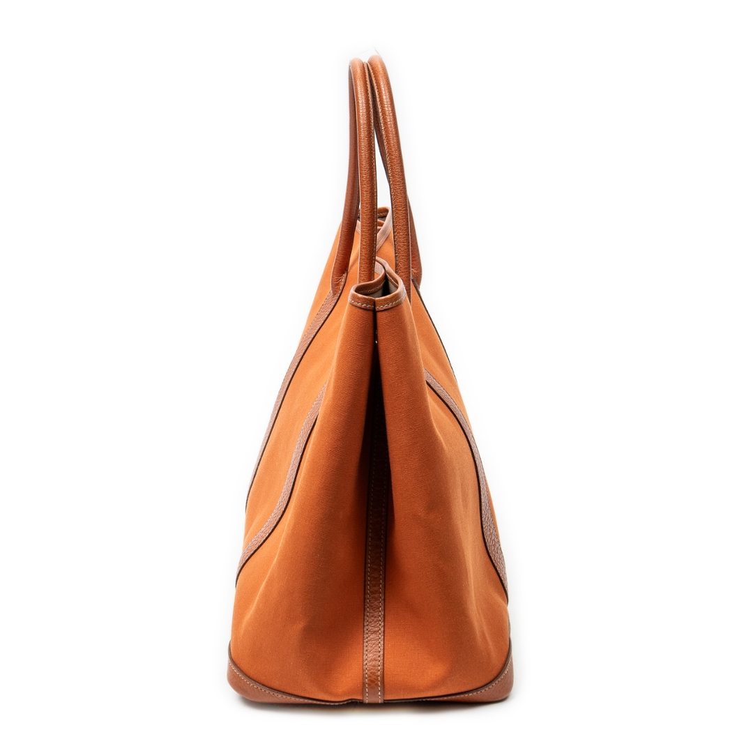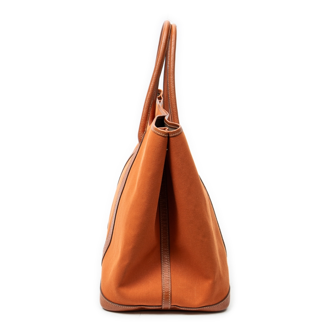 A vintage Hermès Garden Party bag crafted in a rich orange canvas, complemented by warm brown leather trim and handles. This larger-format example highlights the effortless sophistication the style is known for, with its structured silhouette, clean lines, and signature snap closure. The bold yet classic colour combination delivers a confident statement while remaining highly versatile for everyday use.