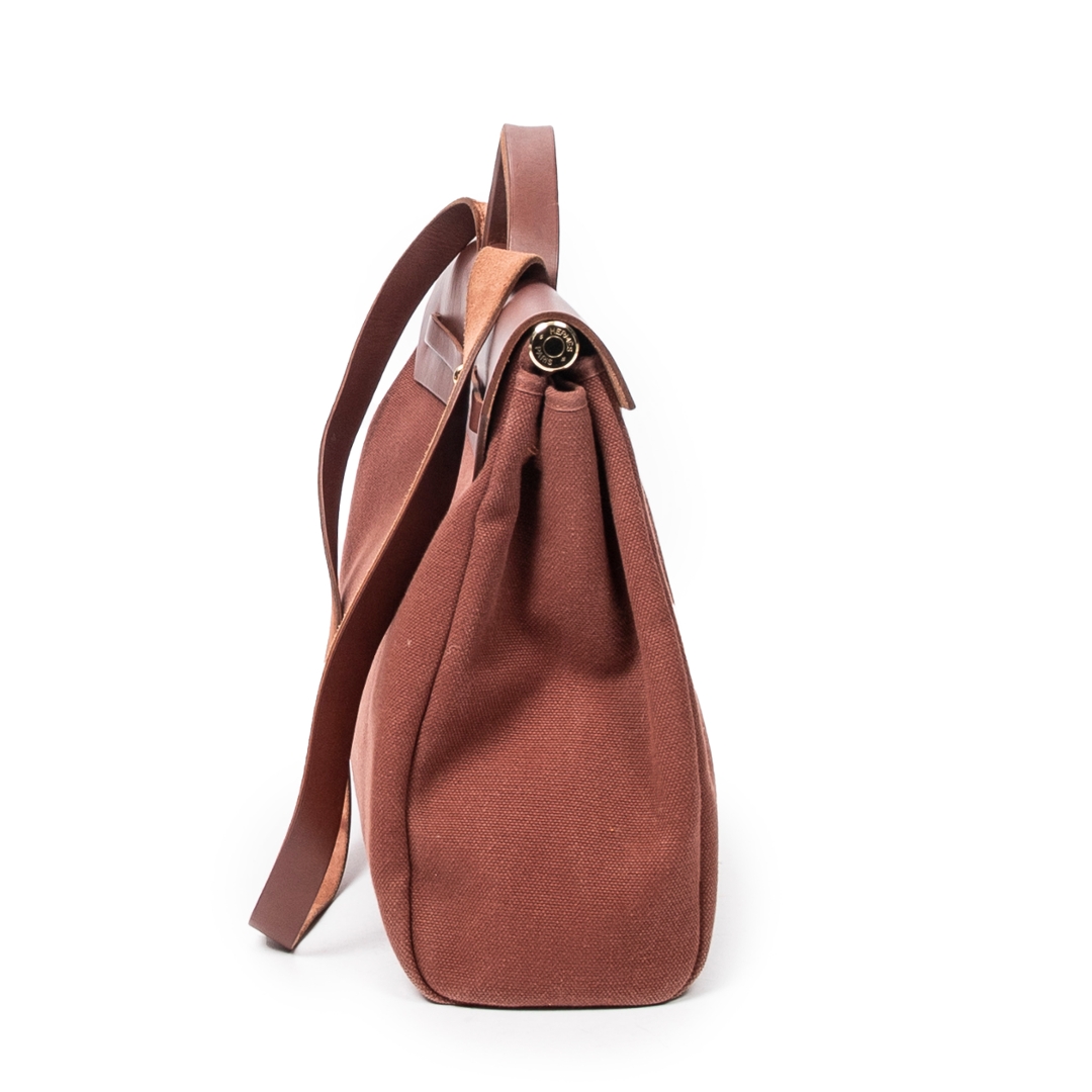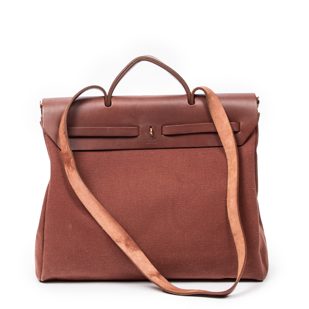 A vintage Hermes beige/brown canvas Herbag bag with a certificate of authenticity, Approx 38cm height, 39cm width.
