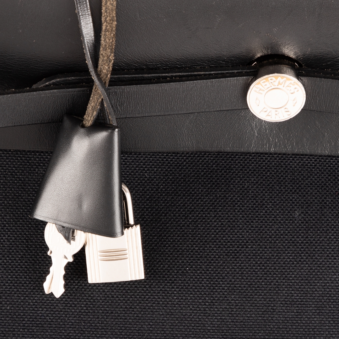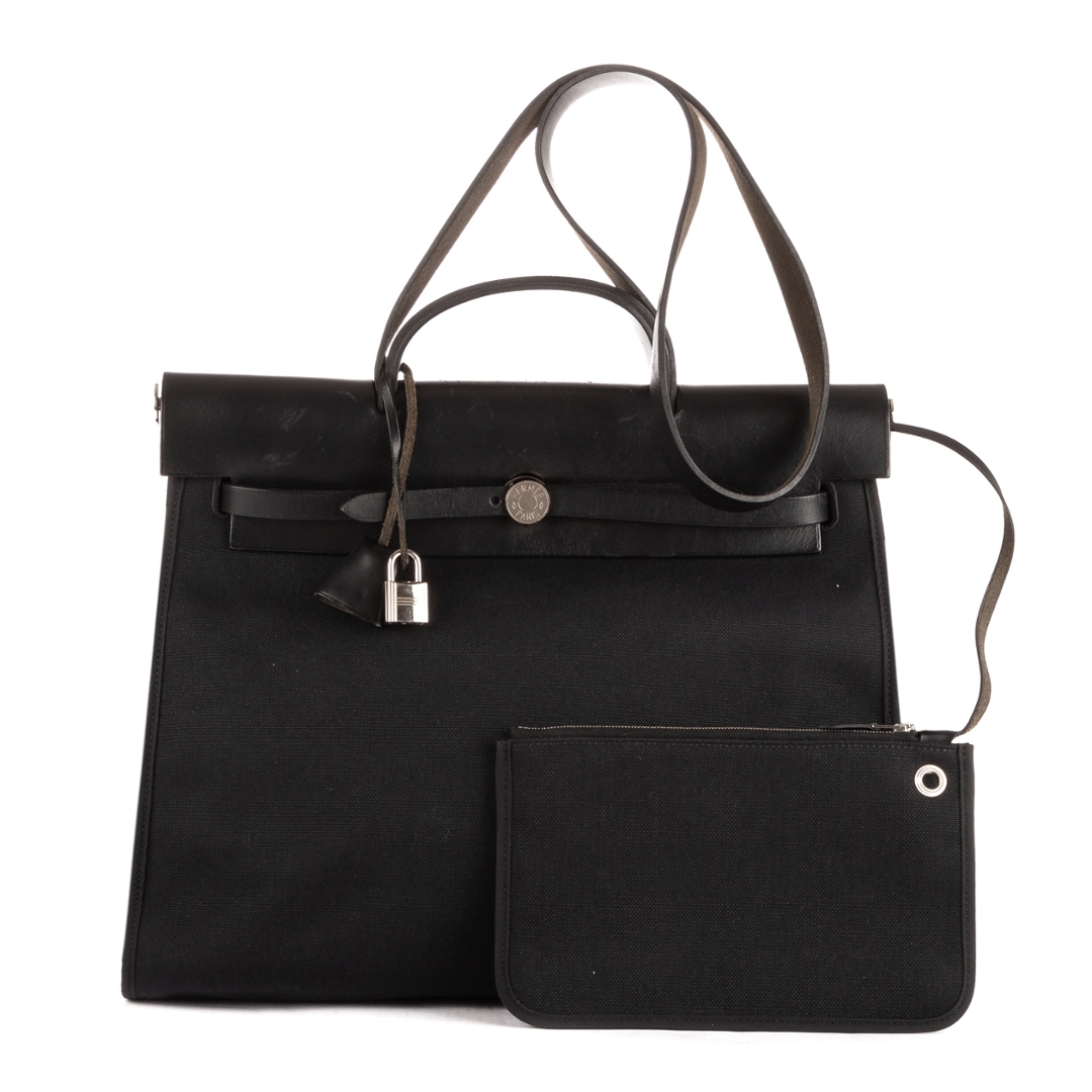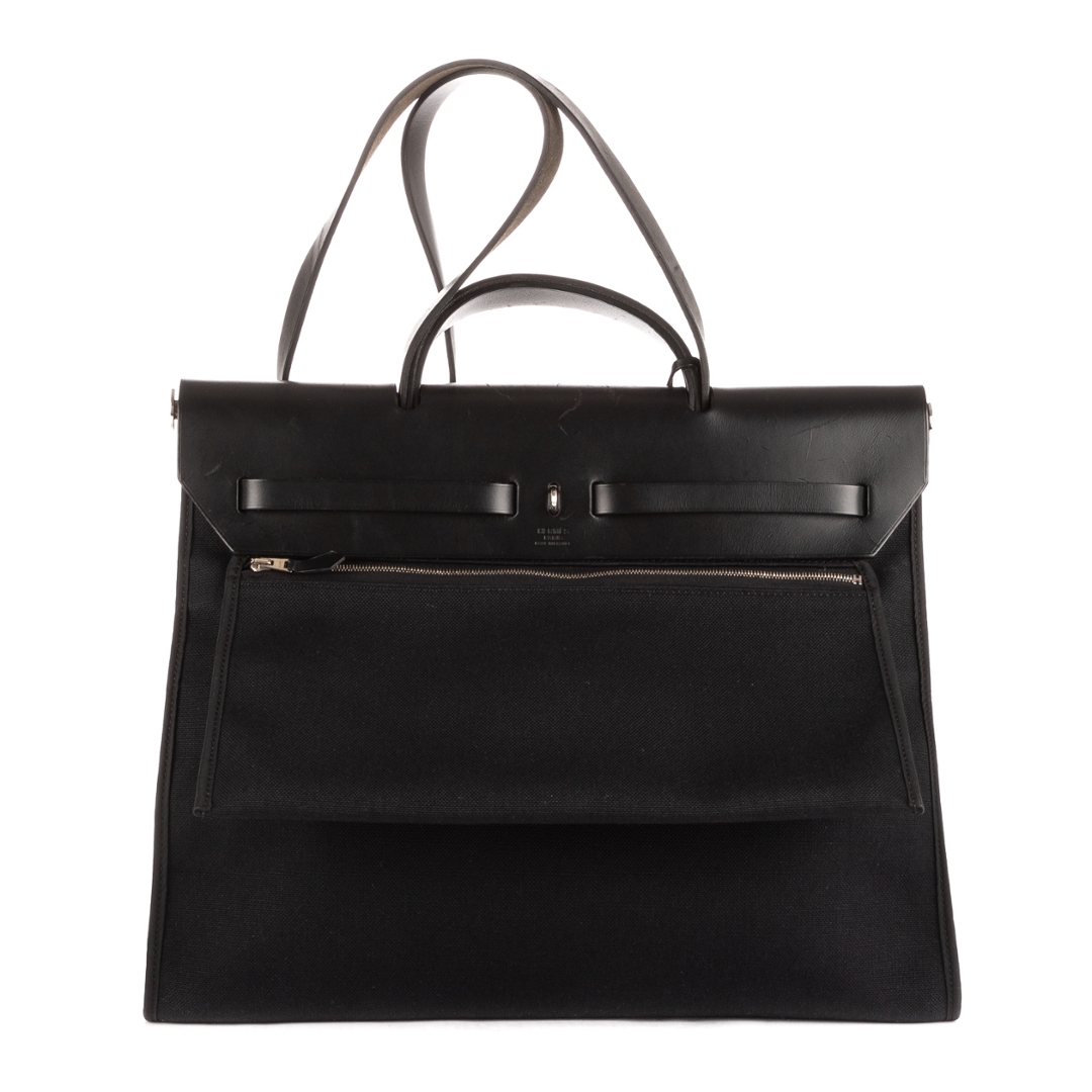 A vintage Hermes black canvas Herbag Zip bag with a certificate of authenticity, Approx 30cm height, 39cm width.