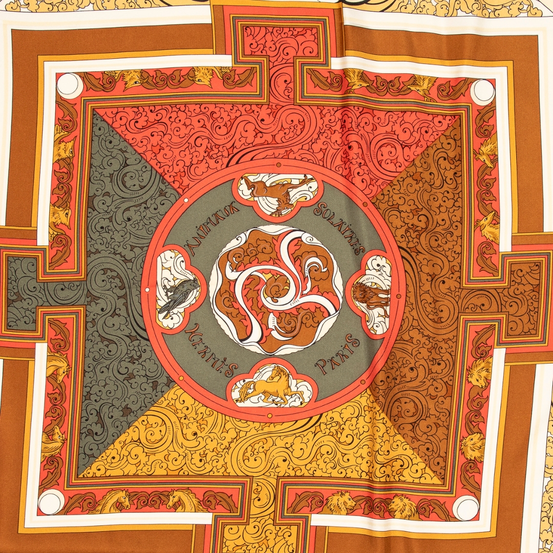 A vintage Hermes beige/brown silk Scarf with a certificate of authenticity, Approx 90cm height, 90cm width.