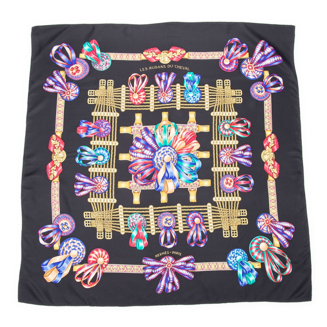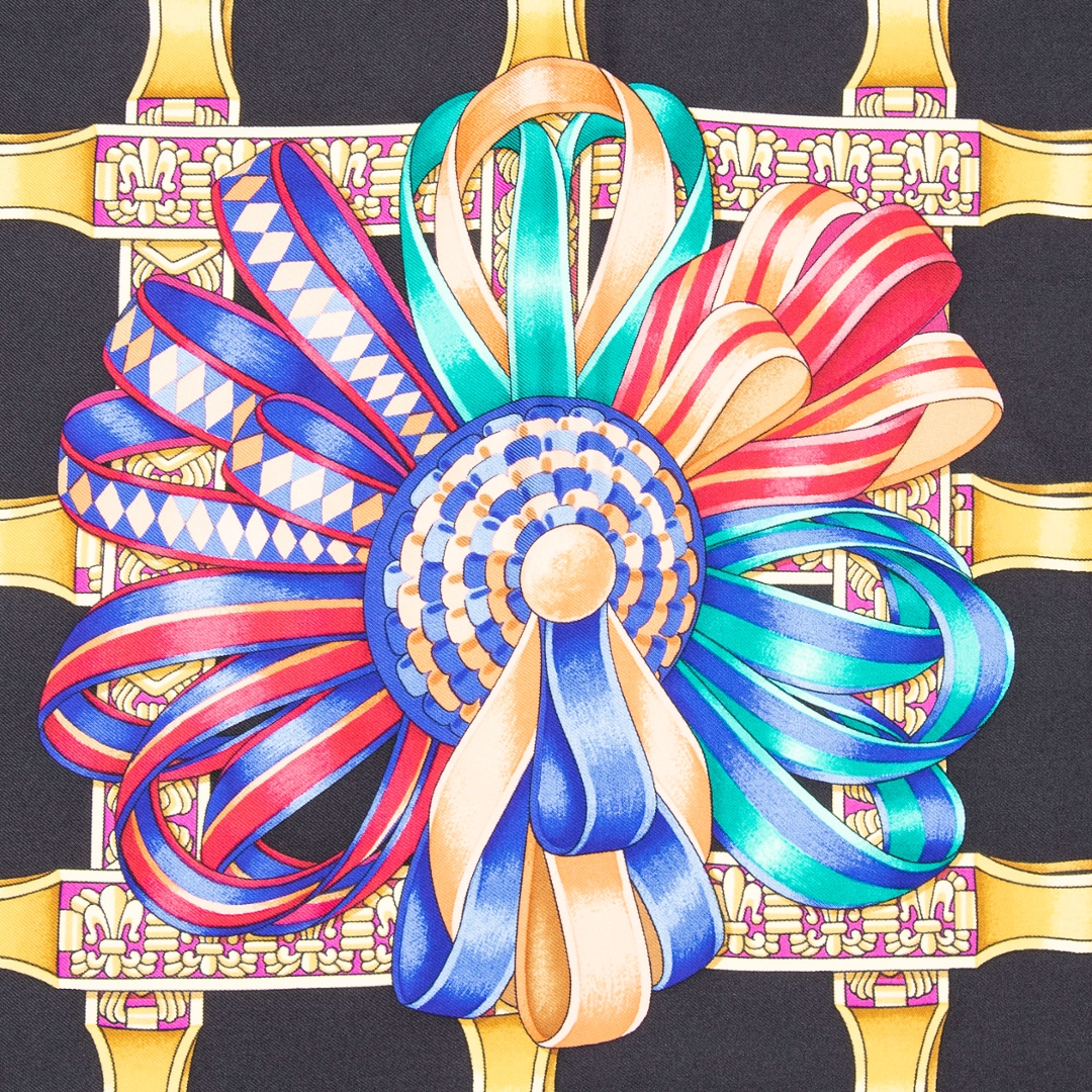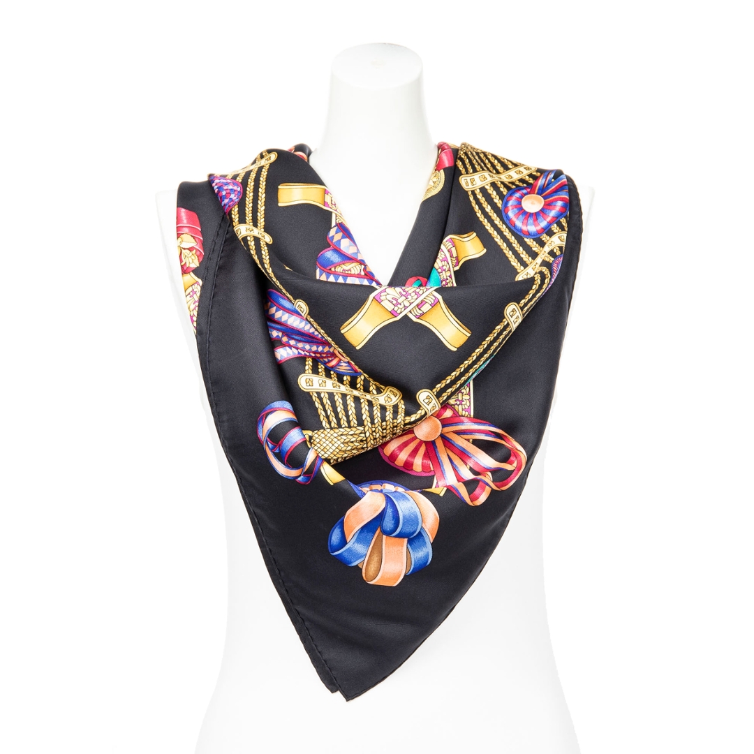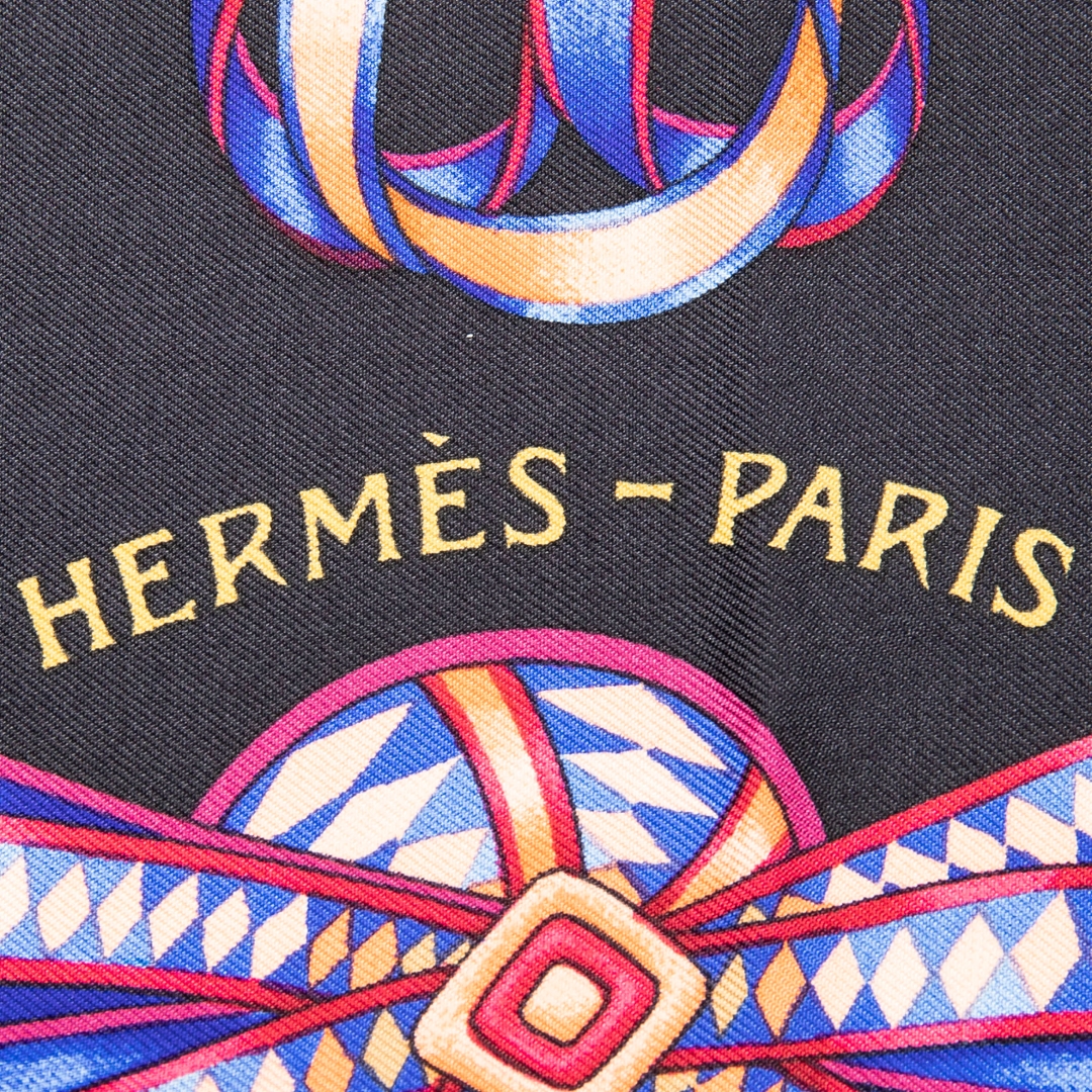 A vintage Hermès black and gold silk scarf for the collector who values timeless elegance and refined craftsmanship. Hermès scarves are renowned for their artistry and quality, and this striking example is no exception. The design features intricate motifs in gold with accents of red, blue, and purple, set against a deep black background that enhances the richness of the colours. It reflects the maison’s heritage of creating silk accessories that combine luxury with artistic expression.