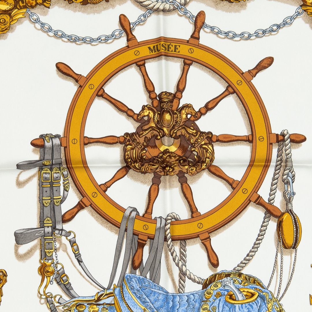 A vintage Hermès pink and gold silk scarf for the collector who values refined elegance and exceptional craftsmanship. Hermès is celebrated worldwide for its exquisite silk creations, and this piece beautifully showcases that heritage. The design features equestrian-inspired motifs in gold, silver, and soft blue tones, set against a crisp white background with a delicate pink border, creating a balanced and graceful composition.