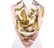Measuring approximately 90cm by 90cm, this scarf is ideally sized for multiple styling options. It can be worn draped around the neck, tied over the shoulders, or attached to a handbag for a touch of refined elegance. The smooth silk fabric enhances the richness of the colours while providing a lightweight and luxurious feel against the skin.