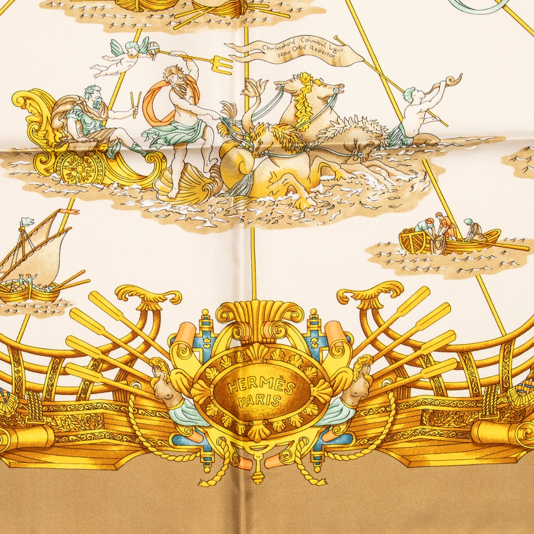 Accompanied by its certificate of authenticity, this Grade AA example is in excellent condition, showing only the lightest signs of careful use. A true collector’s piece, the Hermès gold and beige silk scarf combines artistry, luxury, and functionality, making it a highly desirable addition for fashion enthusiasts and collectors alike.