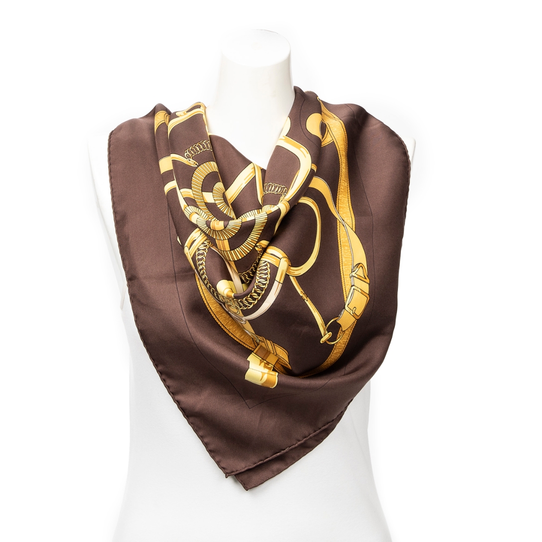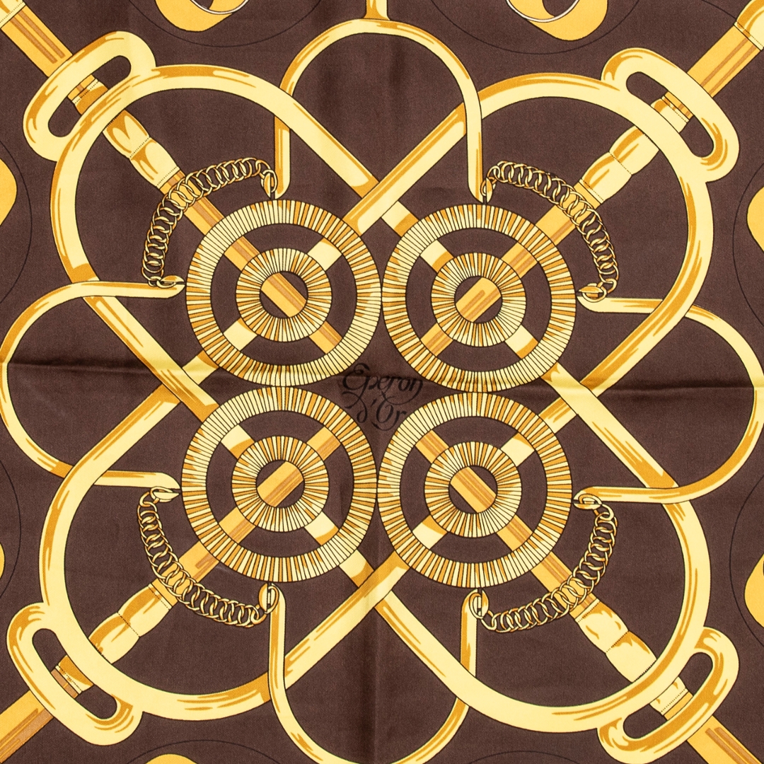 A vintage Hermes dark brown/gold silk Scarf with a certificate of authenticity, Approximately 90cm height, 90cm width.