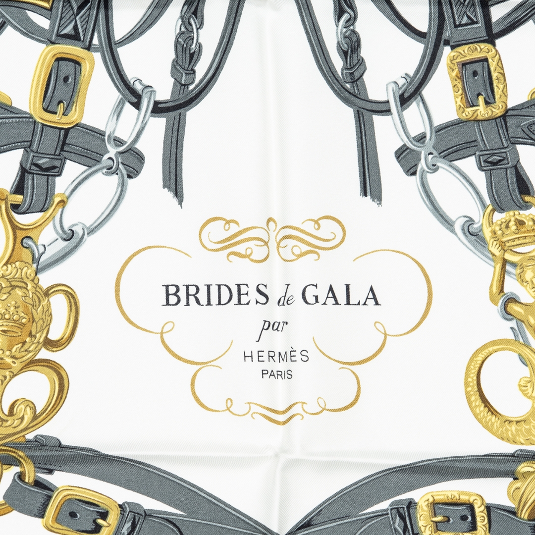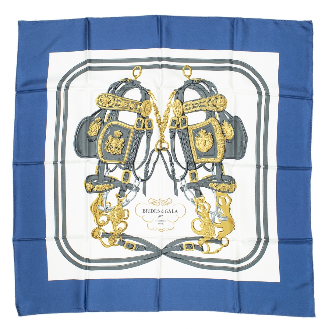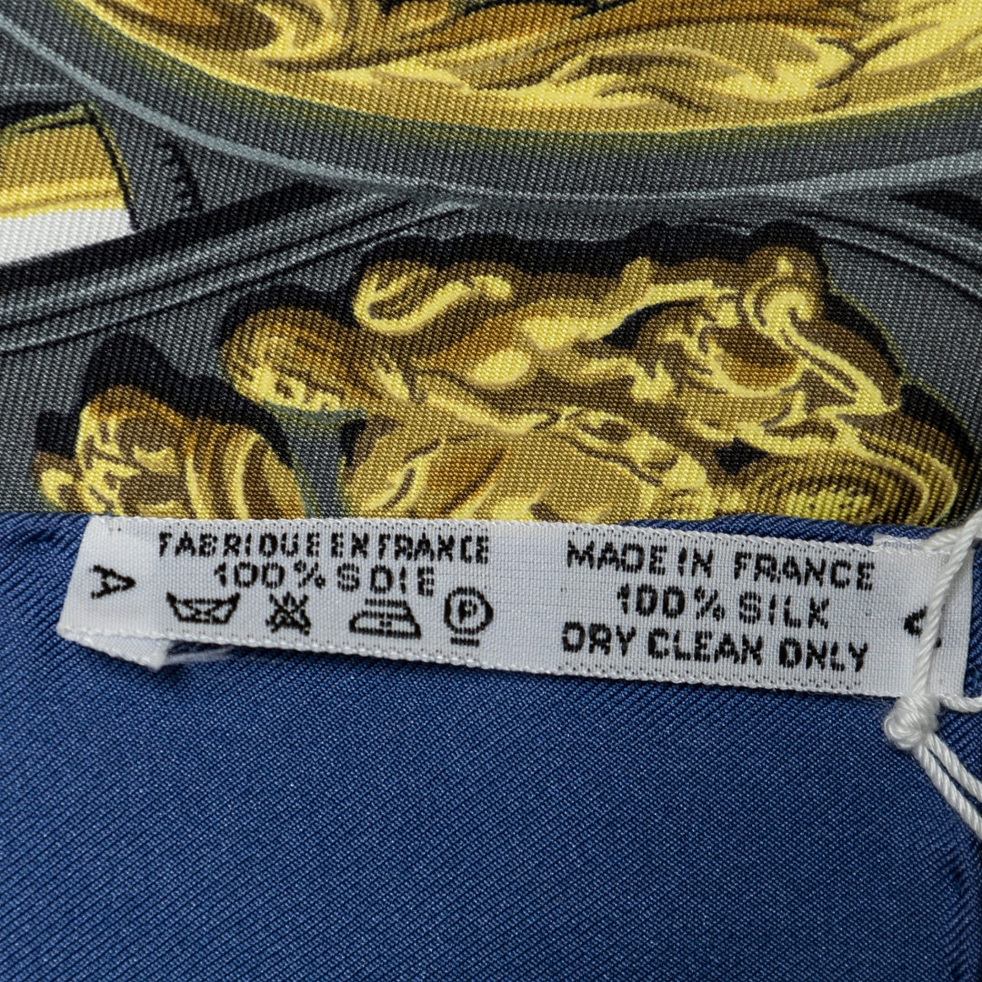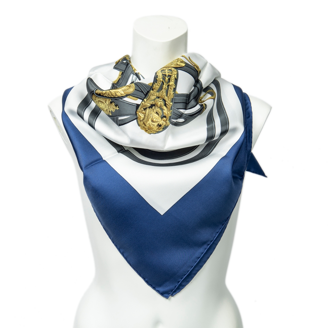 A vintage Hermes blue/white silk Scarf with a certificate of authenticity, Approximately 90cm height, 90cm width.