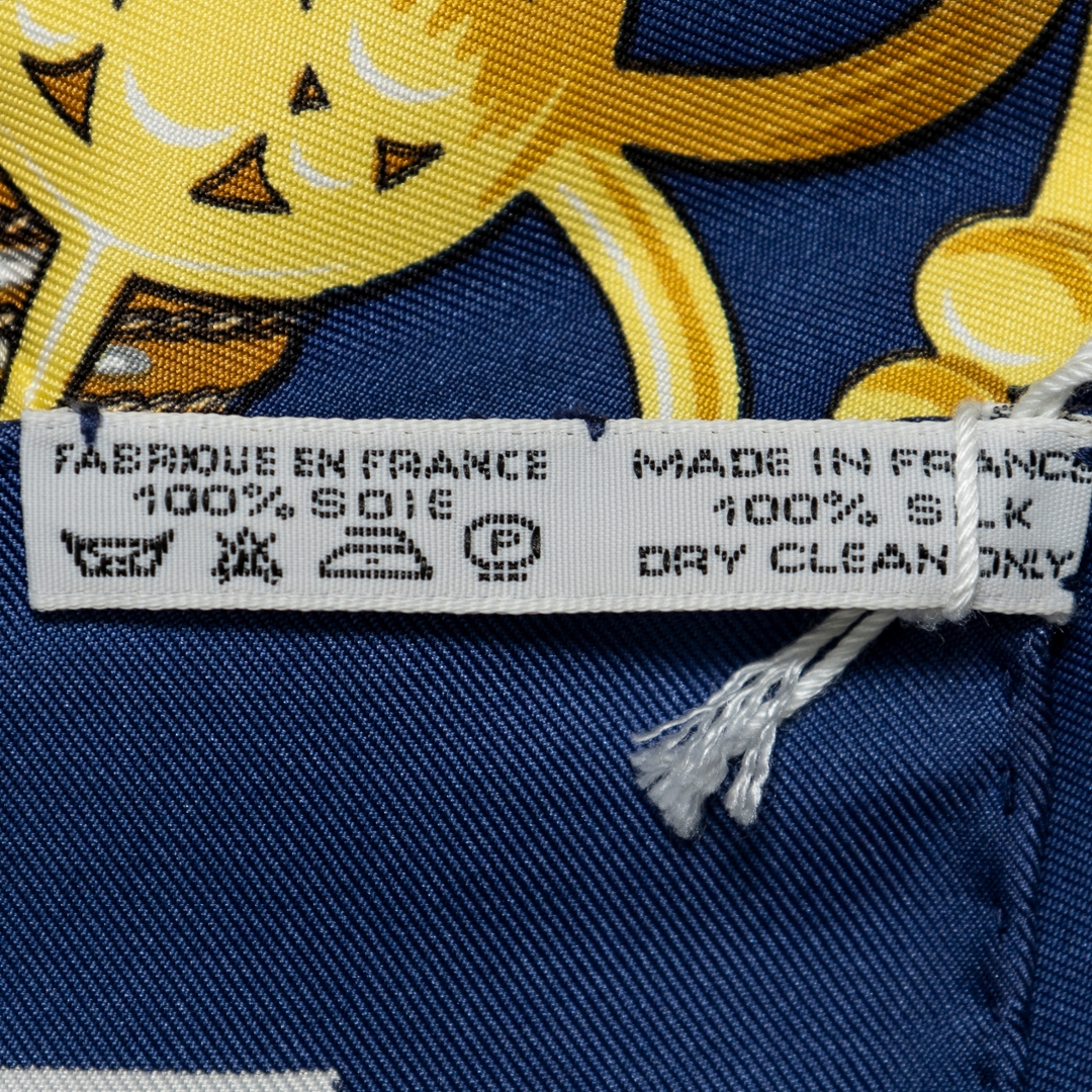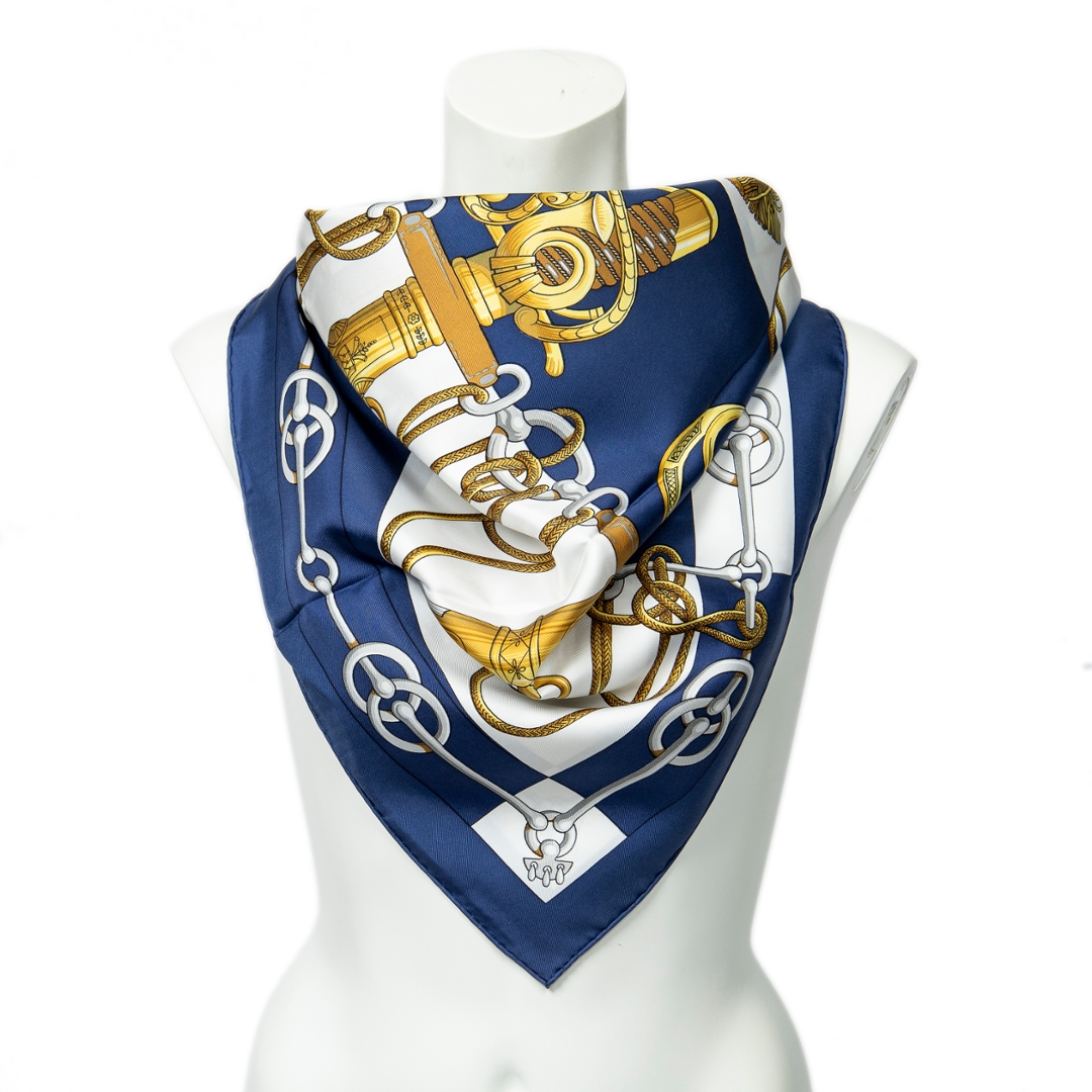 A vintage Hermes navy/white silk Scarf with a certificate of authenticity, Approximately 90cm height, 90cm width.