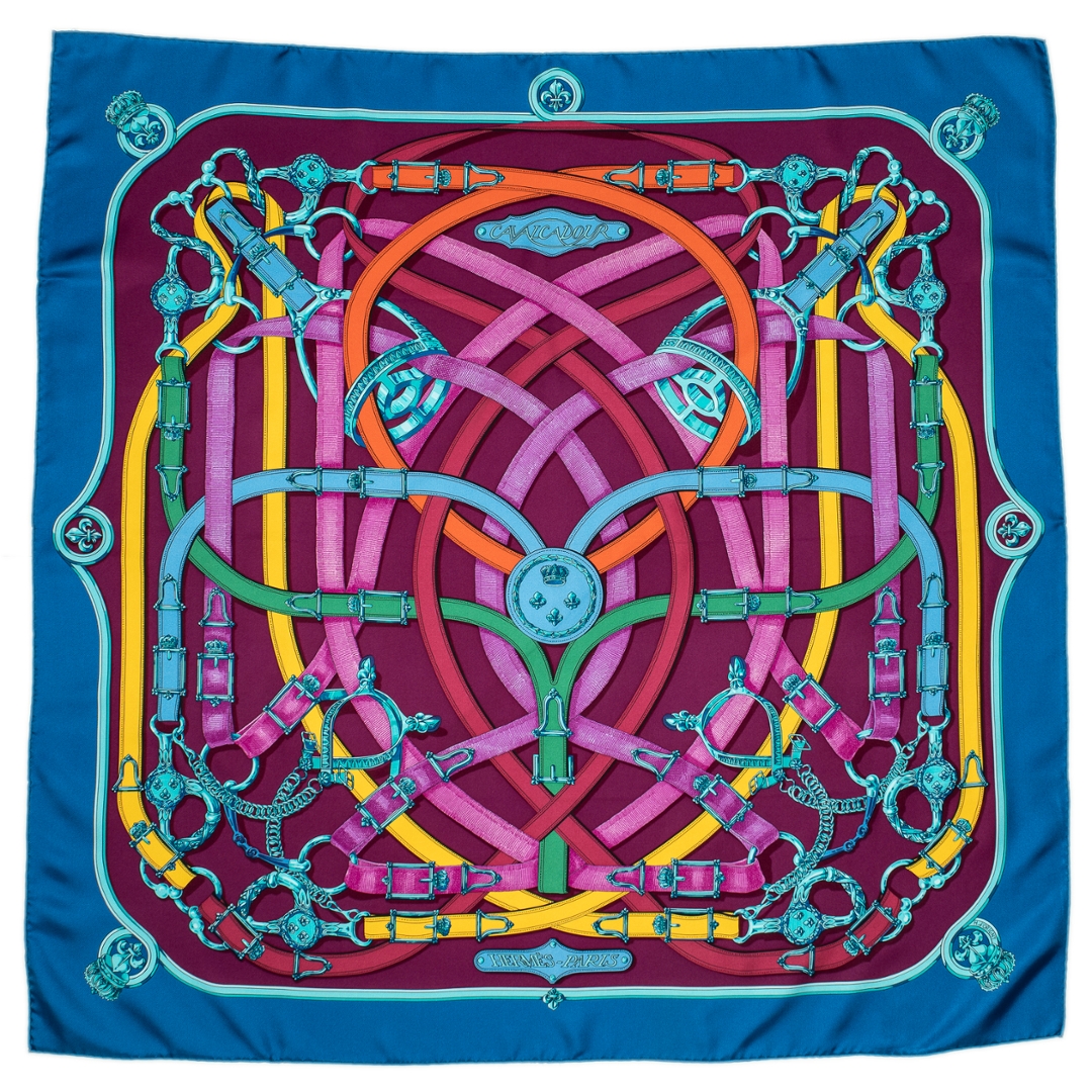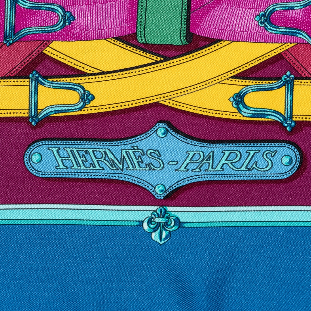 A vintage Hermes blue/pink silk Scarf with a certificate of authenticity. Approximately 90cm height, 90cm width.