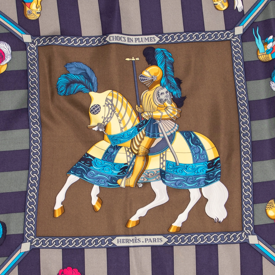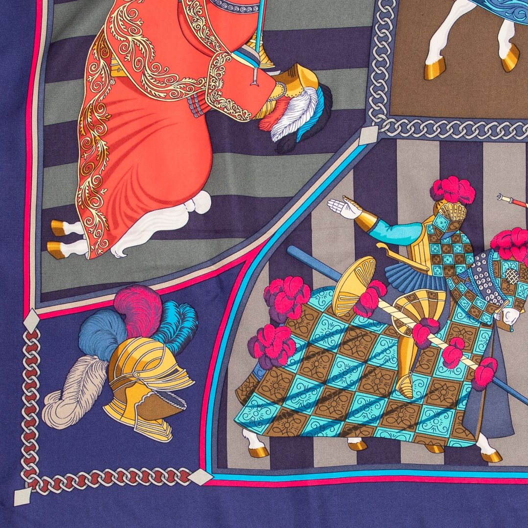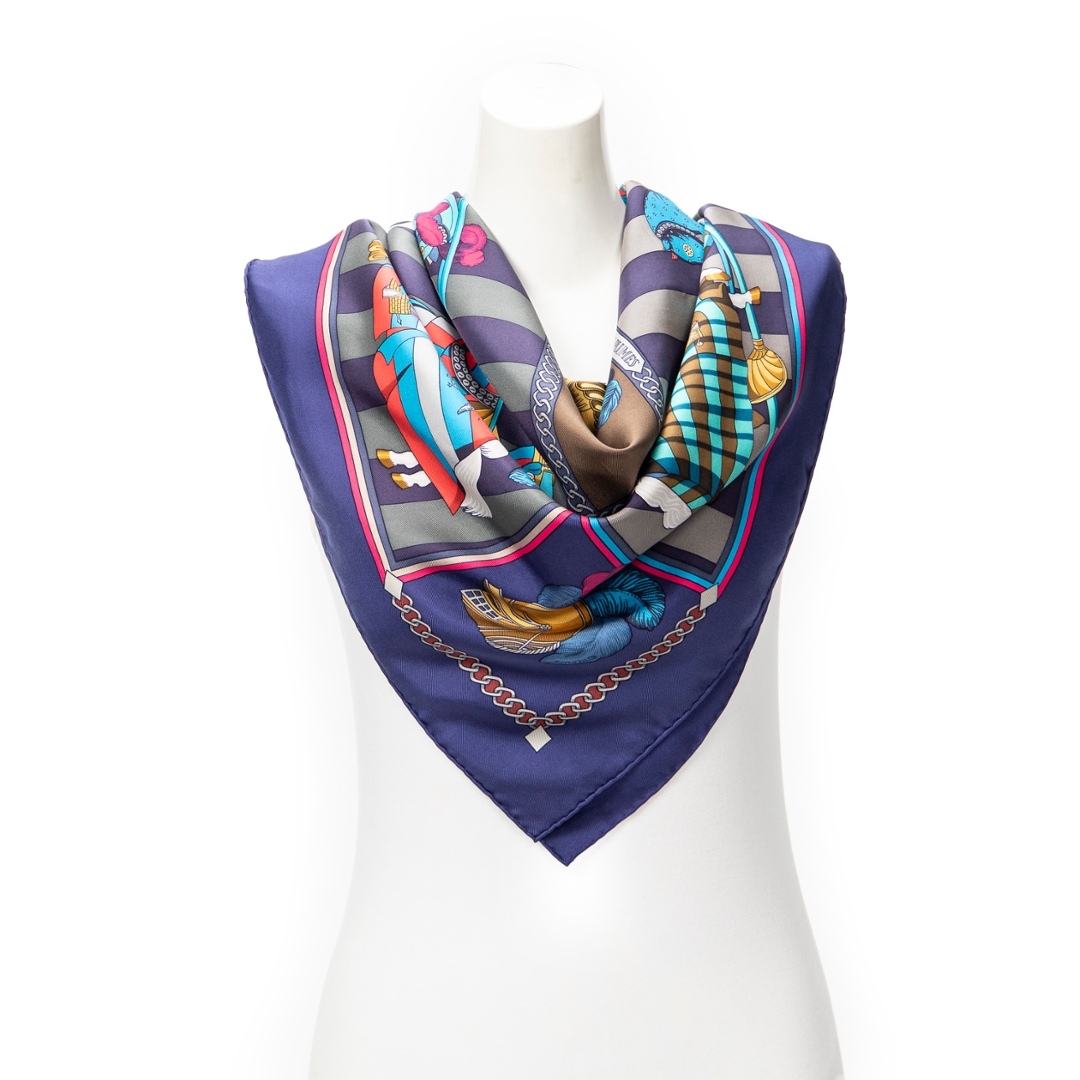A vintage Hermes navy/grey silk Scarf with a certificate of authenticity. Approximately 90cm height, 90cm width.