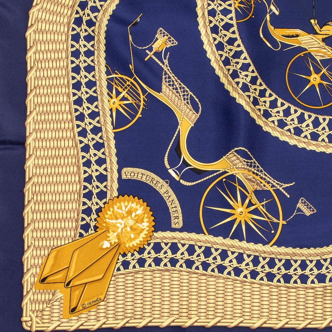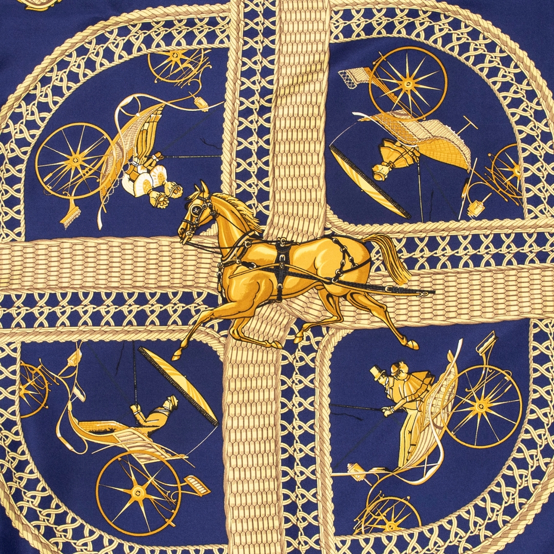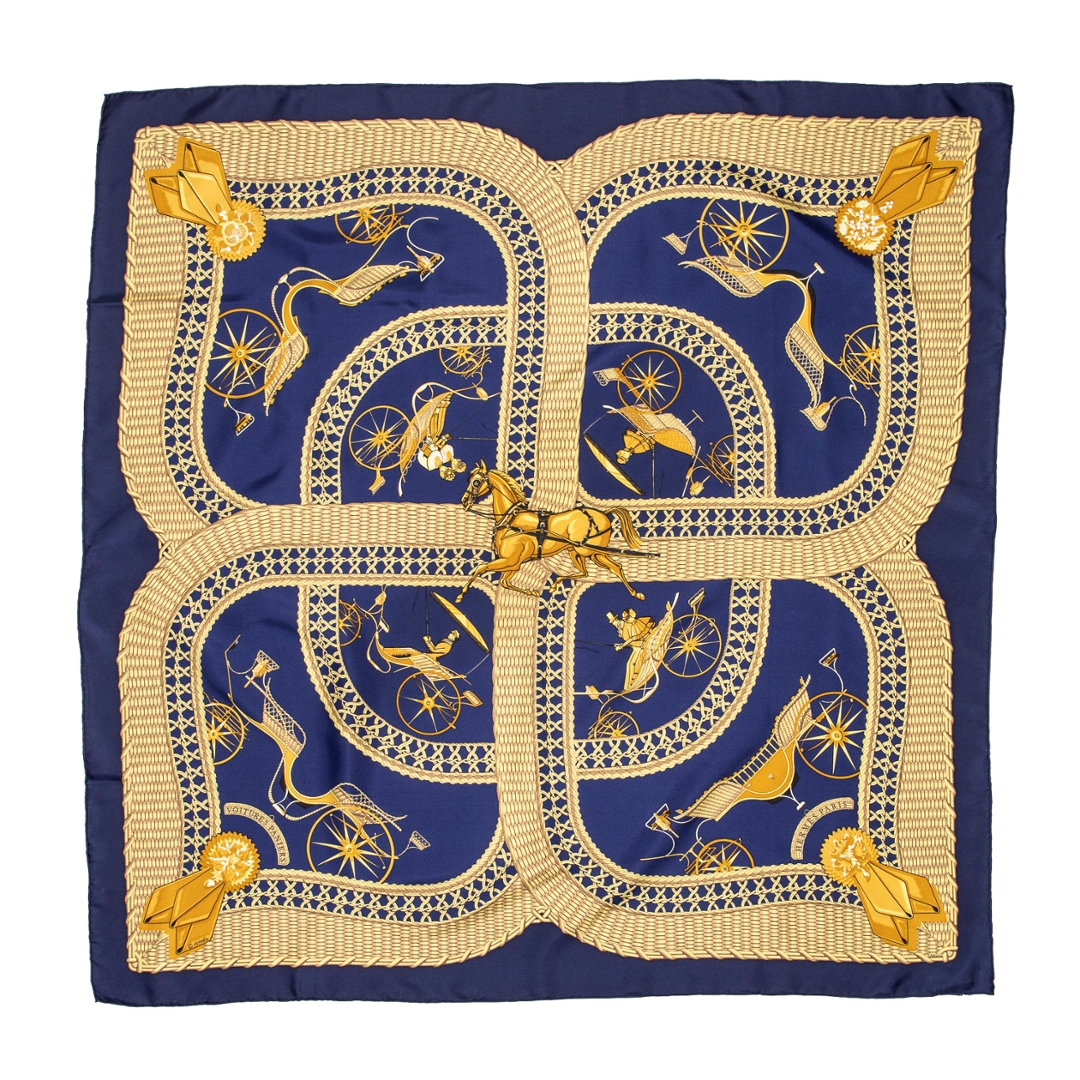 A vintage Hermes navy/gold silk Scarf with a certificate of authenticity. Approx 90cm height, 90cm width.