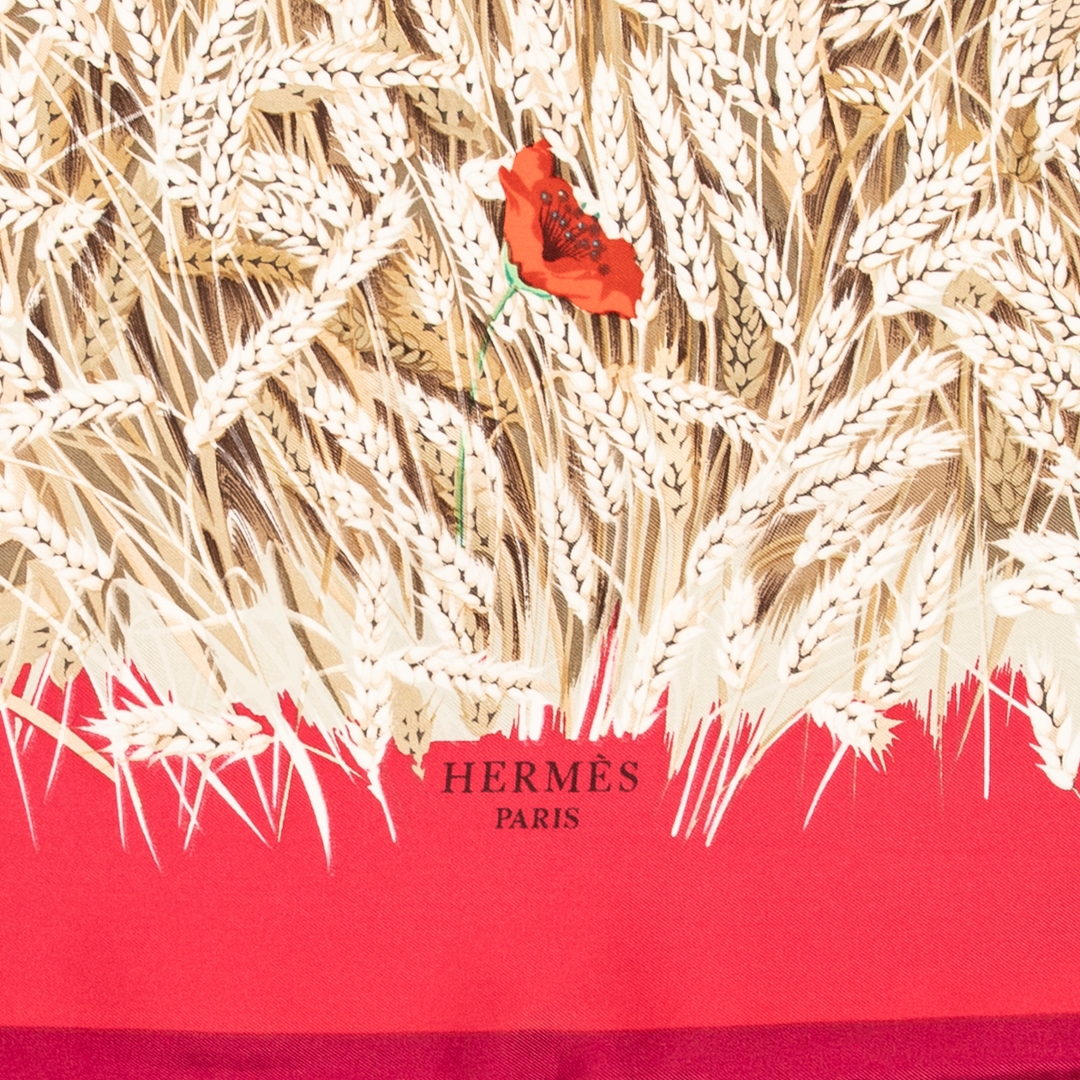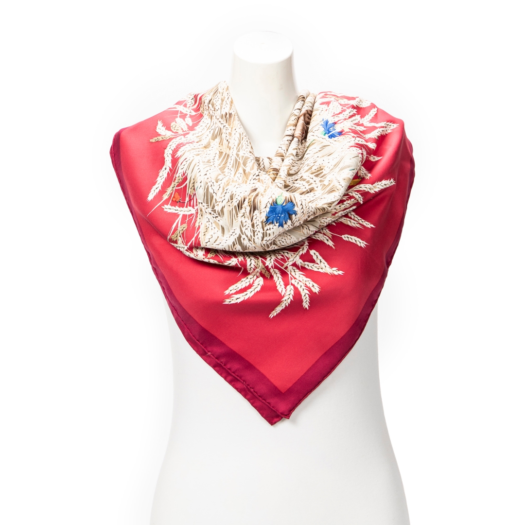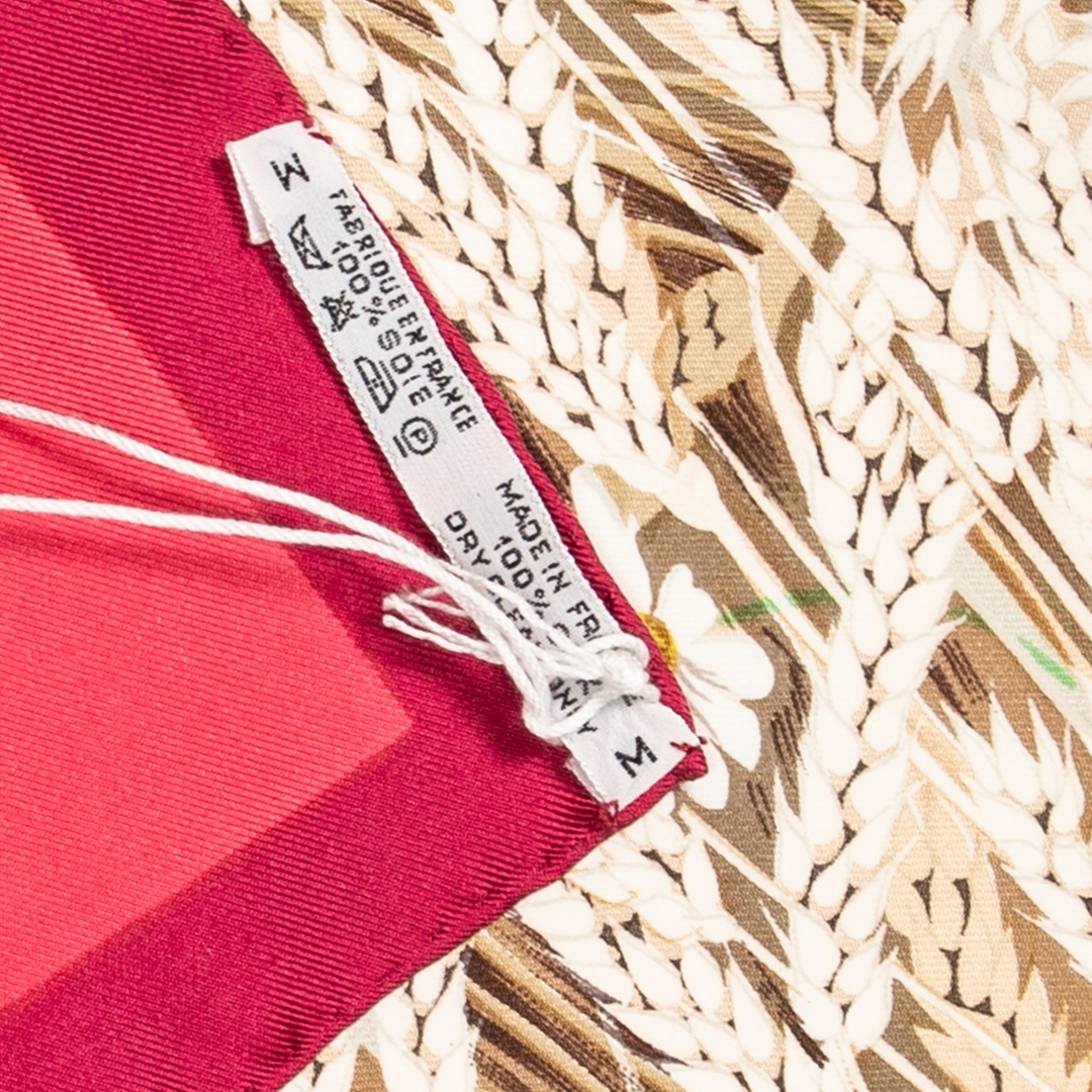A vintage Hermès silk scarf presented in a rich maroon and beige colourway, beautifully accented with delicate botanical detailing. Crafted from luxurious silk, this carré showcases an elegant wheat and floral motif, brought to life with subtle blue highlights that add depth and visual interest against the warm-toned background.
