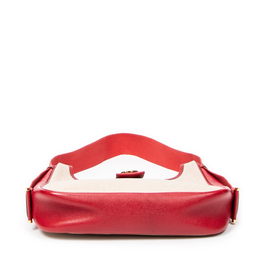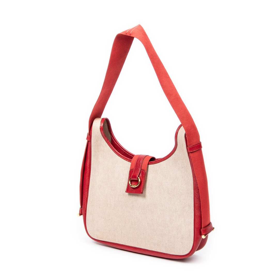 A vintage Hermès Tsako bag crafted in beige coated canvas, elevated by striking red leather trim and matching shoulder strap. This distinctive design showcases Hermès’ refined balance of casual elegance and practical luxury, with the structured silhouette complemented by smooth leather accents and a signature front strap detail with gold-tone hardware.