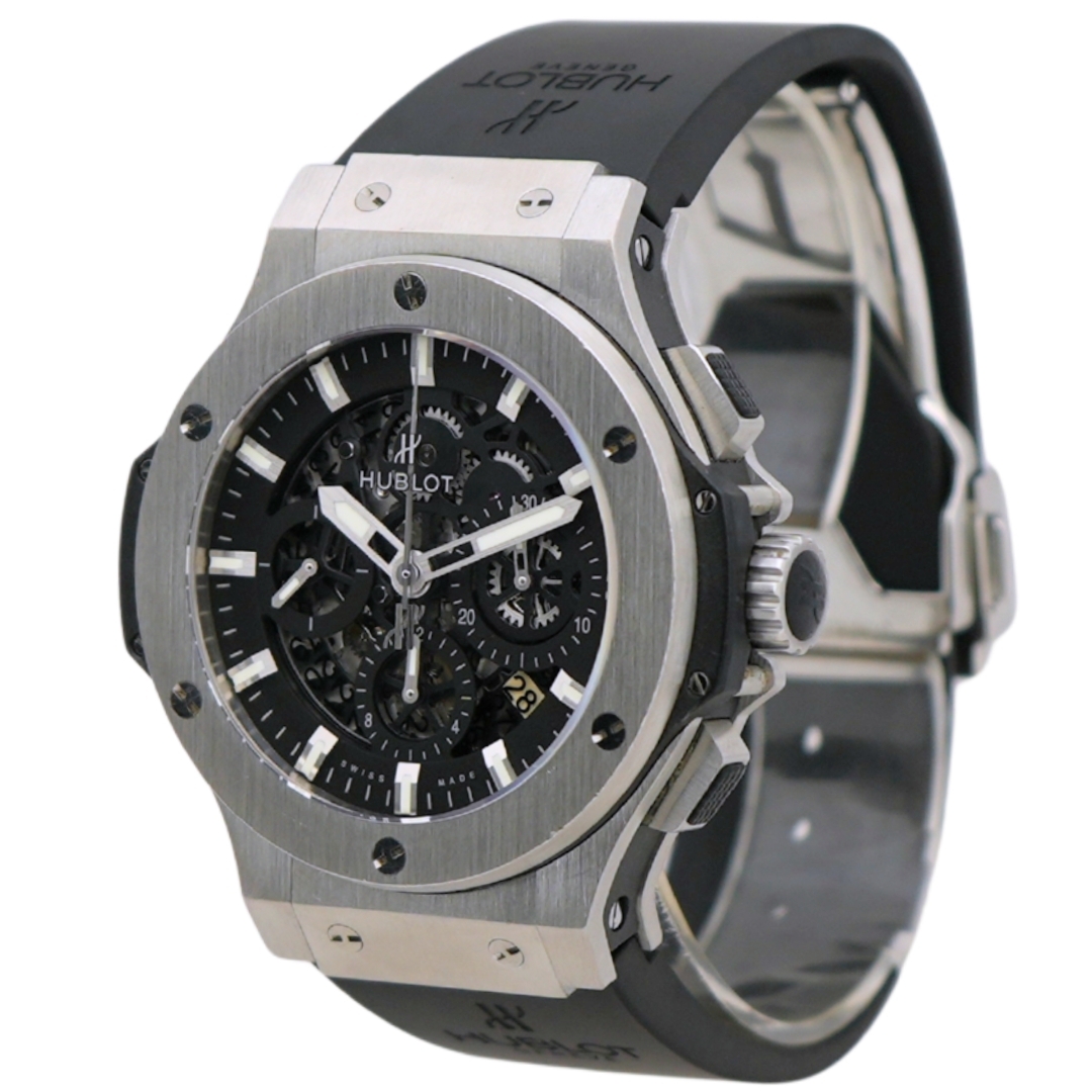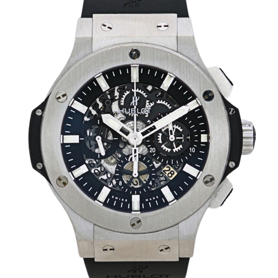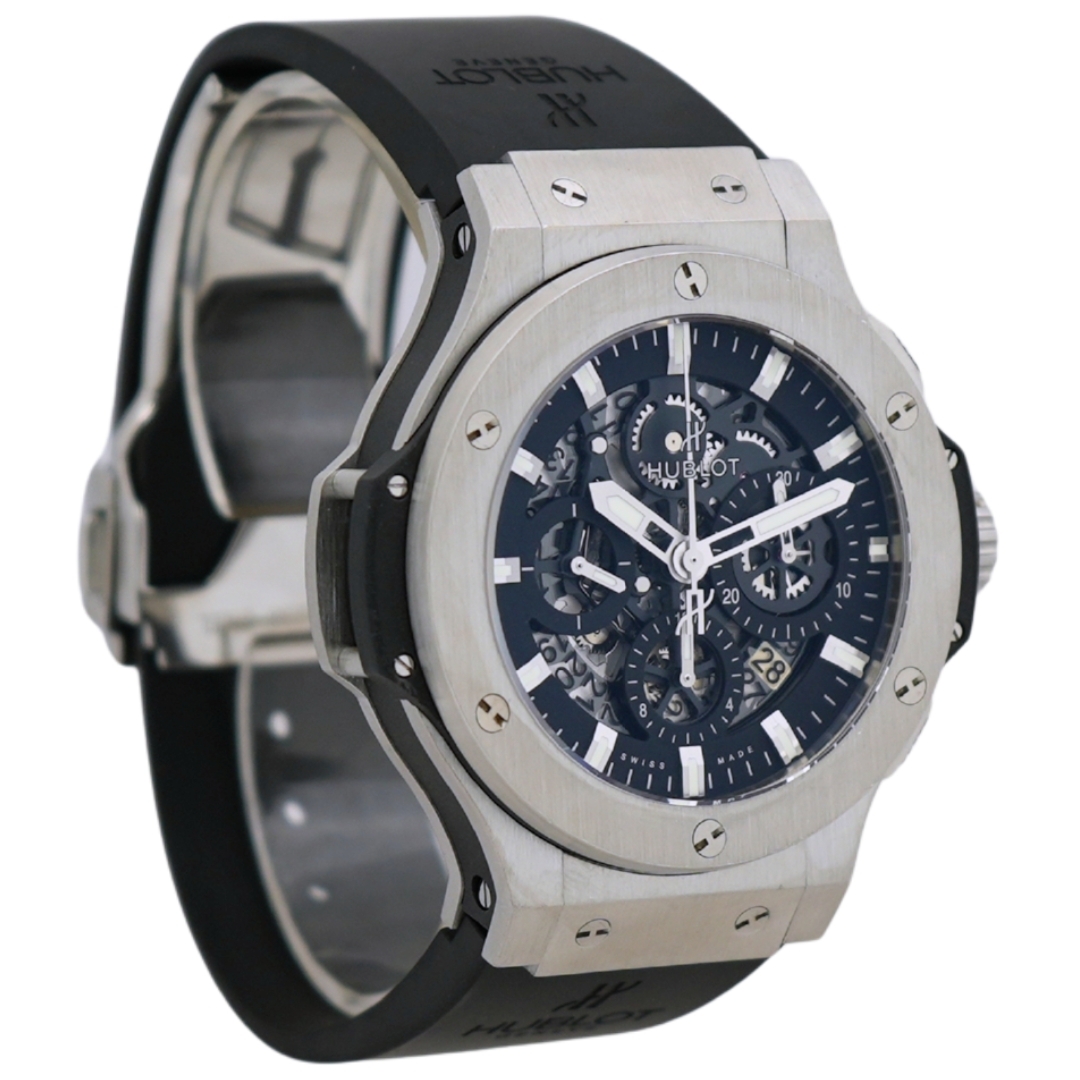 Powered by the Hublot Calibre HUB4214 automatic movement, the Aero Bang delivers chronograph functionality, a 42-hour power reserve, and striking mechanical aesthetics visible through both the dial and sapphire crystal caseback. The watch also features a fixed bezel secured by Hublot’s signature titanium screws, a screw-down crown, and a lightweight yet robust construction suited for both everyday wear and statement occasions.