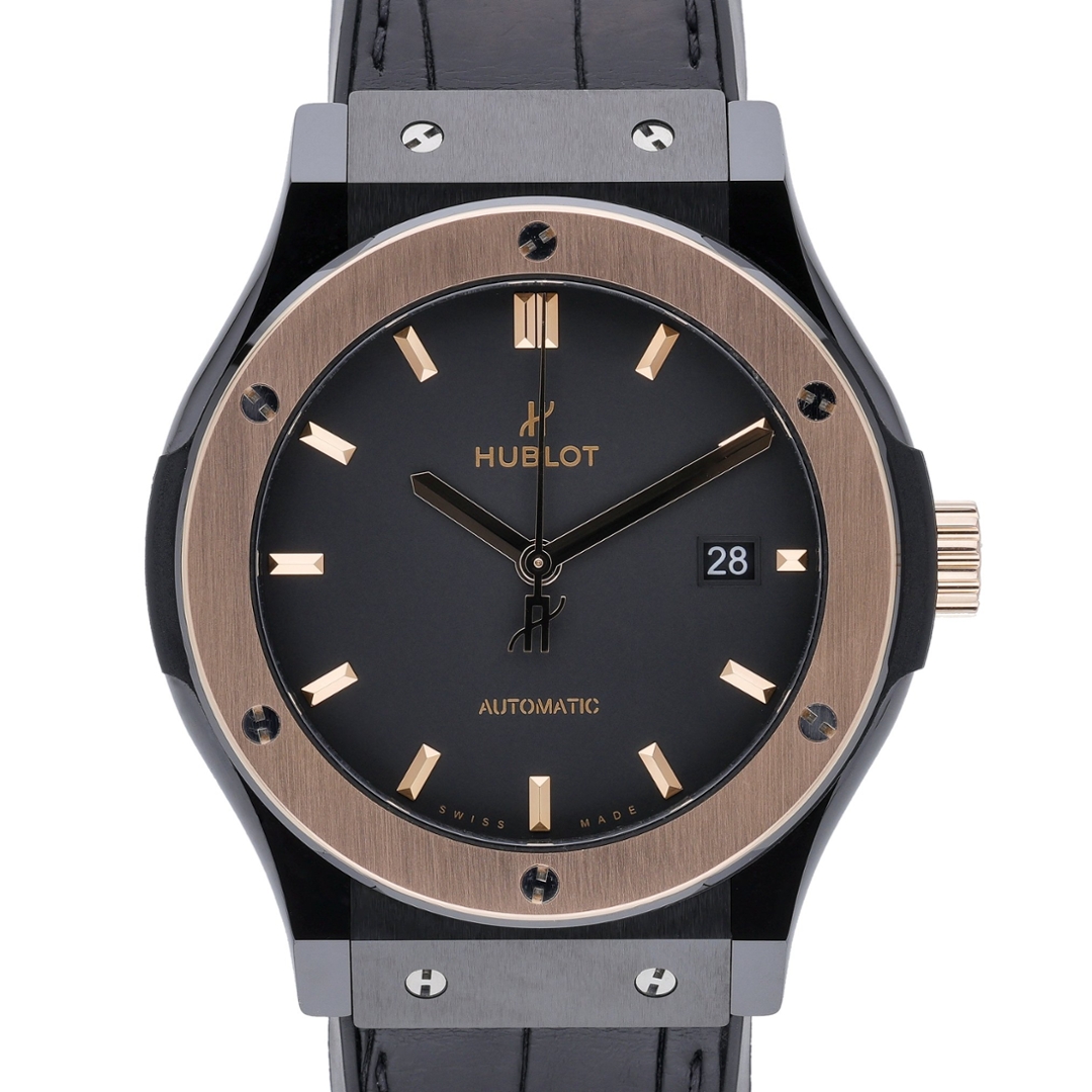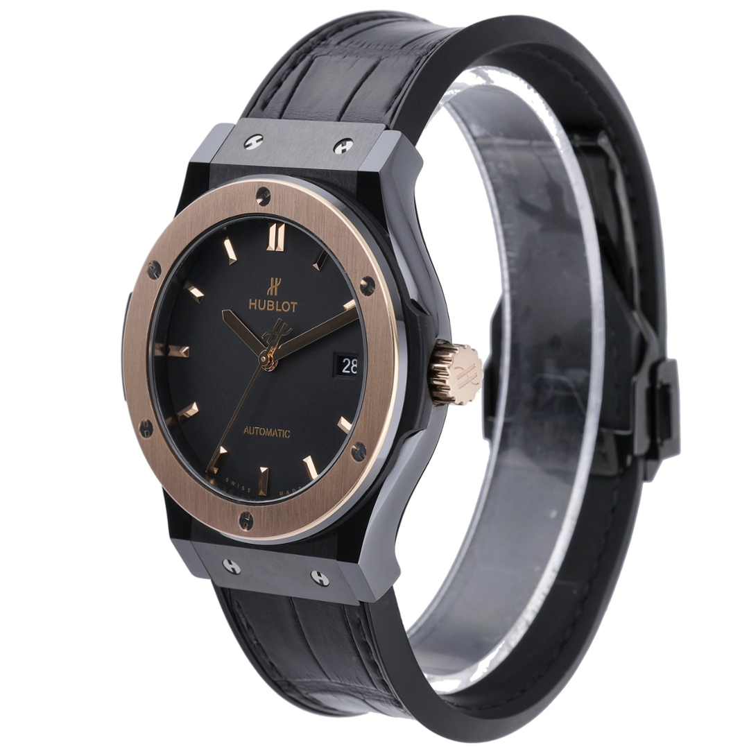 A Hublot Classic Fusion, reference 542.CO.1181.RX, representing the perfect balance of contemporary design and refined craftsmanship. This 42mm model combines a striking black ceramic case with an 18ct King Gold bezel, creating a bold yet sophisticated contrast that defines Hublot’s iconic fusion philosophy. The matte black dial, accented with gold hour markers and hands, exudes understated elegance, while the discreet date aperture at 3 o’clock adds practical functionality.